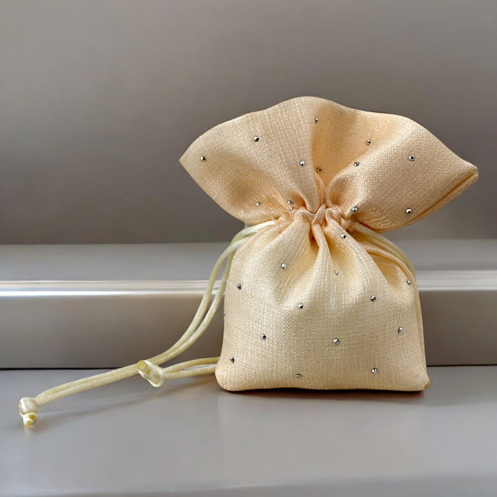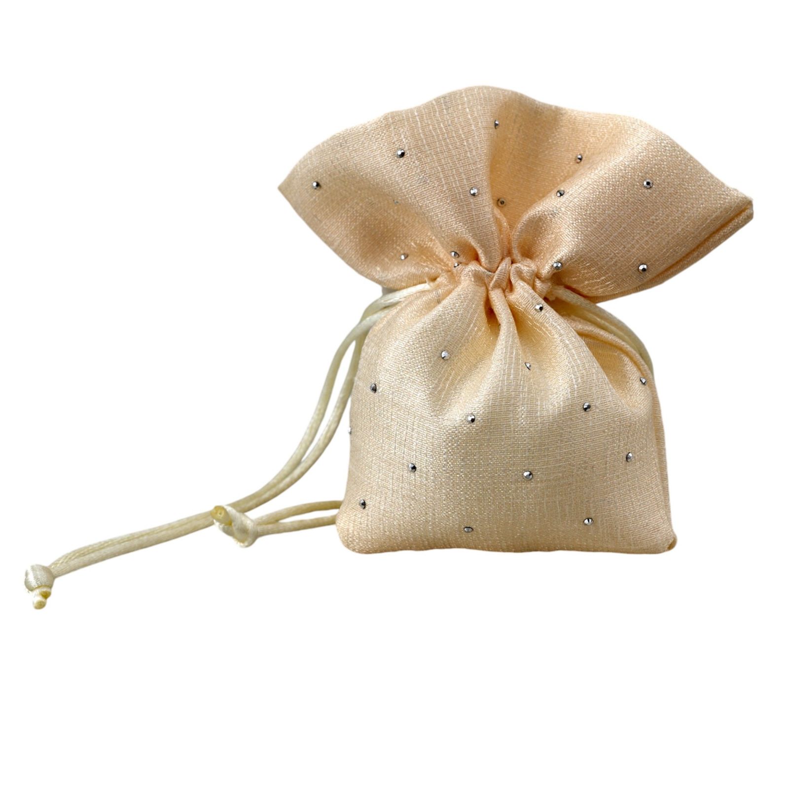 Realizzati in pregiato raso color panna, questi sacchettini sono ideali per eventi come comunione, cresima, anniversario e matrimonio. Le dimensioni di 12 x 12 cm li rendono perfetti per contenere confetti o piccoli regali.