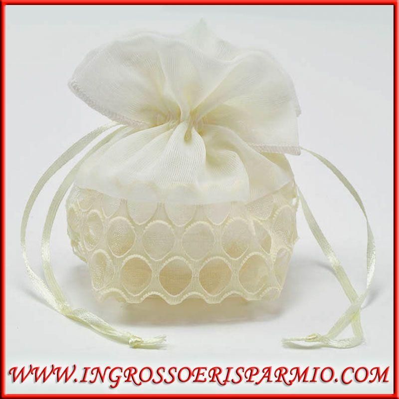 Sacchetto organza traforato panna con tiranti laterali in raso, dalla forma un po' bombata, data dalla base tonda del sacchetto. La parte superiore è completamente in organza, tessuto elegante e delicato, mentre la parte sottostante è costituita da un doppio strato di tulle e tessuto traforato, che rende questi portaconfetti originali.