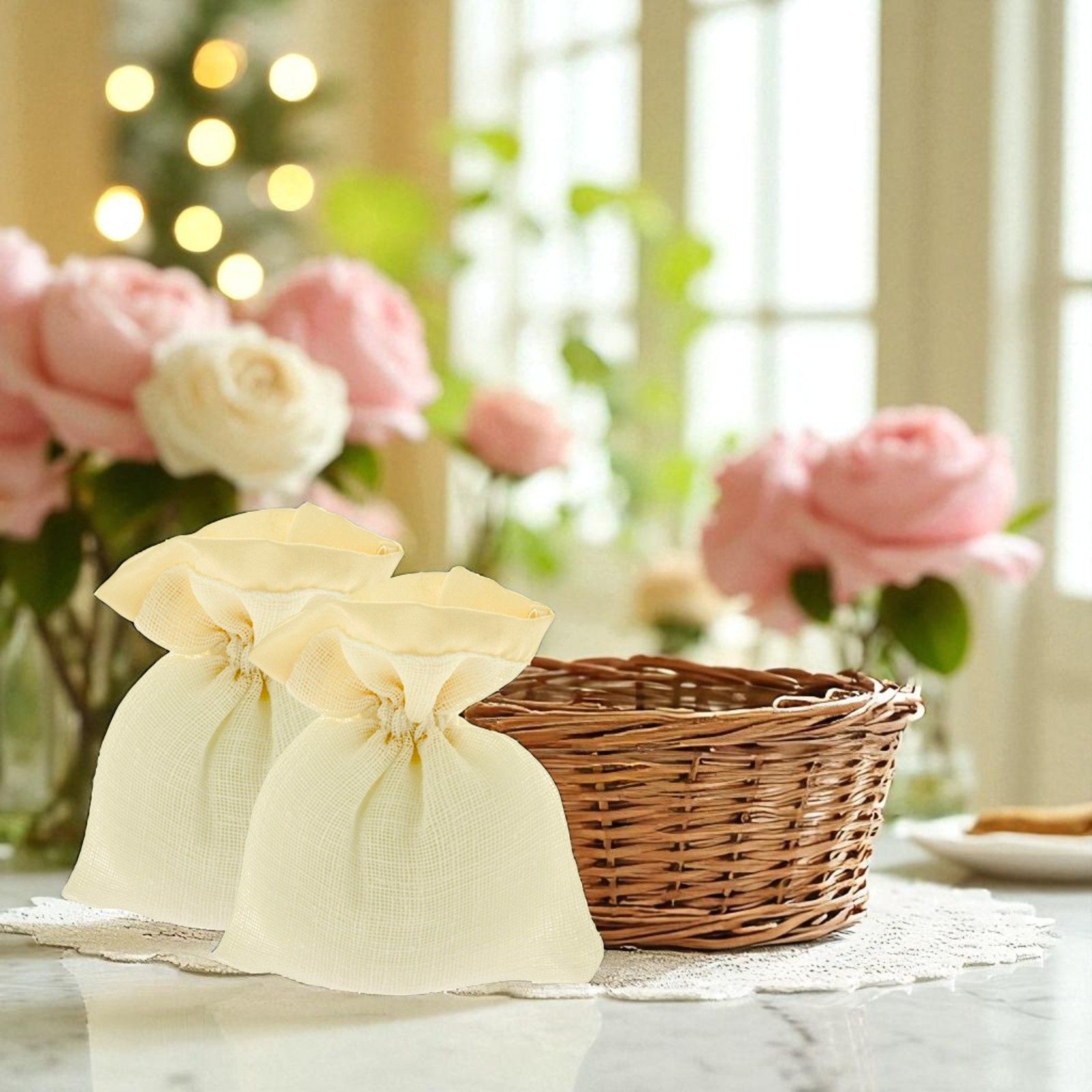 Pratico ed elegante, questo sacchettino portaconfetti in juta color panna con bordino beige è la soluzione perfetta per chi ama il gusto naturale e lo stile rustico chic. Dotato di comodi tiranti, è ideale per contenere confetti con semplicità e raffinatezza durante matrimoni, comunioni, cresime o anniversari.