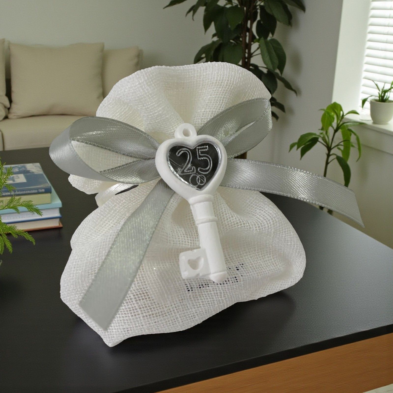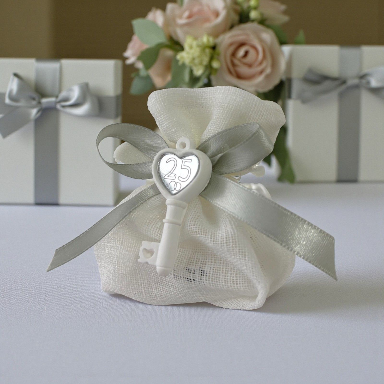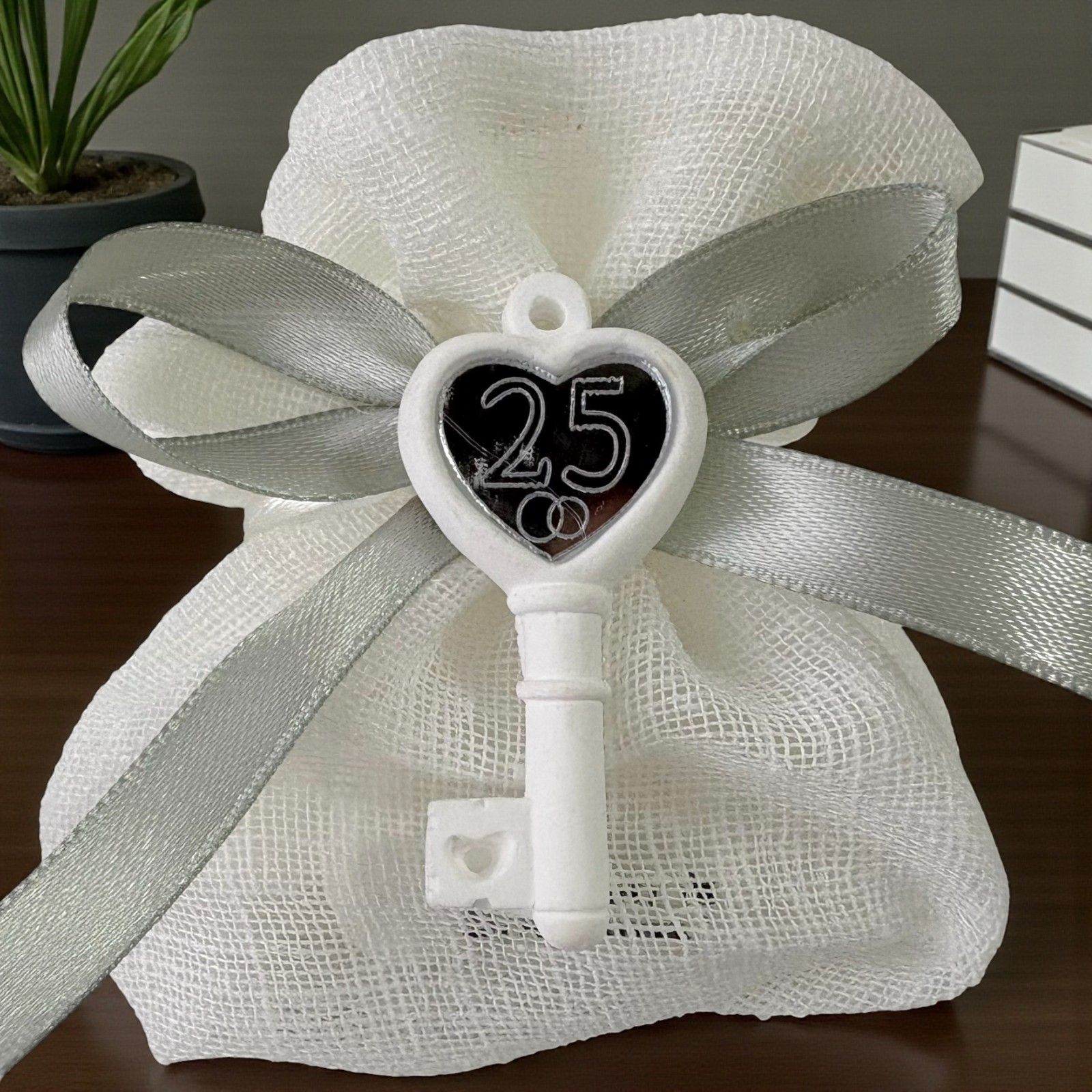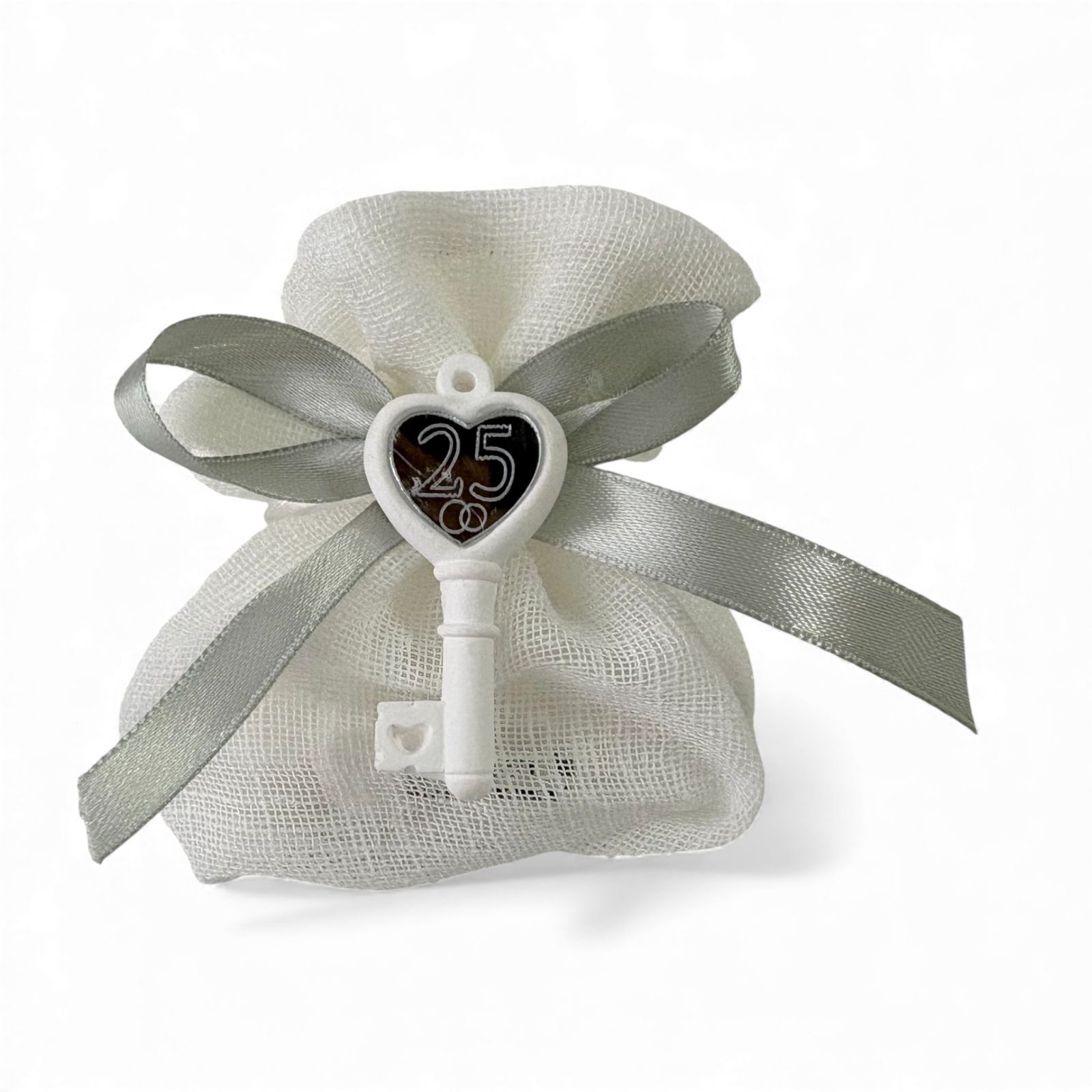 Ogni anniversario rappresenta un capitolo speciale della vostra storia, e le bomboniere sono il segno tangibile di questo legame unico. Il nostro sacchettino portaconfetti con chiave, arricchito da due fedi nunziali e il numero 25, è pensato per celebrare le nozze argento con un tocco di eleganza e significato. Un regalo che parla di amore, di ricordi e di promesse rinnovate, perfetto per condividere con amici e parenti.
