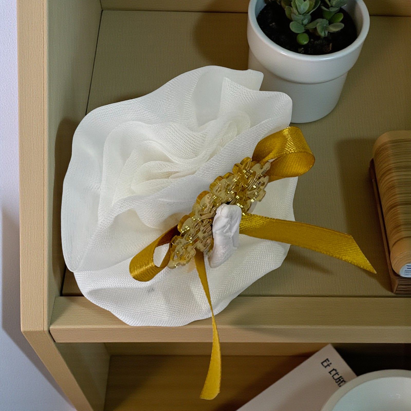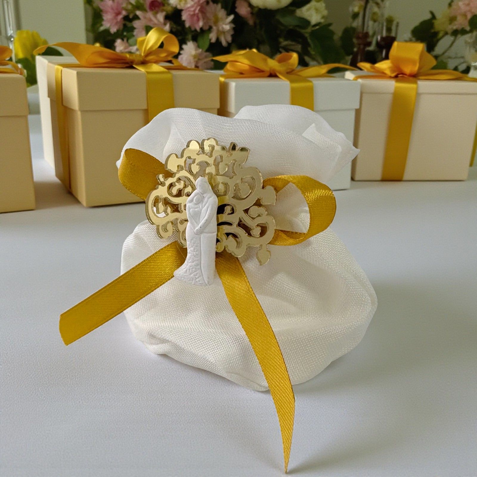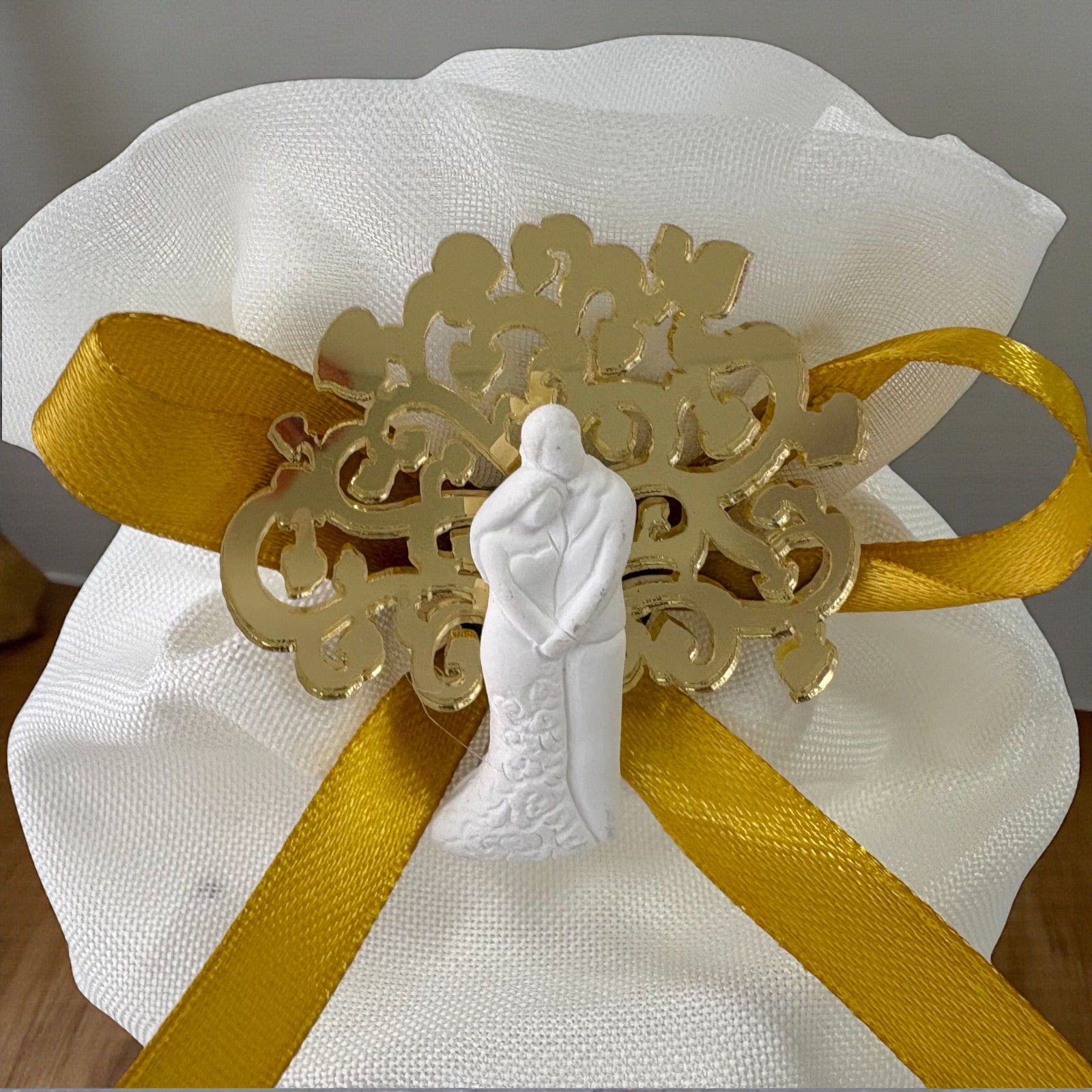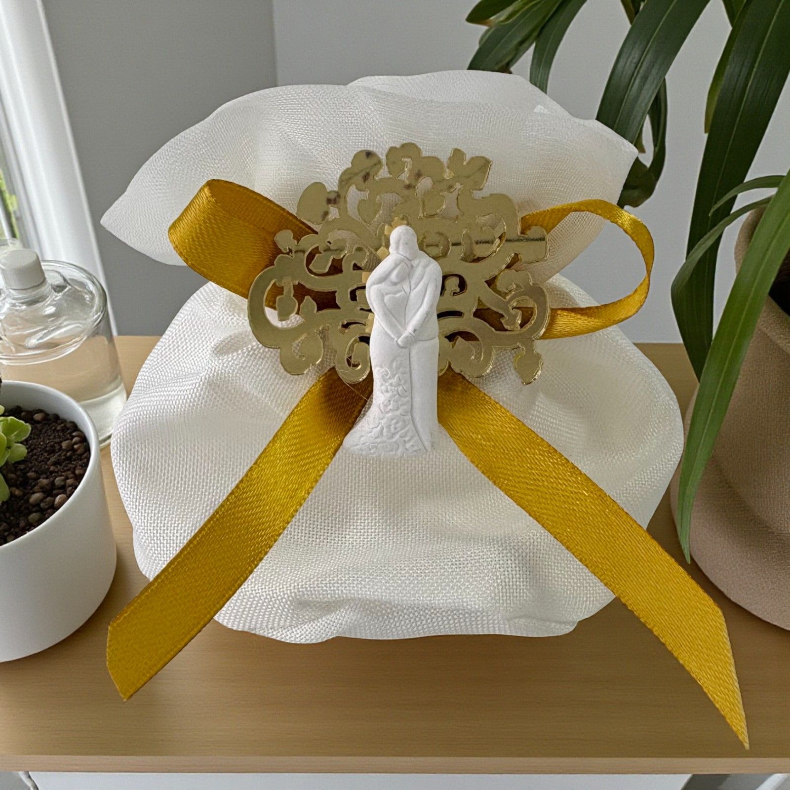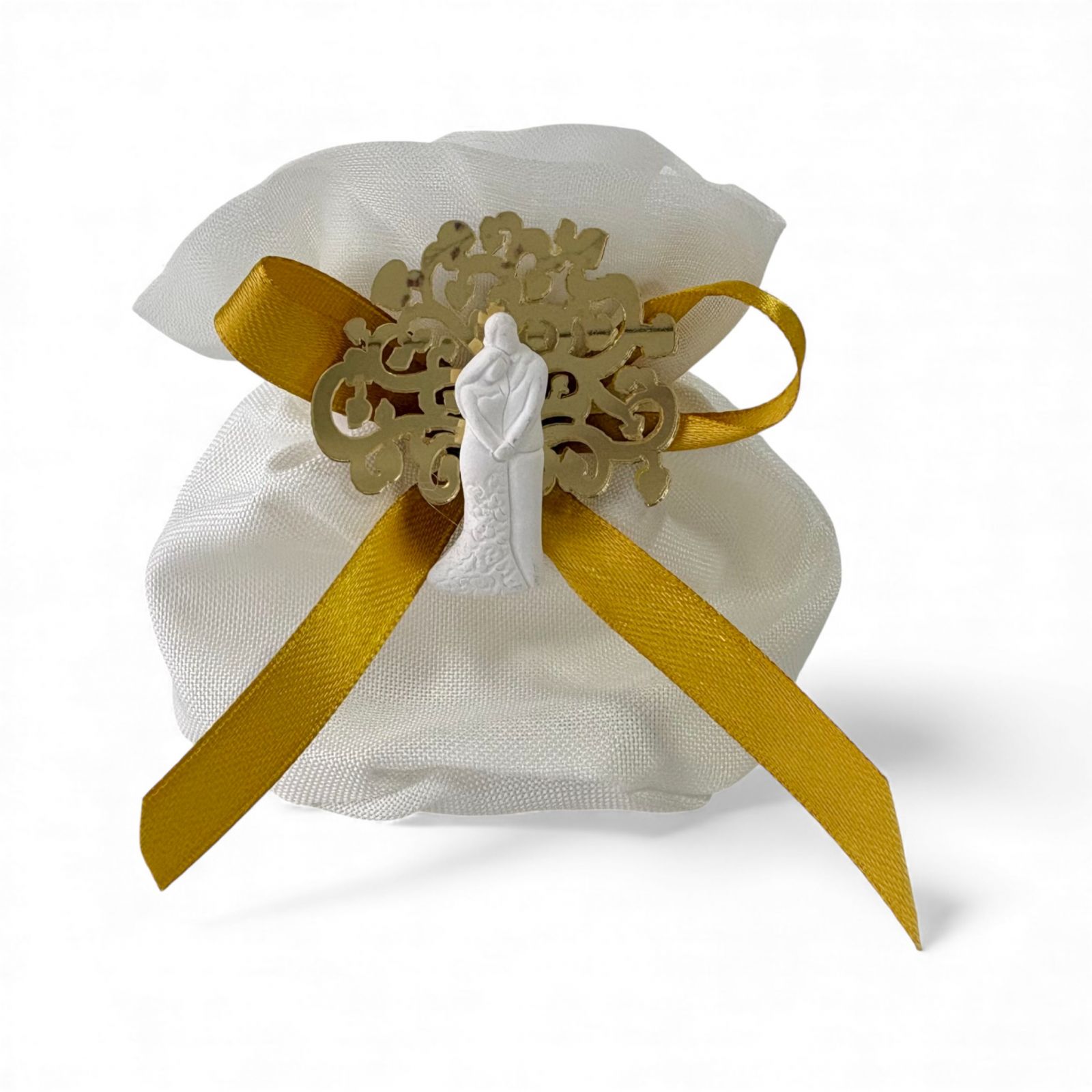 Realizzata con materiali di qualità, la calamita bianca con dettagli curati è ospitata in un sacchetto raffinato dotato di tiranti e una chiusura decorativa a forma di rosa che dona un tocco sofisticato. Ideale per le nozze, gli anniversari o come pensiero per celebrare storie d'amore, questa bomboniera si inserisce perfettamente nella tua confettata o può essere utilizzata come grazioso segnaposto.