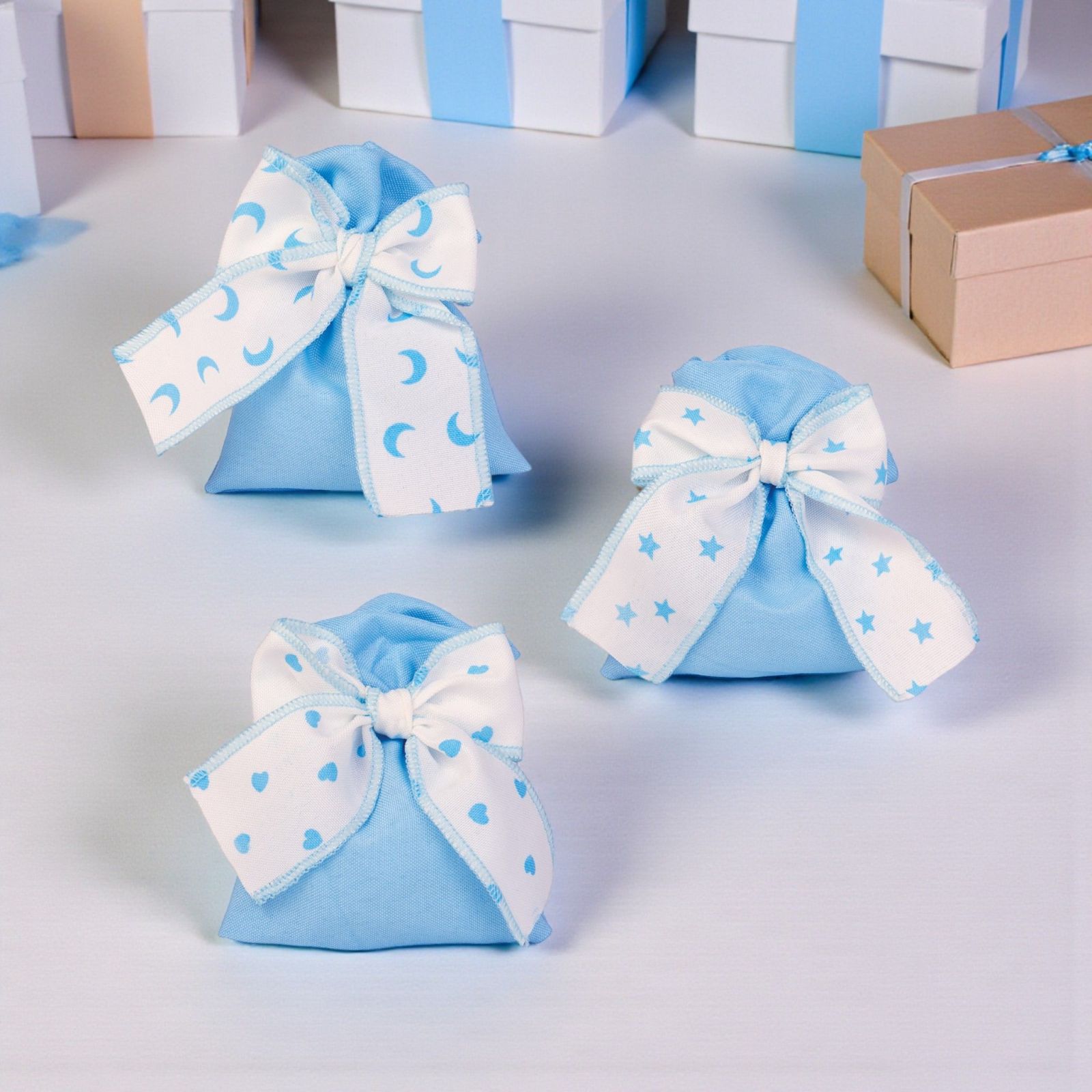 Regalare una bomboniera nascita è un gesto che racchiude un mondo di emozioni, un modo per condividere la gioia di un nuovo arrivo con amici e familiari. I nostri sacchettini per confetti, con deliziosi fiocchi a fantasia di lune, cuori e stelline, rappresentano un pensiero unico e affettuoso. Ogni sacchettino è un piccolo scrigno che trasmette amore e felicità, perfetto per celebrare eventi indimenticabili come il battesimo del tuo bimbo.