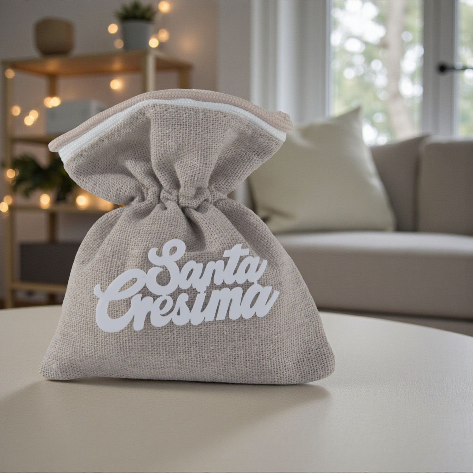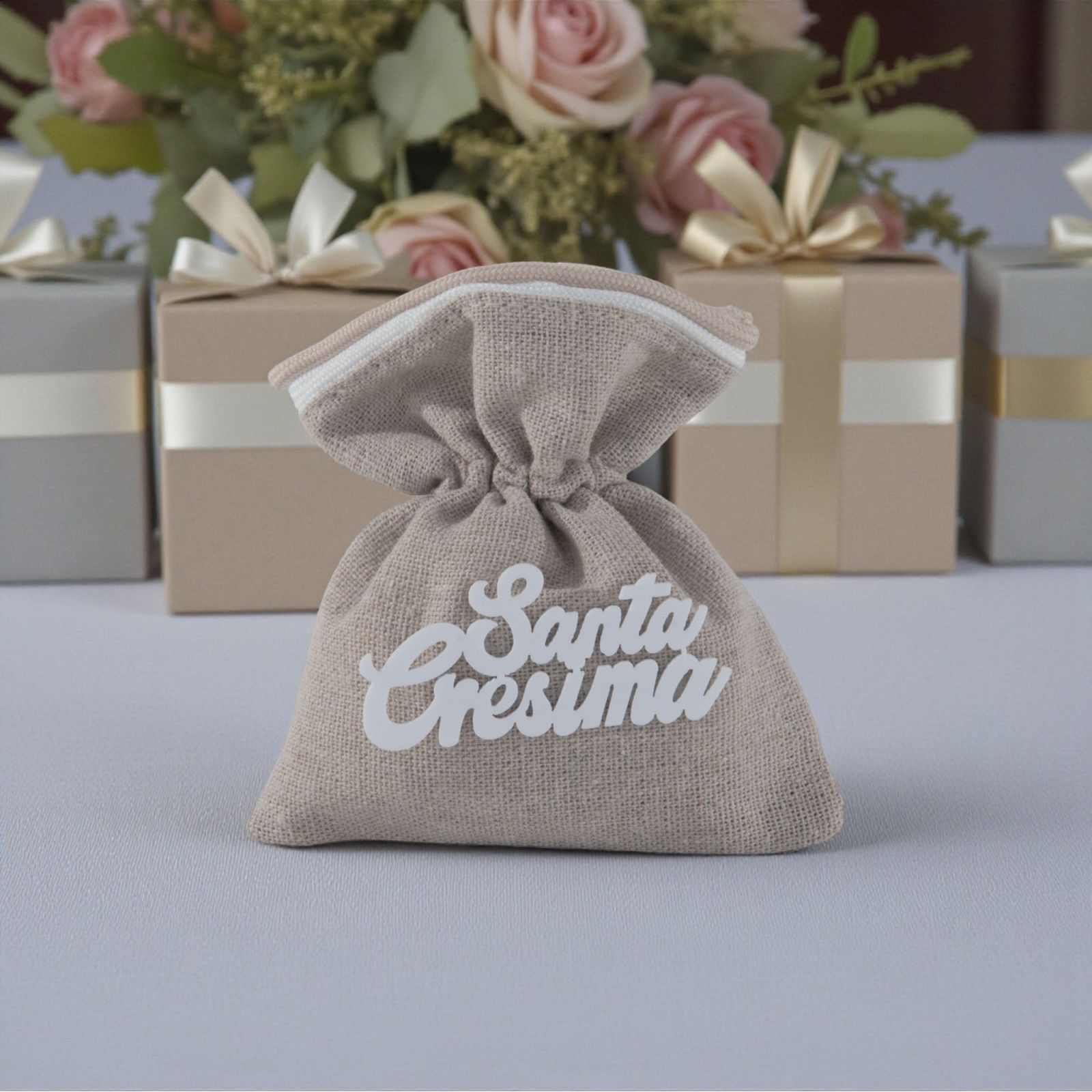 Festeggiare la Santa Cresima è un momento unico e speciale nella vita di ogni giovane, un rito di passaggio che merita di essere celebrato con eleganza. I nostri sacchettini con l’applicazione "Santa Cresima" sono pensati per rendere questo giorno indimenticabile. Realizzati in morbida juta, questi portaconfetti non sono solo un accessorio, ma un simbolo di amore e affetto, perfetti per arricchire la vostra confettata e sorprendere gli invitati.