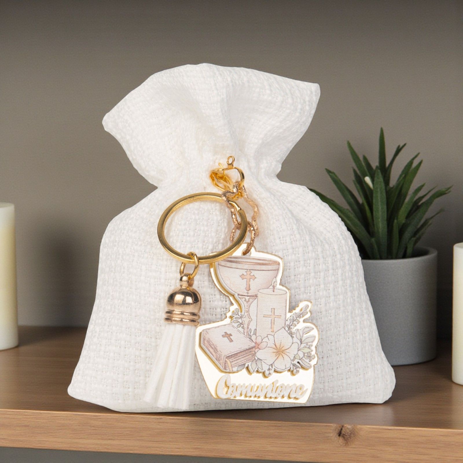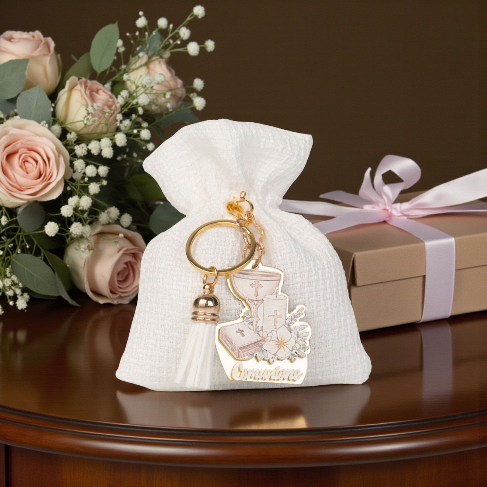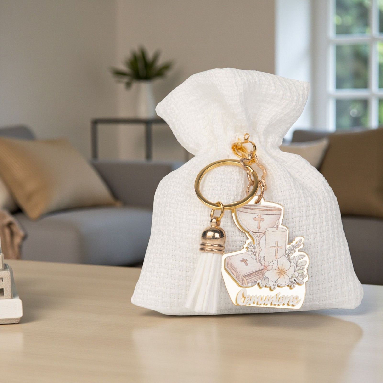 Il momento della Prima Comunione è un evento indimenticabile che merita di essere celebrato con tutto il cuore. Questo sacchetto portaconfetti, arricchito da un elegante portachiavi con nappina bianca e simboli sacri, rappresenta un pensiero unico e significativo per condividere la gioia di questo giorno speciale. Non è solo un semplice omaggio, ma un ricordo prezioso da custodire nel tempo.