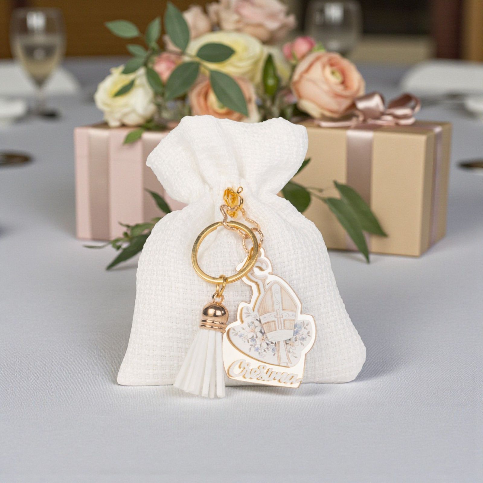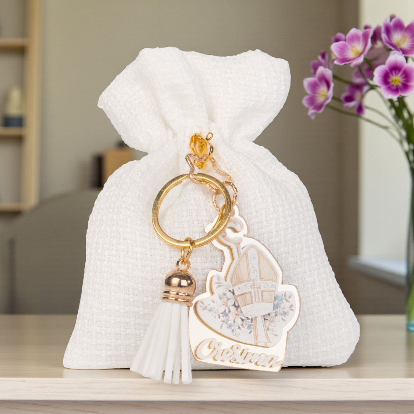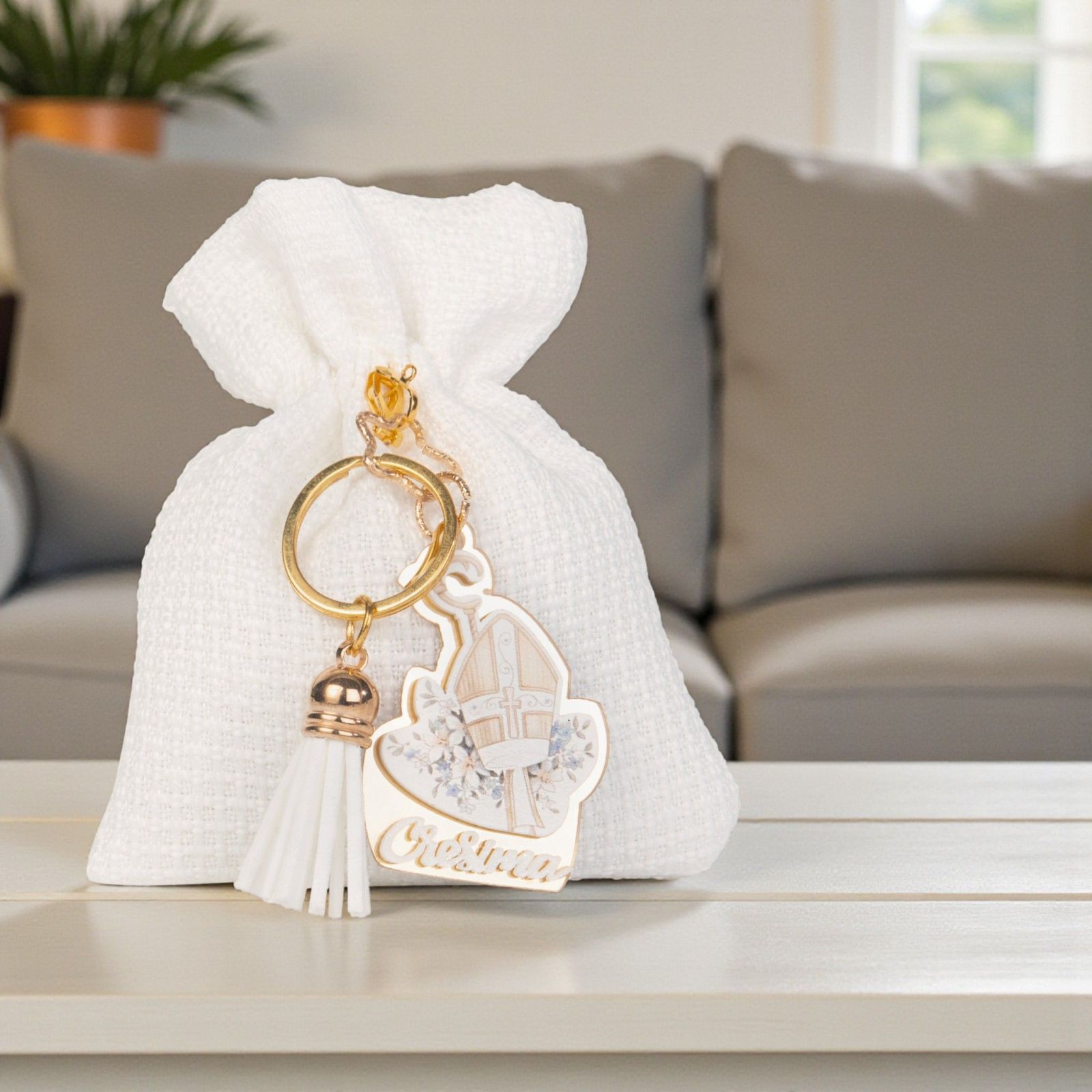Scopri l'emozione di celebrare un momento speciale con il nostro elegante portaconfetti per la Santa Cresima. Questo sacchetto per confetti, arricchito da un delizioso portachiavi con nappina bianca e simboli sacri, è il regalo perfetto per rendere indimenticabile questo giorno. Ogni dettaglio è pensato per trasmettere un messaggio di amore e di connessione spirituale, rendendo la tua confettata ancora più significativa.