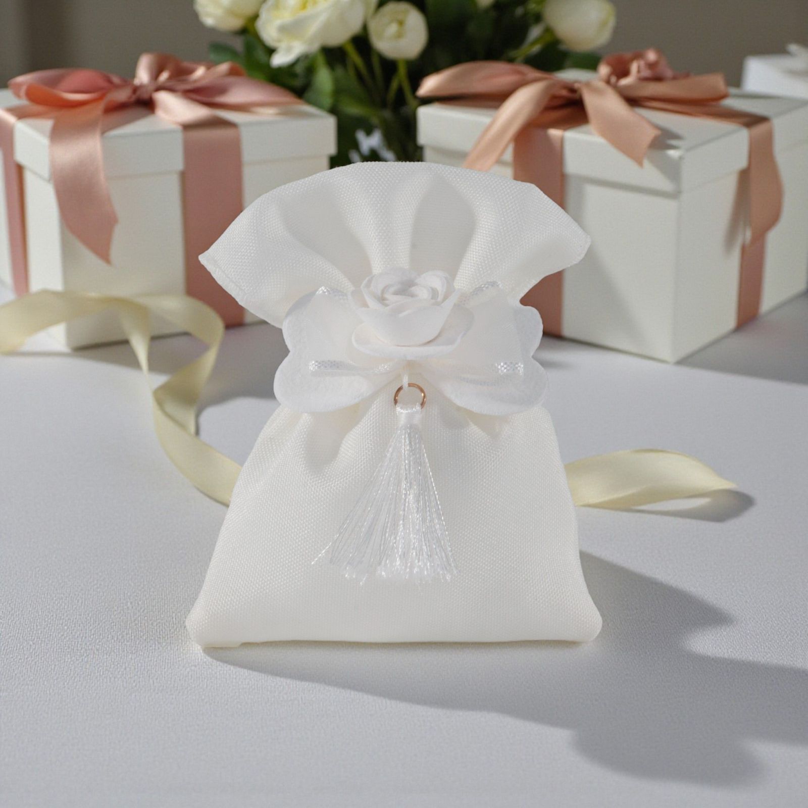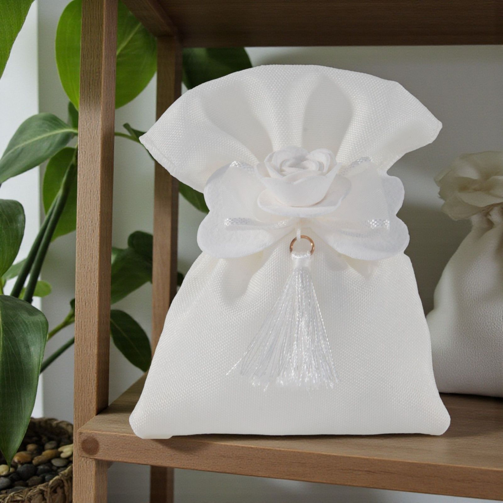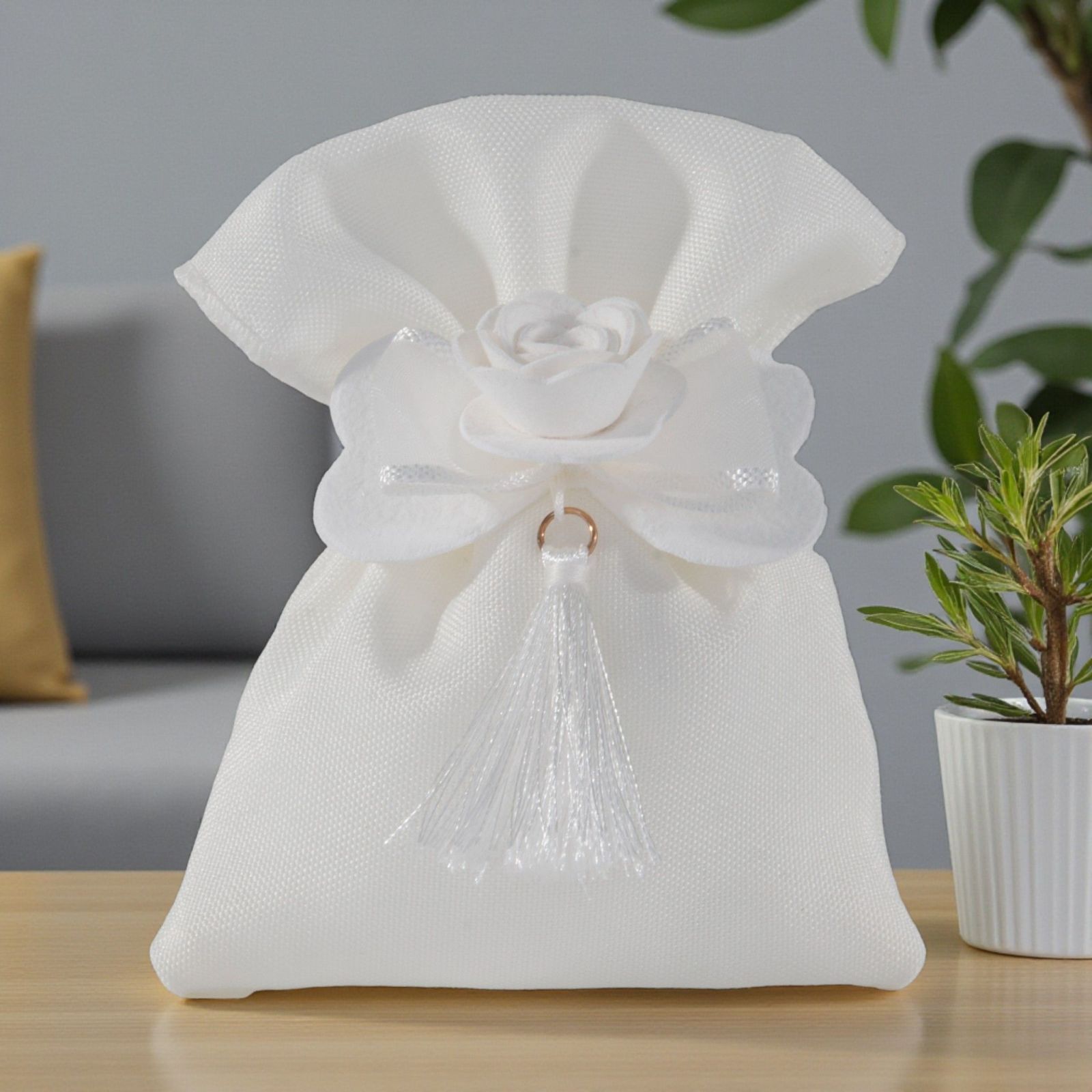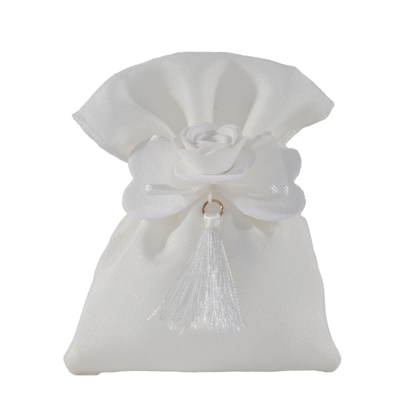 Realizzato in pregiato tessuto bianco, questo sacchetto non è solo un semplice contenitore per dolciumi, ma un vero e proprio simbolo di amore e condivisione. Il fiocco elegante e la rosa centrale con nappina conferiscono un tocco romantico, mentre i dettagli raffinati raccontano la tua storia d’amore in modo unico e personalizzato. Scegliere questi sacchetti per confezionamento bomboniere significa dare un significato profondo a ogni singolo confetto.