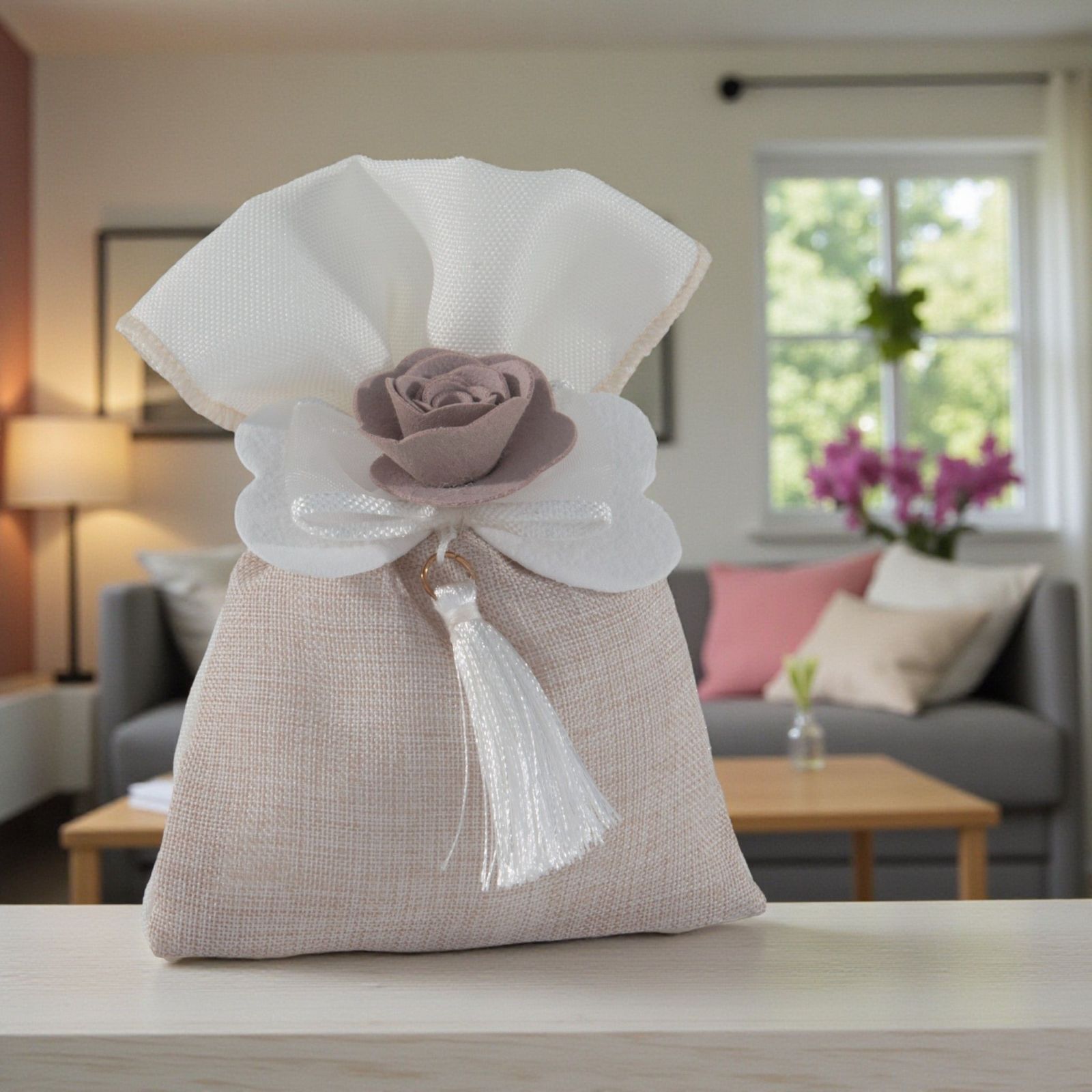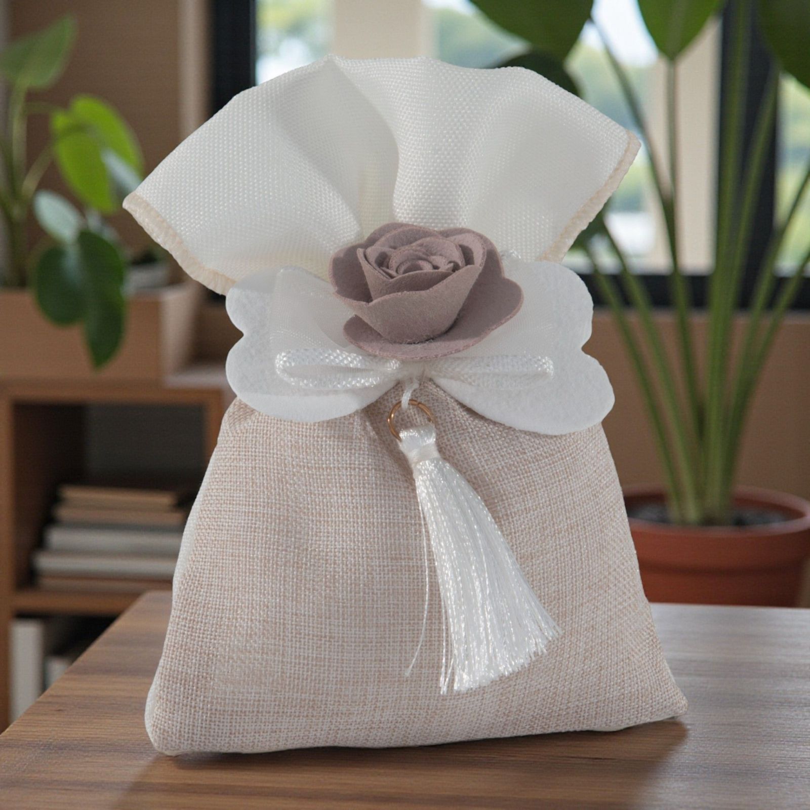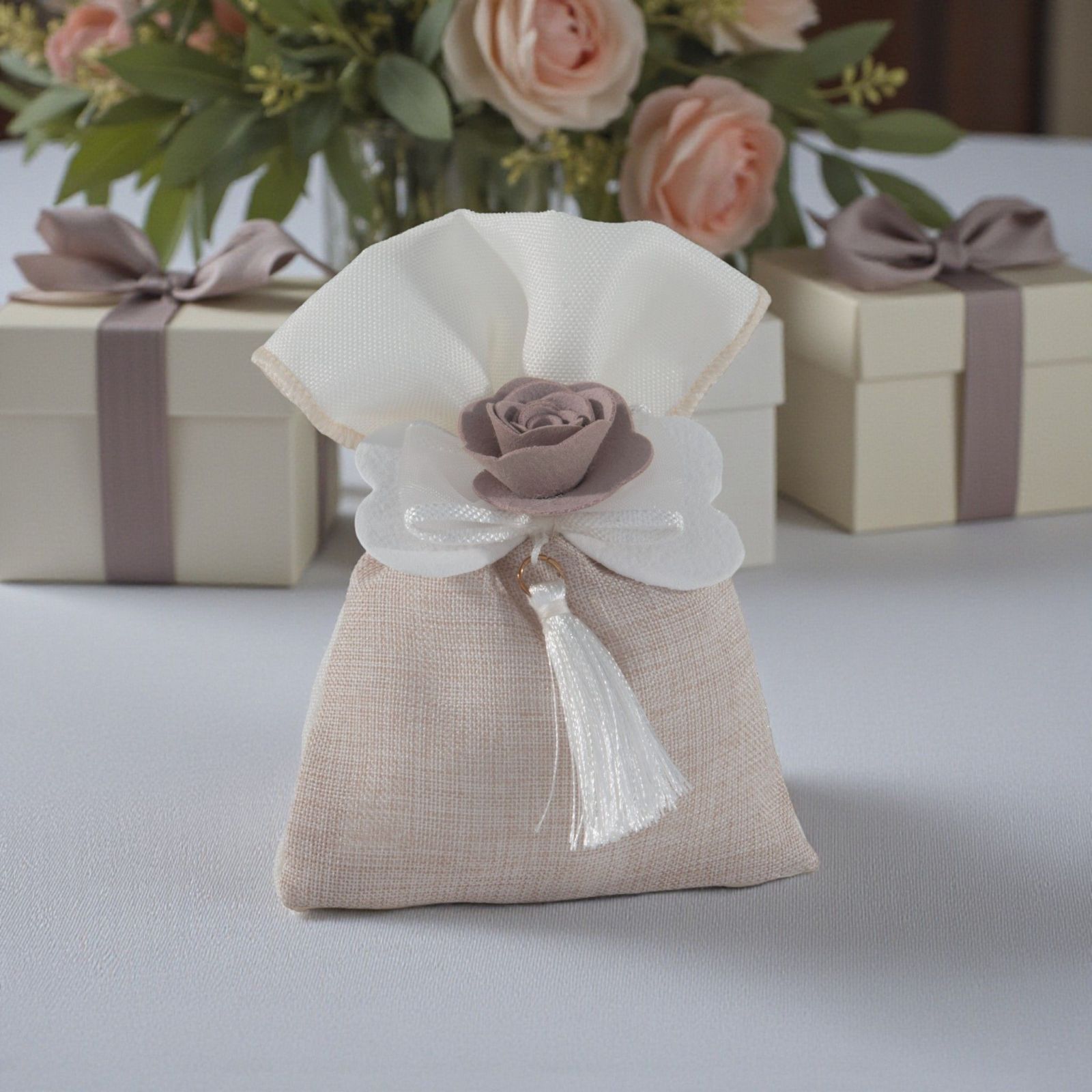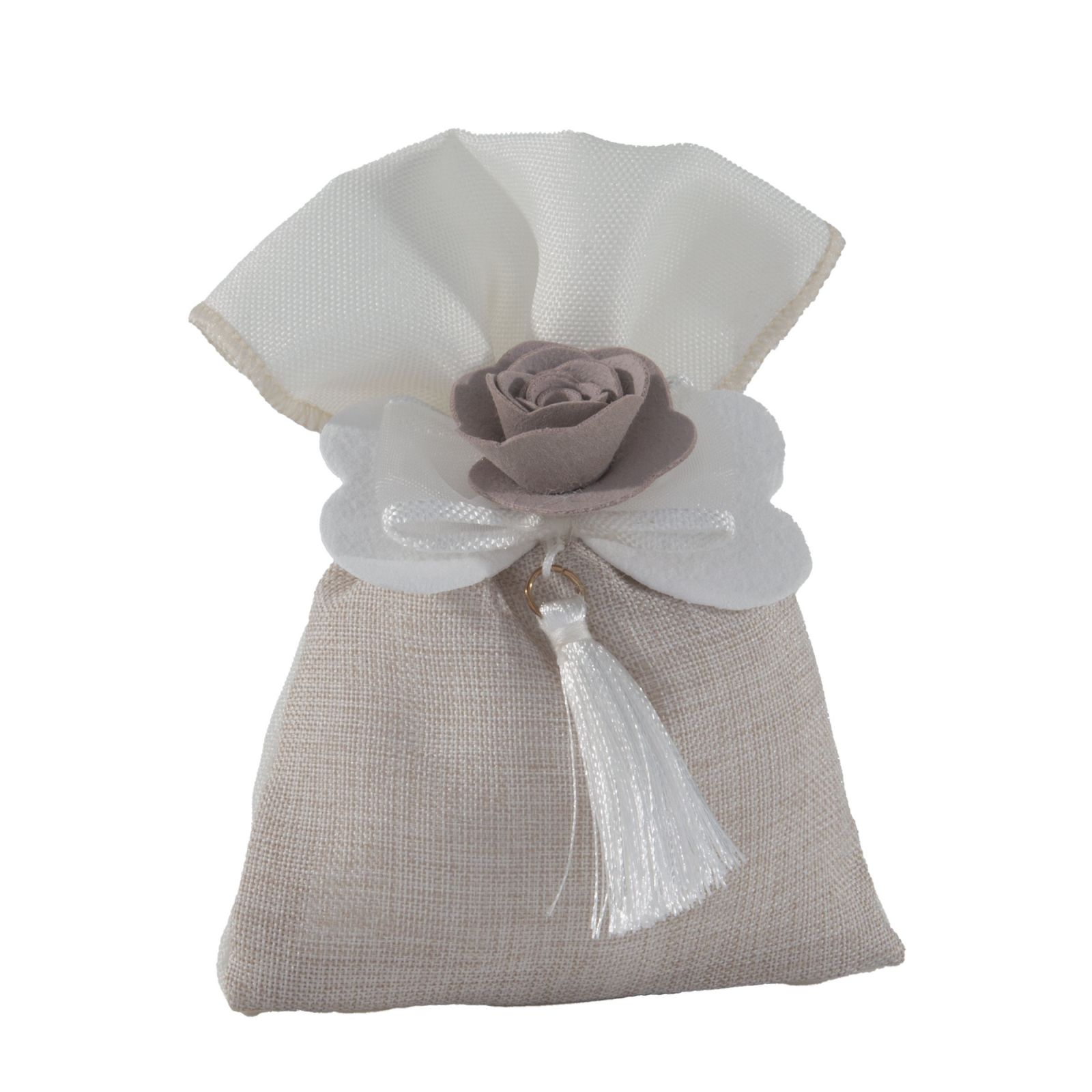 Ogni momento speciale merita di essere celebrato con un tocco di eleganza e raffinatezza. Questo sacchetto per confetti con fiocco e rosa centrale è l'accessorio perfetto per rendere indimenticabili eventi come matrimoni e anniversari. Realizzato in un delicato tessuto tortora e bianco, rappresenta un gesto d'amore e attenzione per i vostri ospiti, arricchendo la confettata e i sweet table con un'eleganza senza tempo.