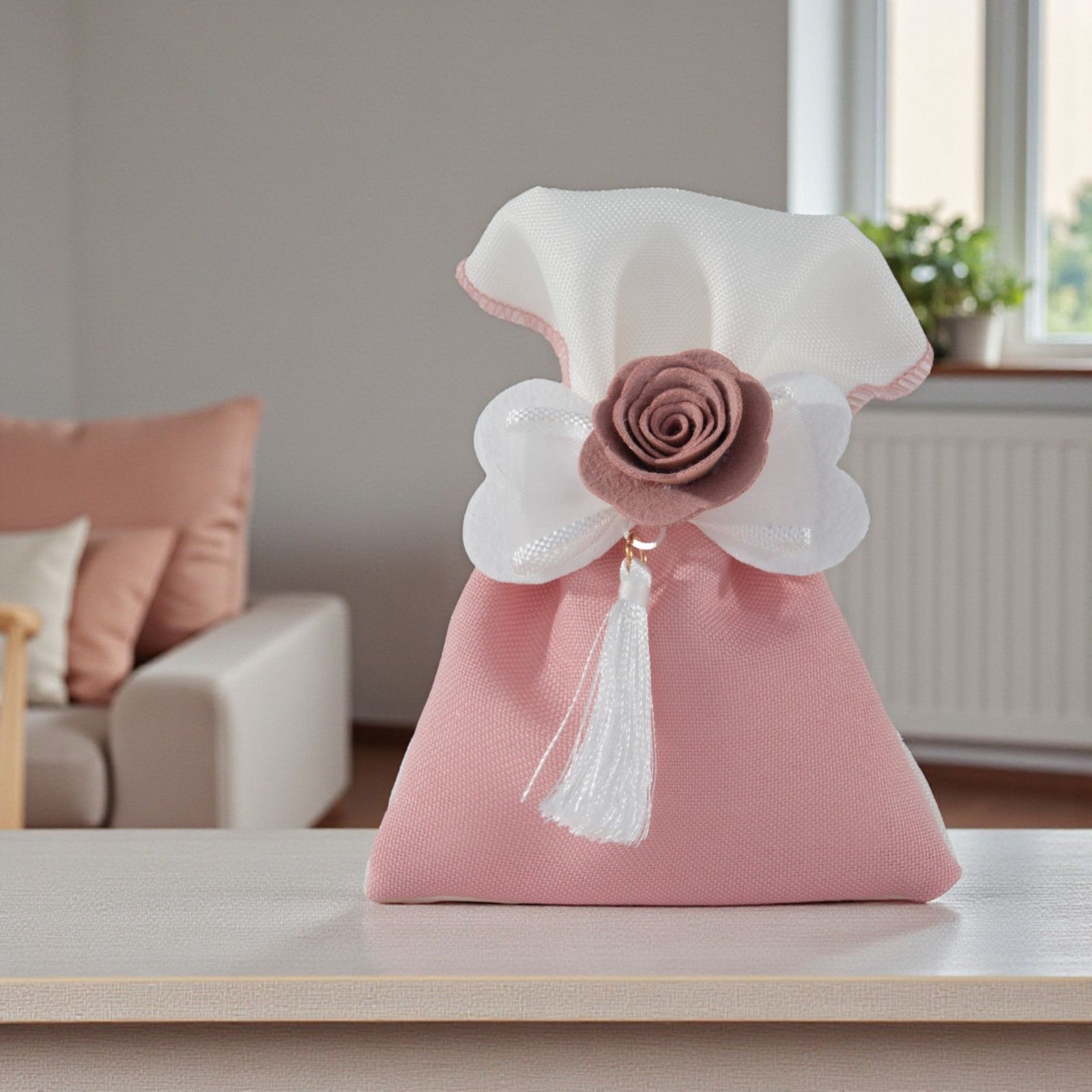 Realizzato in pregiato tessuto di colore rosa antico e bianco, questo sacchetto per confezionamento bomboniere rappresenta una scelta raffinata e originale per il tuo sweet table. Ogni sacchetto non solo custodisce i confetti, ma racconta una storia di affetto e gioia, trasformando un semplice gesto in un ricordo indimenticabile. La sua bellezza e originalità conquisteranno i tuoi ospiti, lasciando un segno nel loro cuore.