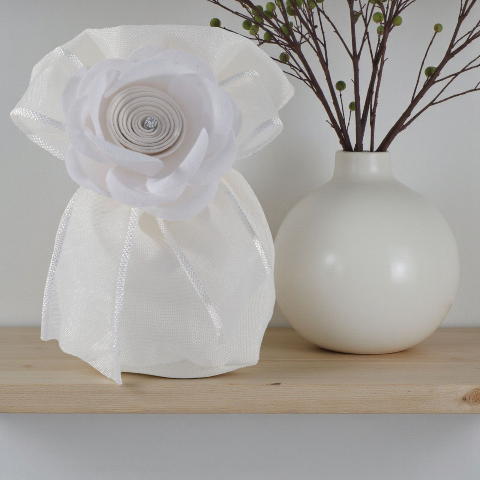 Realizzato in raffinato tessuto bianco, questo sacchetto si presta magnificamente per una confettata elegante, arricchendo il vostro sweet table con un tocco di classe. I dettagli del fiocco e del fiore centrale aggiungono una nota di delicatezza, rendendo ogni sacchetto unico e speciale, proprio come il vostro giorno.