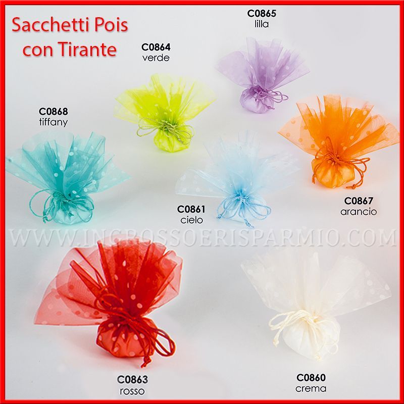 Sacchetti bomboniere per ogni evento: portaconfetti organza disponibili in un vasto assortimento di colori per confettate battesimo, compleanno, matrimonio, comunione, ecc...