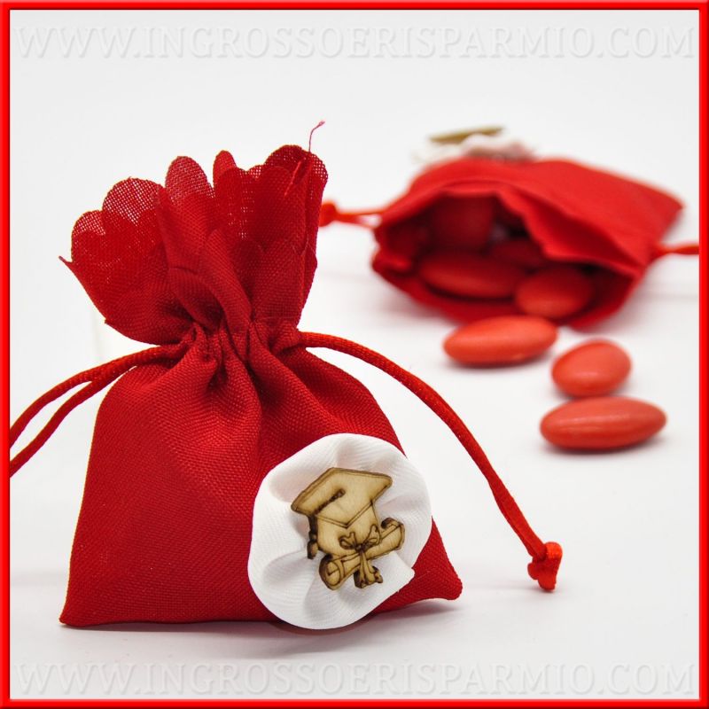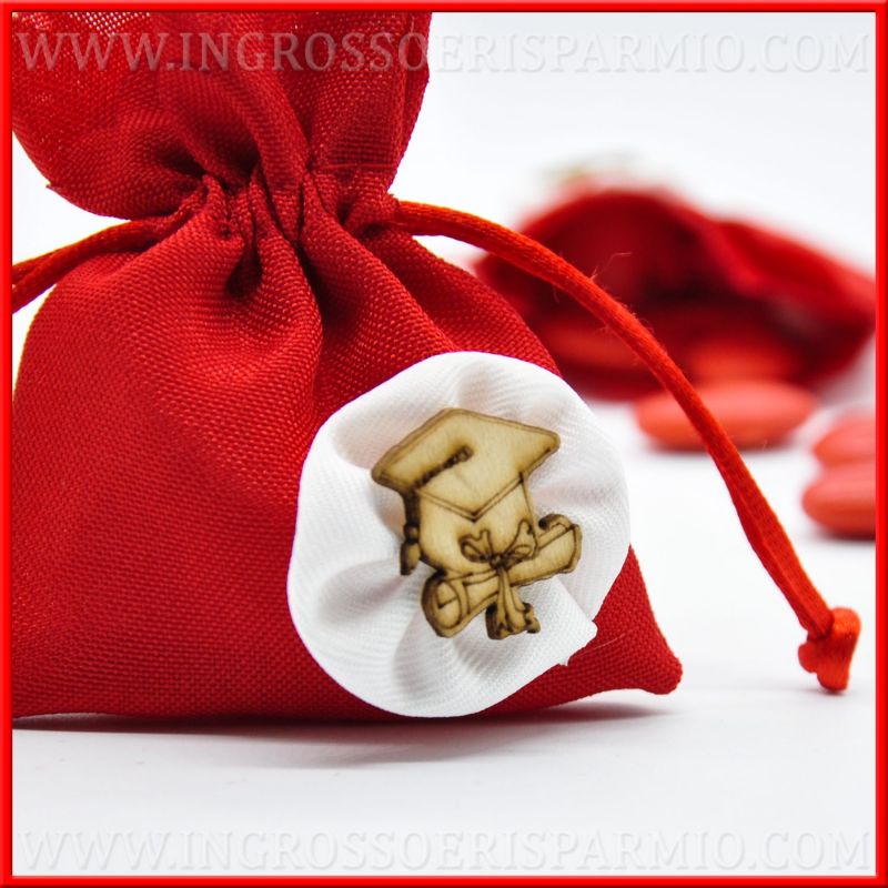 * Sacchettino portaconfetti laurea in cotone rosso, con tiranti a chiusura rapida. In basso a destra inoltre vi è stata applicata un'icona in legno a forma di tocco e pergamena su pezzo di stoffa bianca.