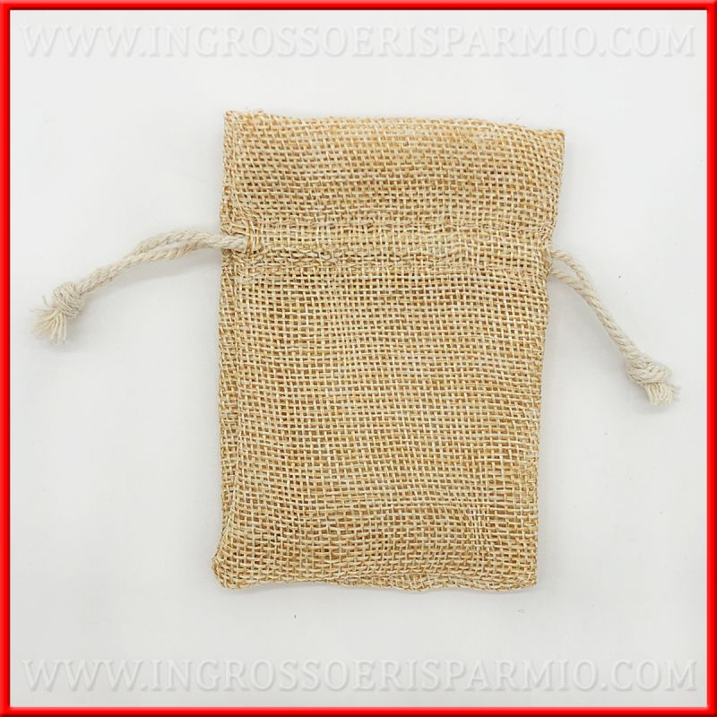 Sacchetto di iuta, semplice, colore naturale con tiranti laterali in corda.