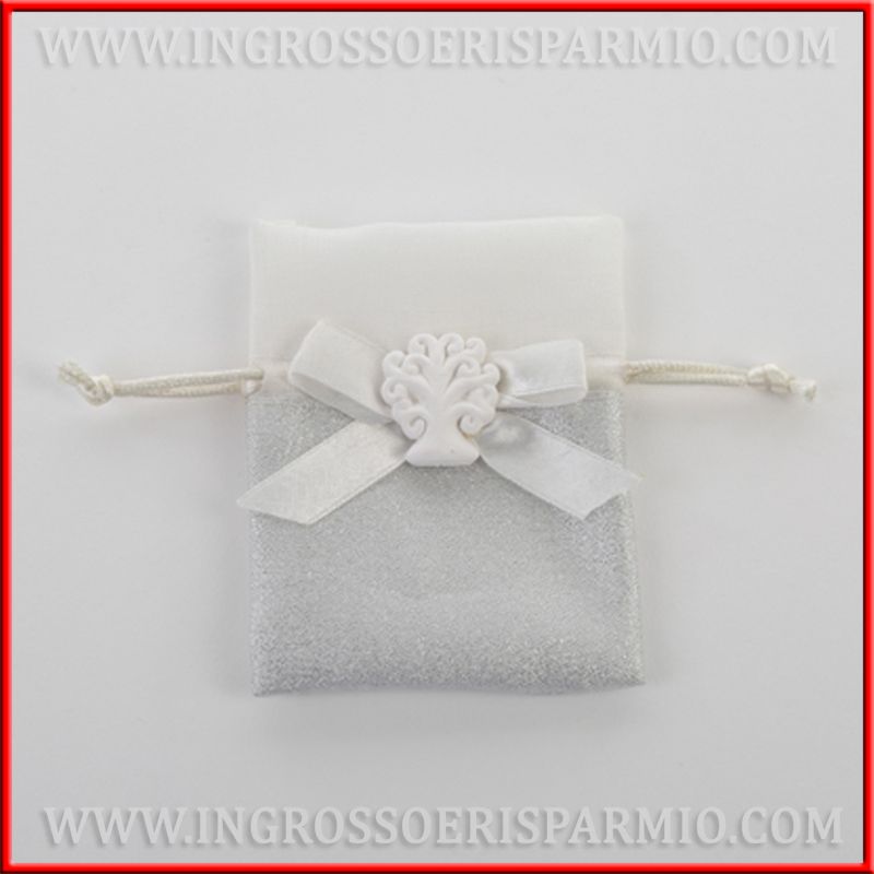 Sacchetto per confetti in cotone, con parte inferiore color argento glitterato e bordo superiore bianco. Al centro, in corrispondenza, della chiusura con tiranti, è applicato un fiocco in raso bianco con gessetto albero della vita.