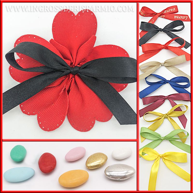 Margherita di confetti composta da 5 petali rossi a cuore, in tessuto rigato (avanti) e organza (retro) con fiocco decorativo centrale, del modello a tua scelta tra le proposte presenti nel menù di personalizzazione: troverai nastrini semplici in raso, nell'assortimento di varie tonalità di colore, o nastri stampati, particolari, con scritte e raffigurazioni specifiche per un singolo evento (es. nastro laurea, nastro cresima, nastro matrimonio,...)