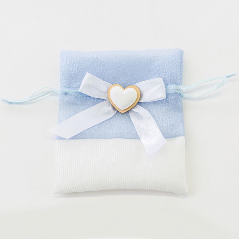 Per le tue bomboniere economiche bimbo abbina questo sacchetto realizzato in raso azzurro, con la parte terminale del sacchetto in tessuto rigato bianco e cordoncini tiranti in raso, al centro è applicato un fiocco bianco con un piccolo gessetto dello stesso colore appoggiato su un applicazione in legno a forma di cuore.