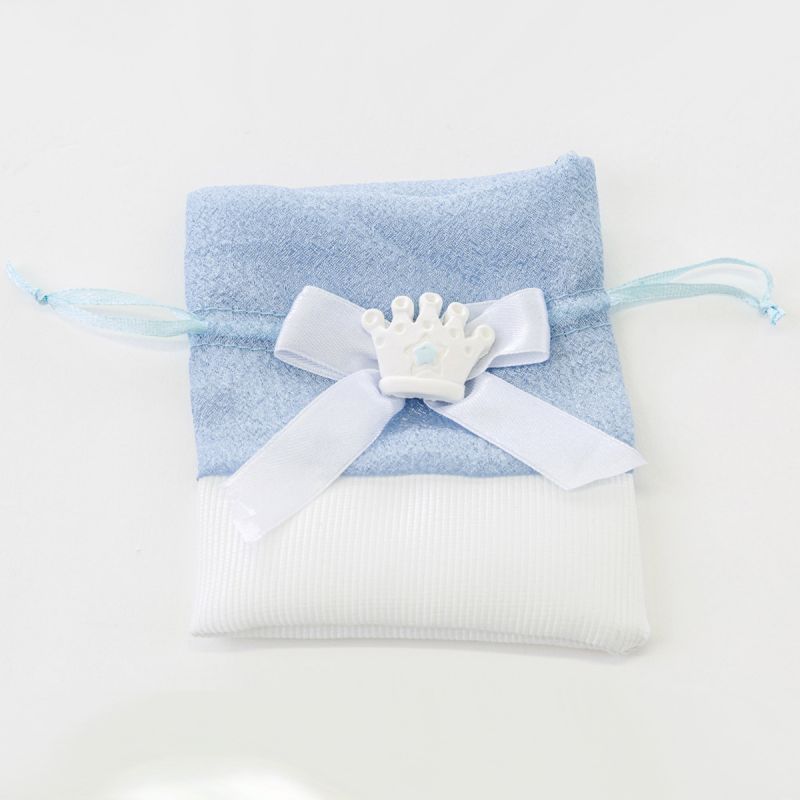Il sacchettino è realizzato in raso celeste nella parte superiore e bianco in cotone alla base, decorato con gessi a forma di corona da principe e fiocco. I tiranti per la chiusura sono incorporati.