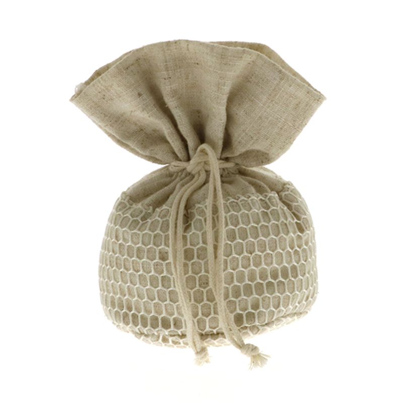 Eccoti i nostri sacchetti a base rotonda in juta beige racchiusi in una rete a trama larga nella parte inferiore con pratici cordoncini tiranti in tinta!