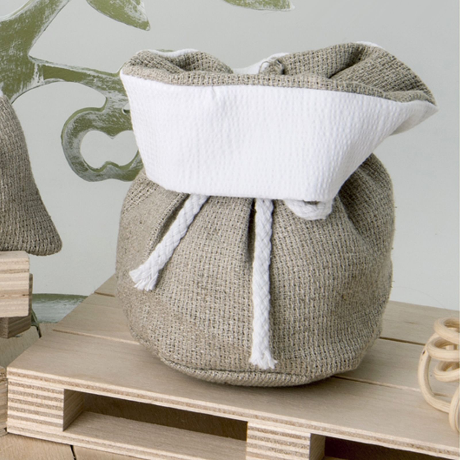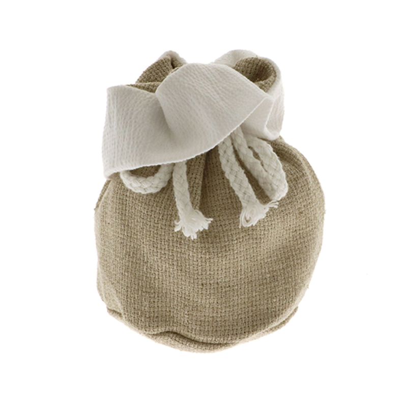 Portaconfetti juta: sacchettino bag tondo con cordino bianco per la chiusura e piega bianca.