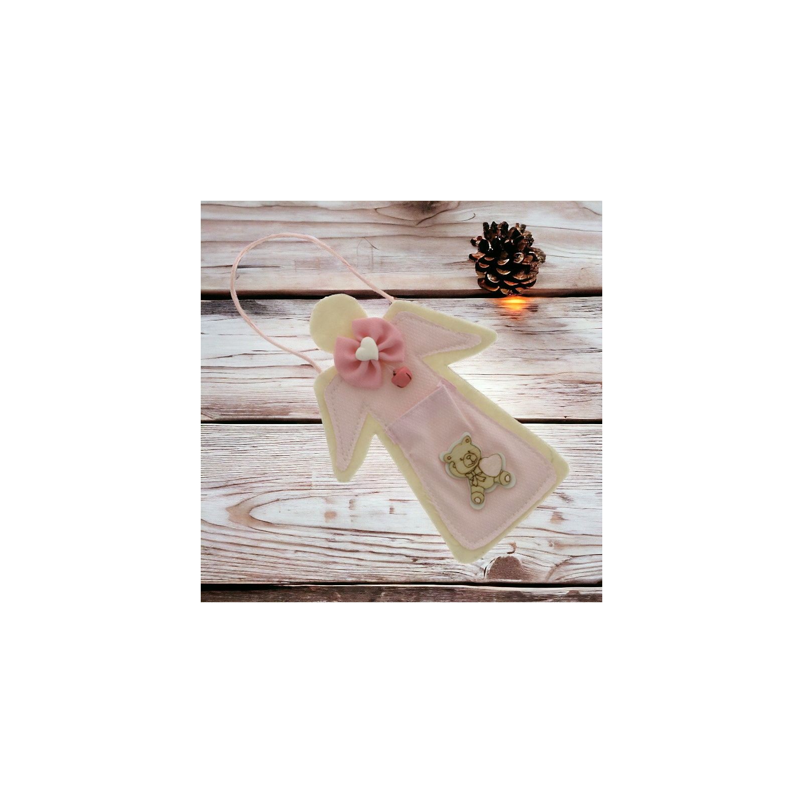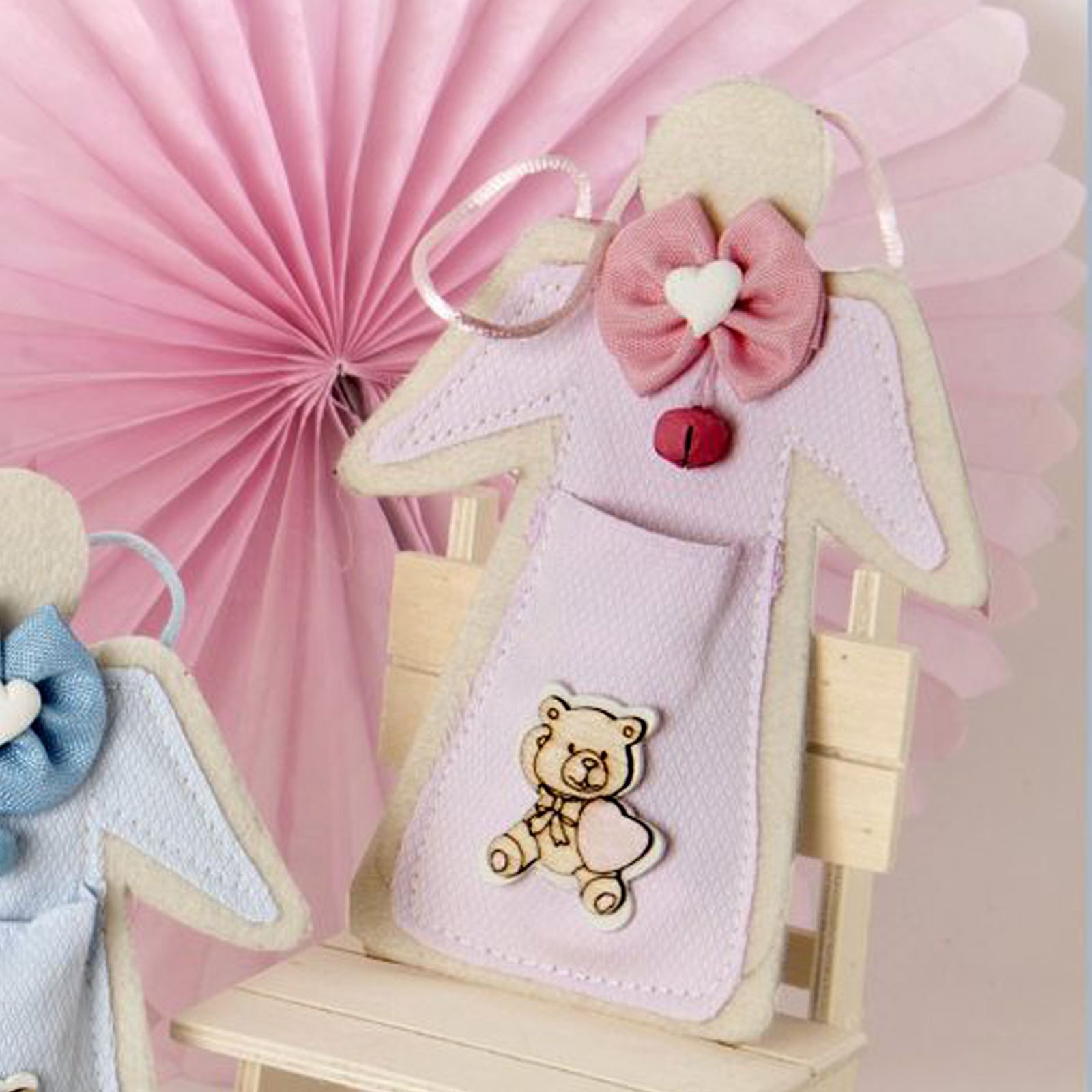 Sacchettini in pannolenci sagomati a forma di angelo con inserto in cotone rosa su cui sono applicate diverse decorazioni: fiocco rosa con cuoricino in gesso centrale, campanellino rosa e orsetto in legno che tiene tra le mani un cuore rosa. Nella parte inferiore è cucita una piccola tasca in cui inserire i confetti. Sul retro è cucito un manico in cordoncino rosa che permette di appendere l'angioletto.