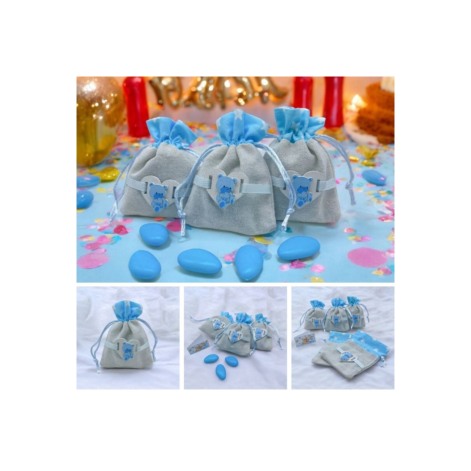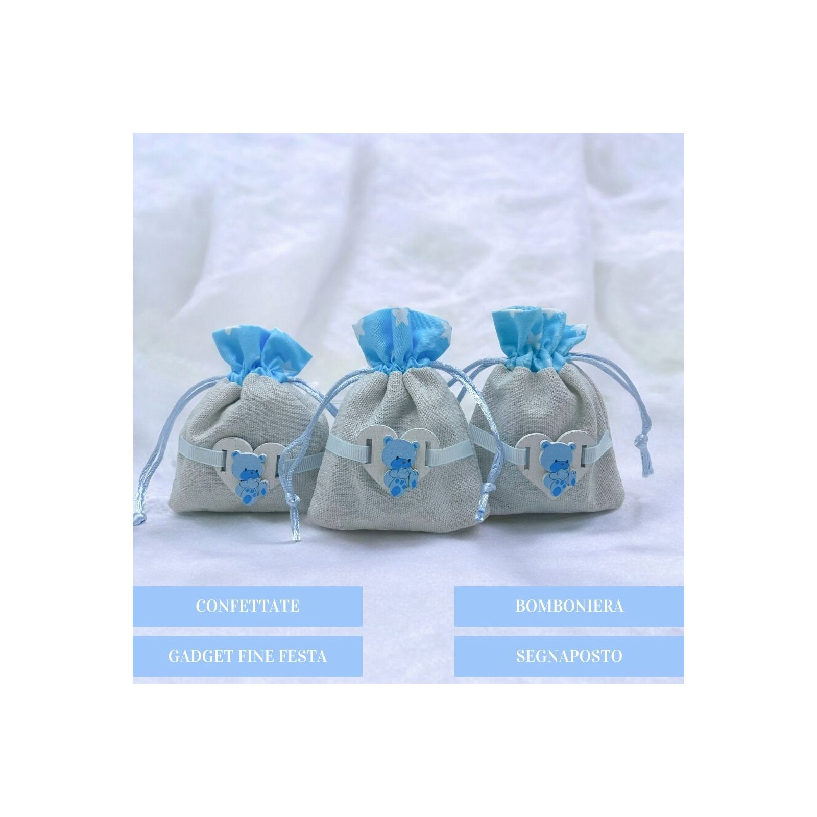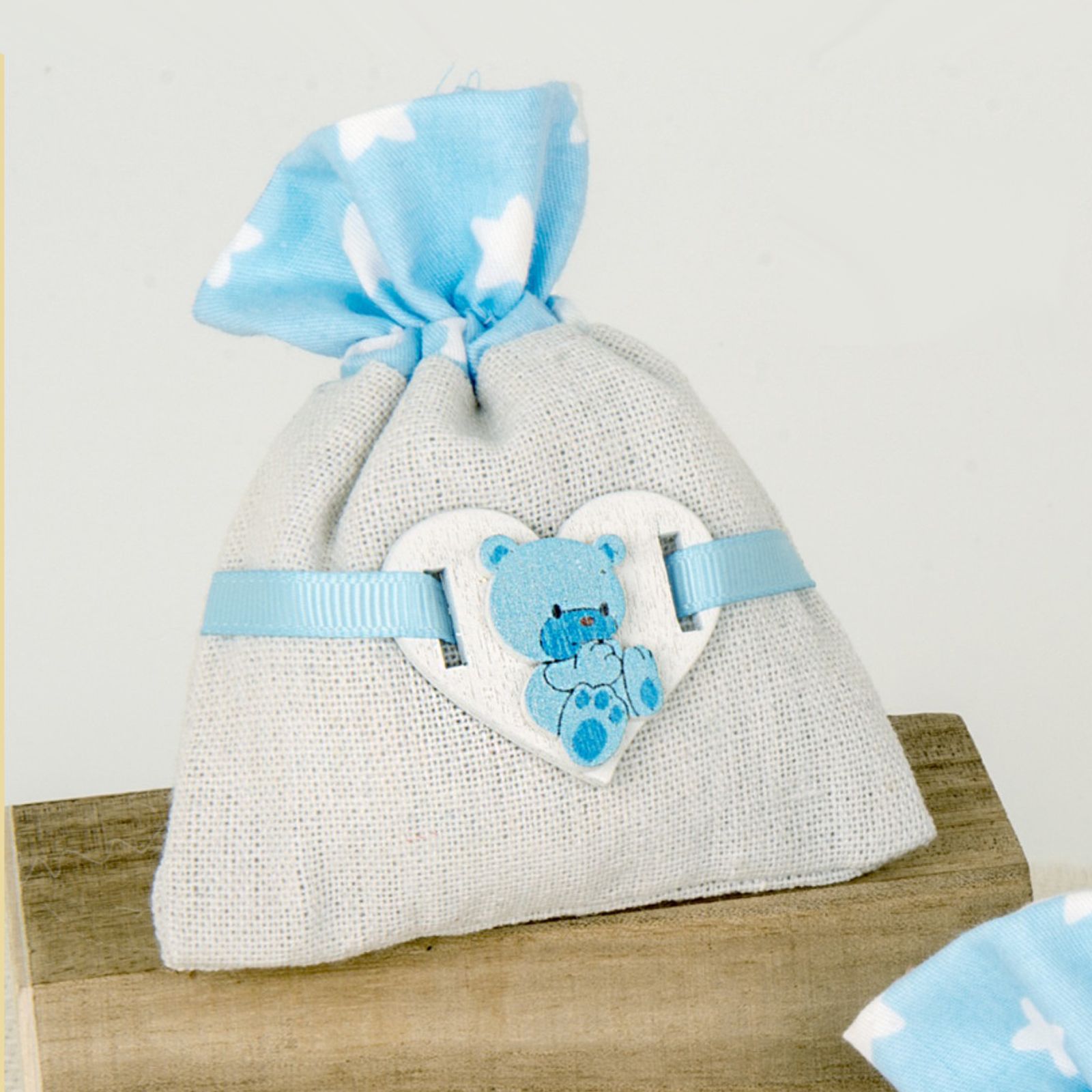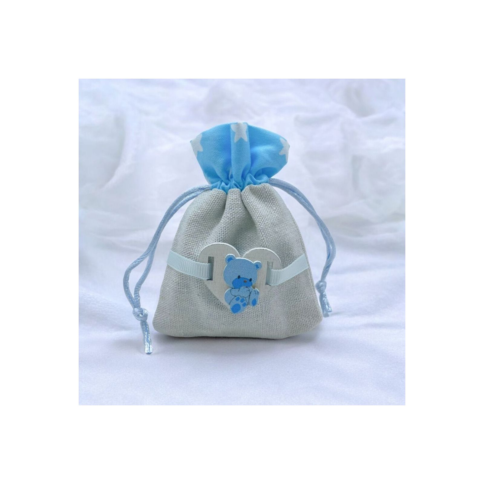 Sacchetto portaconfetti in iuta e tessuto con parte superiore in trama celeste decorato con stelle bianche e al centro tenuto da un nastro, un piccolo ciondolo in legno a forma di cuore con un piccolo orsetto azzurro centrale. Il sacchetto è provvisto di chiusura con tiranti.