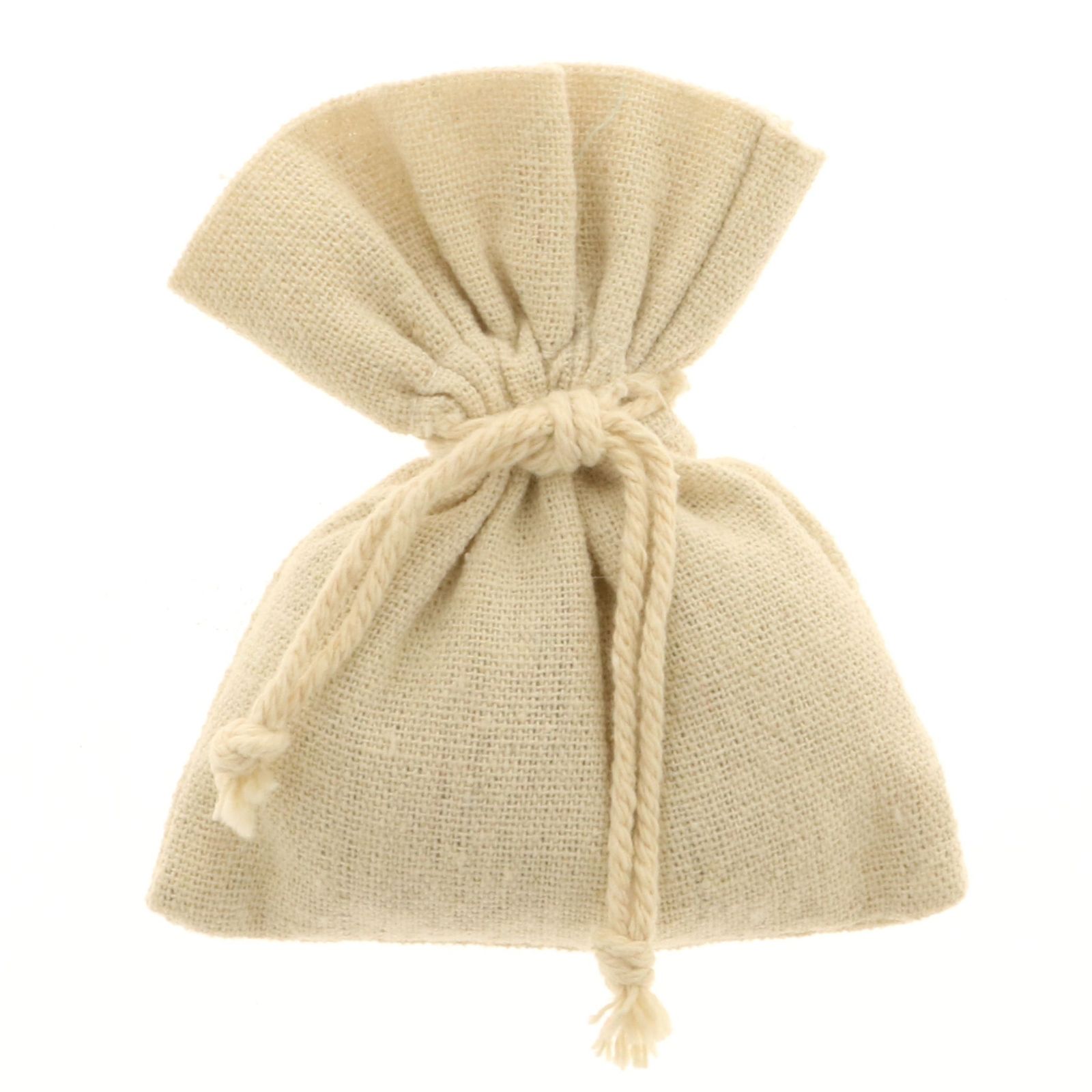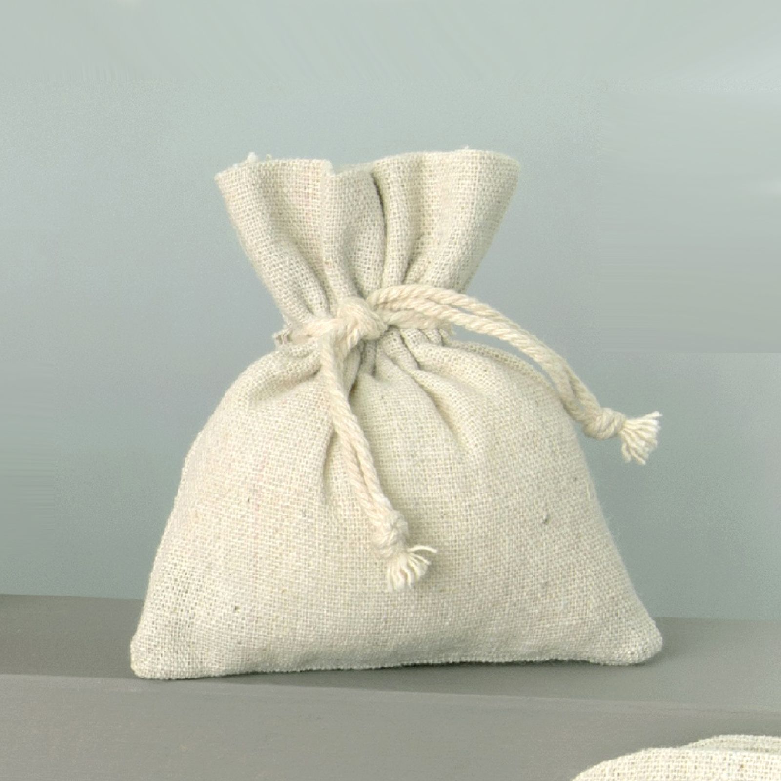 Sacchetto in juta naturale con tiranti laterali di chiusura in corda della stessa tonalità.