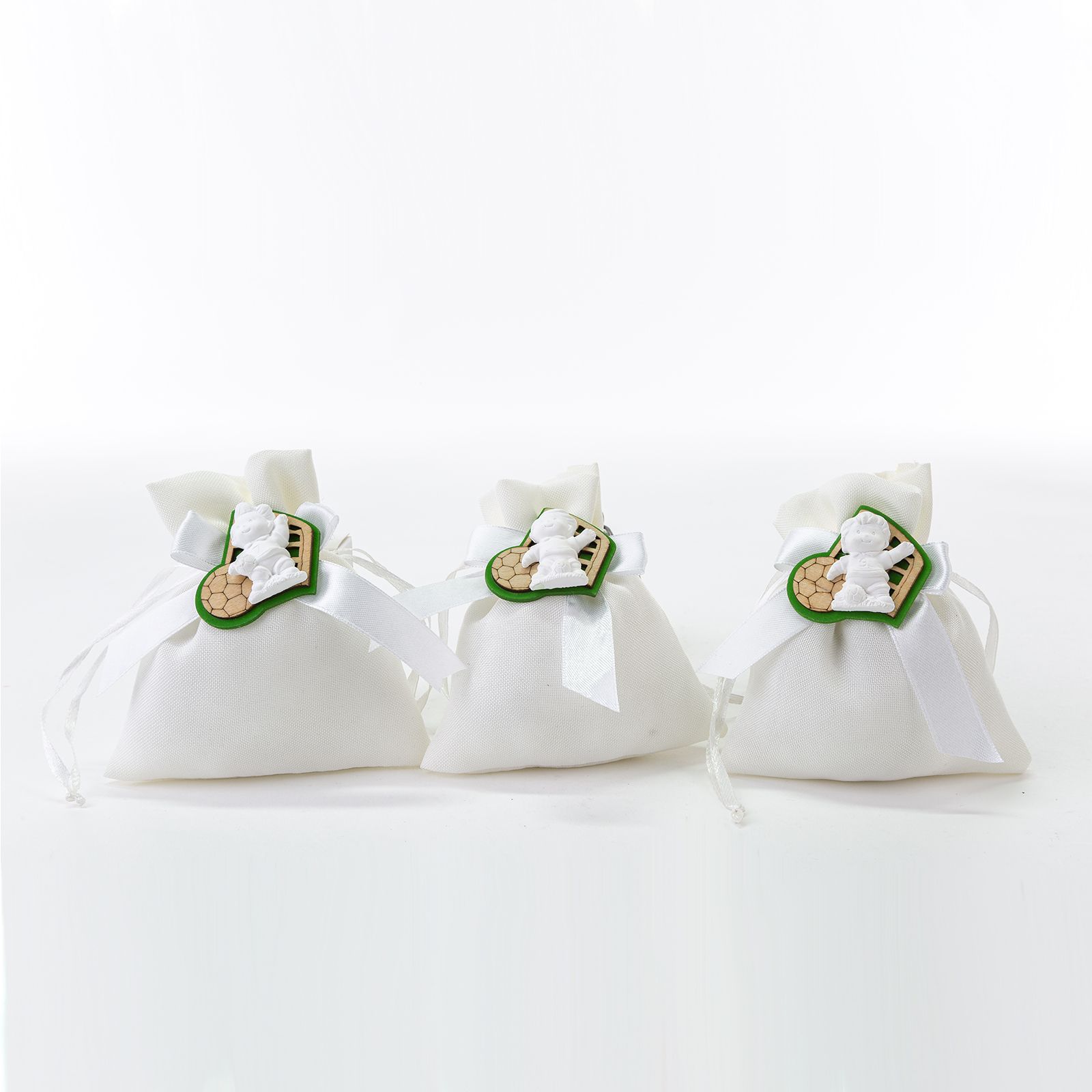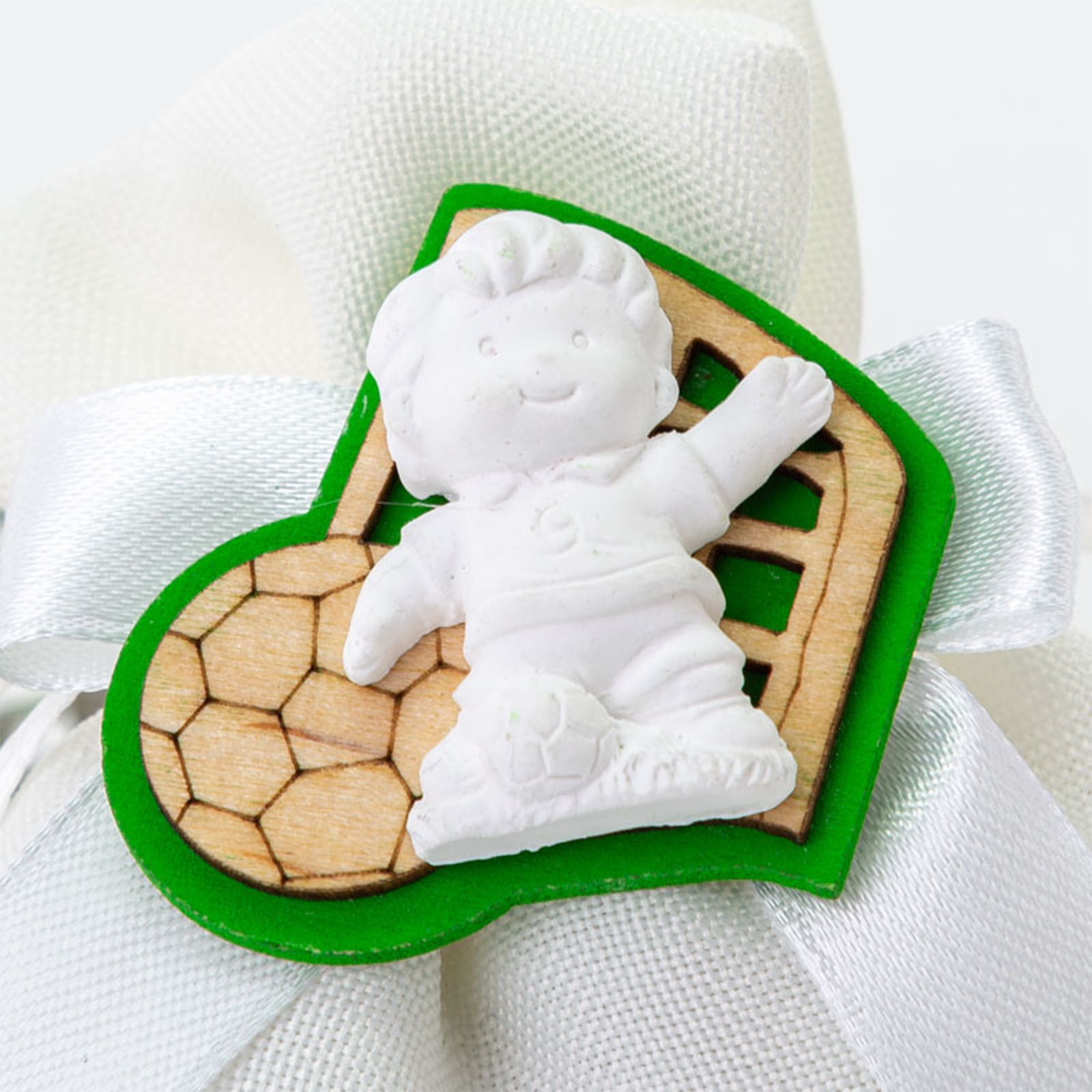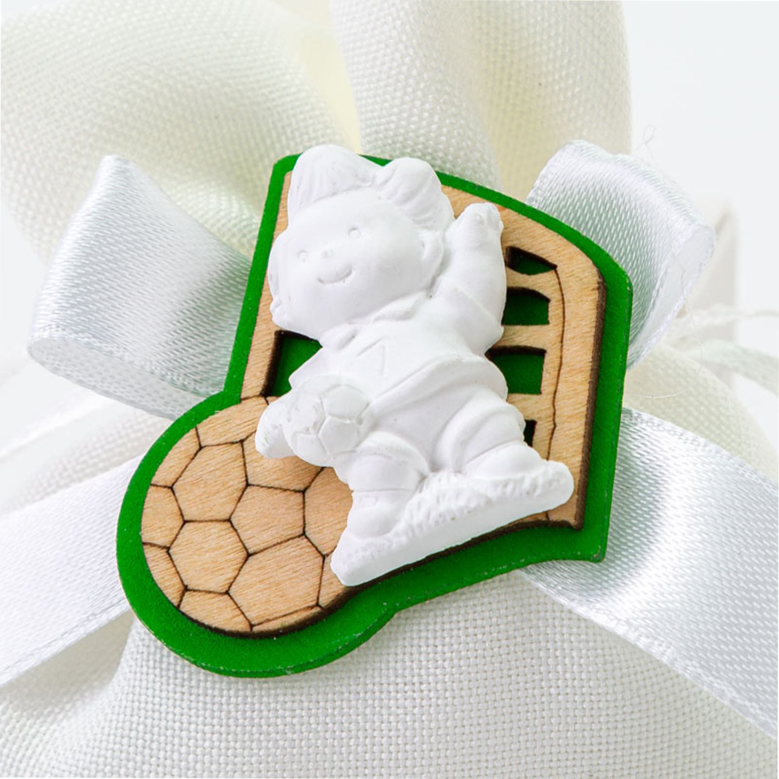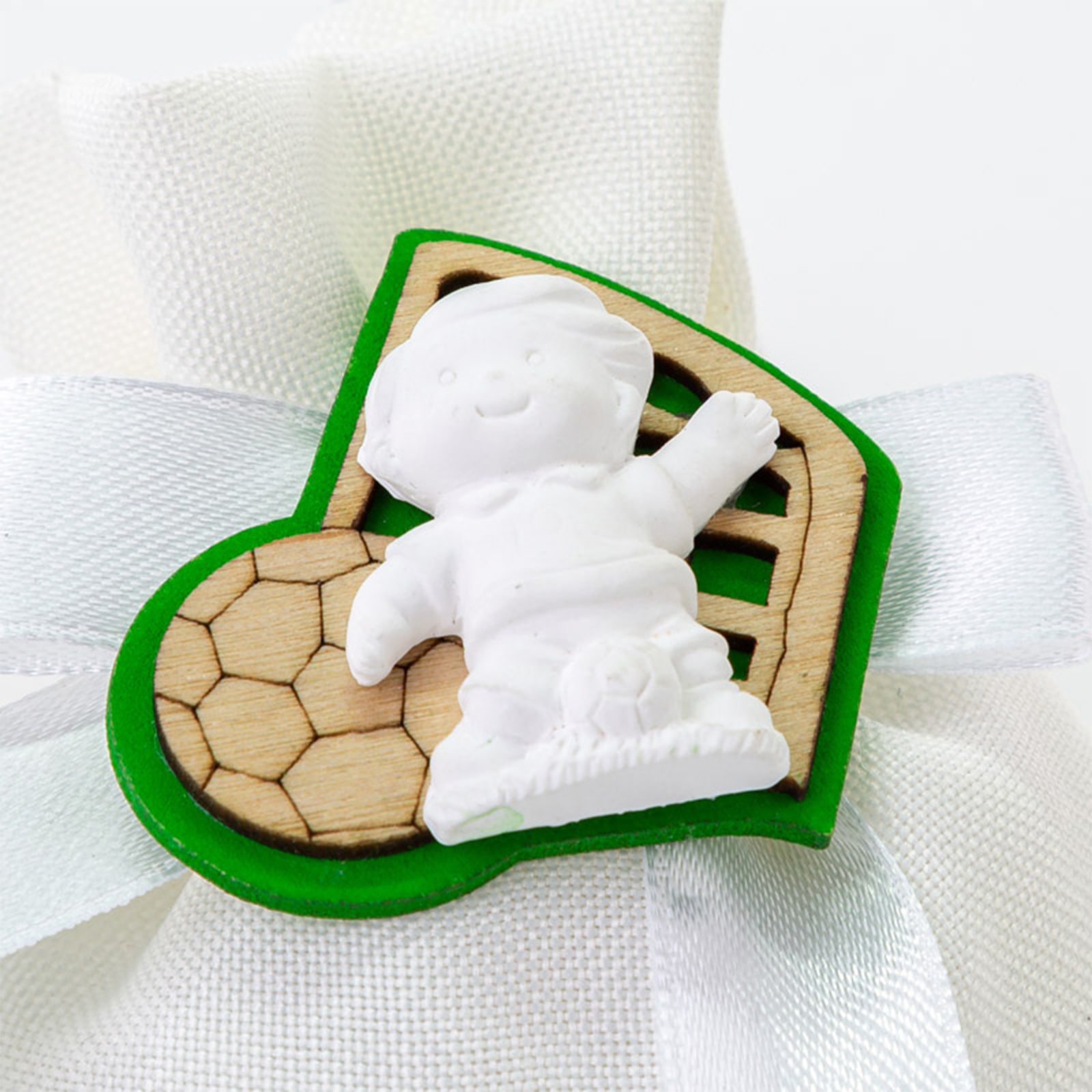 Sacchetti portaconfetti in cotone bianco con fiocco in raso e cordoncini tiranti in tinta e applicazione in legno e gesso raffigurante un piccolo campo da calcio e un provetto calciatore in tre pose assortite differenti.