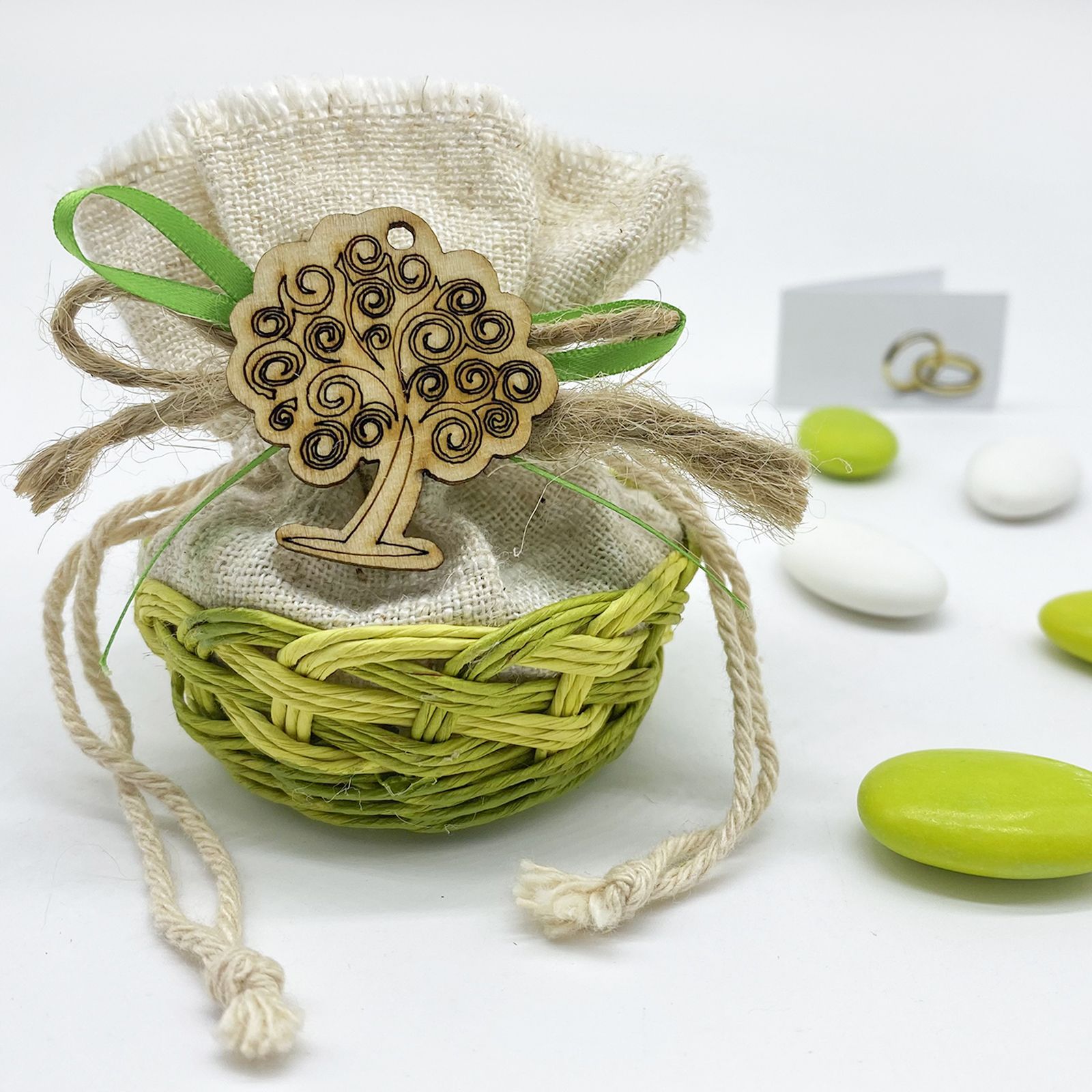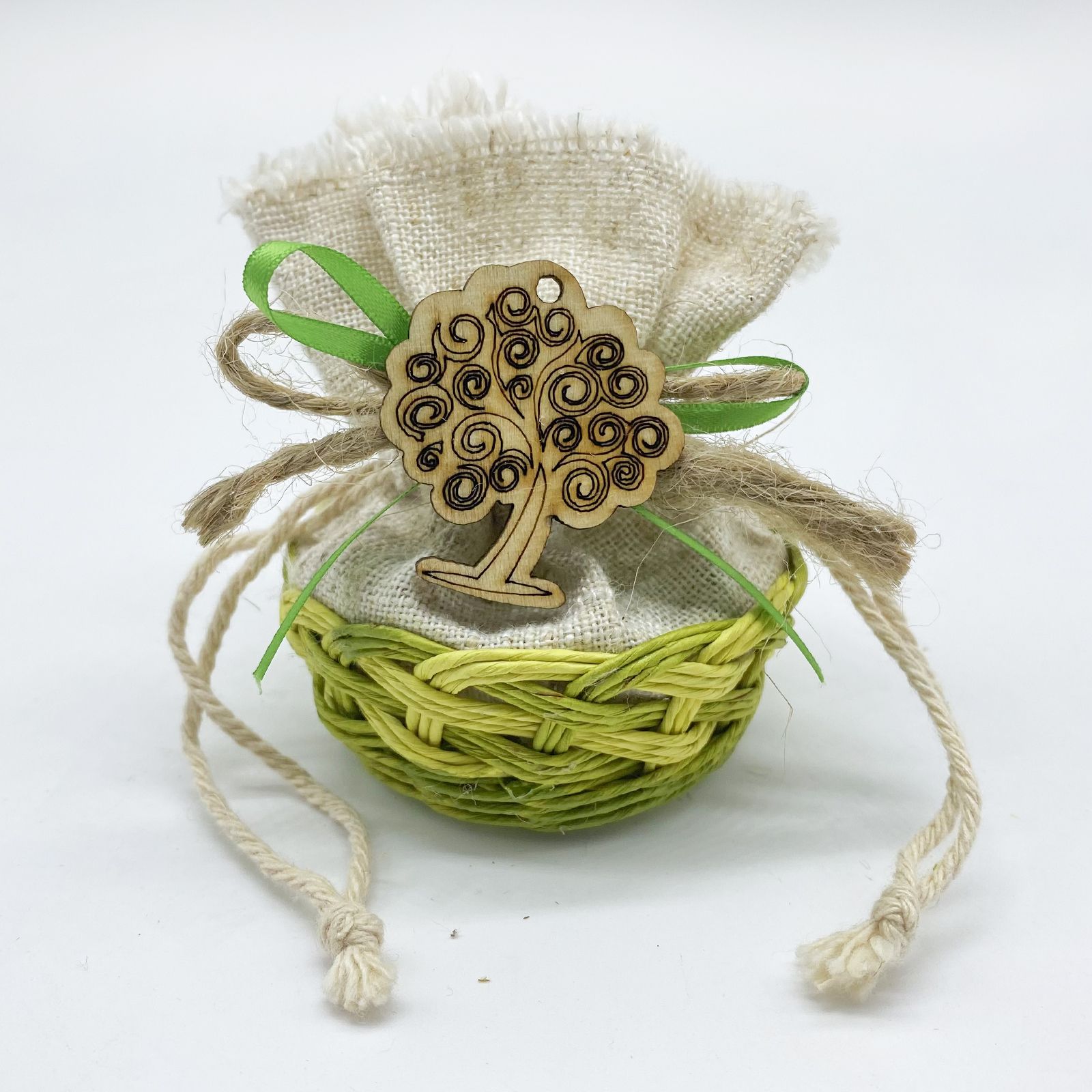 Sacchetti con cestino con lavorazione tipo vimini di colore verdee tessuto in juta naturale con cordoncini tiranti per la chiusura. Applicato al centro, un piccolo ciondolo in legno con albero della vita tenuto al sacchetto attraverso due fiocchi: uno verde in raso e uno in tonalità naturale in corda.