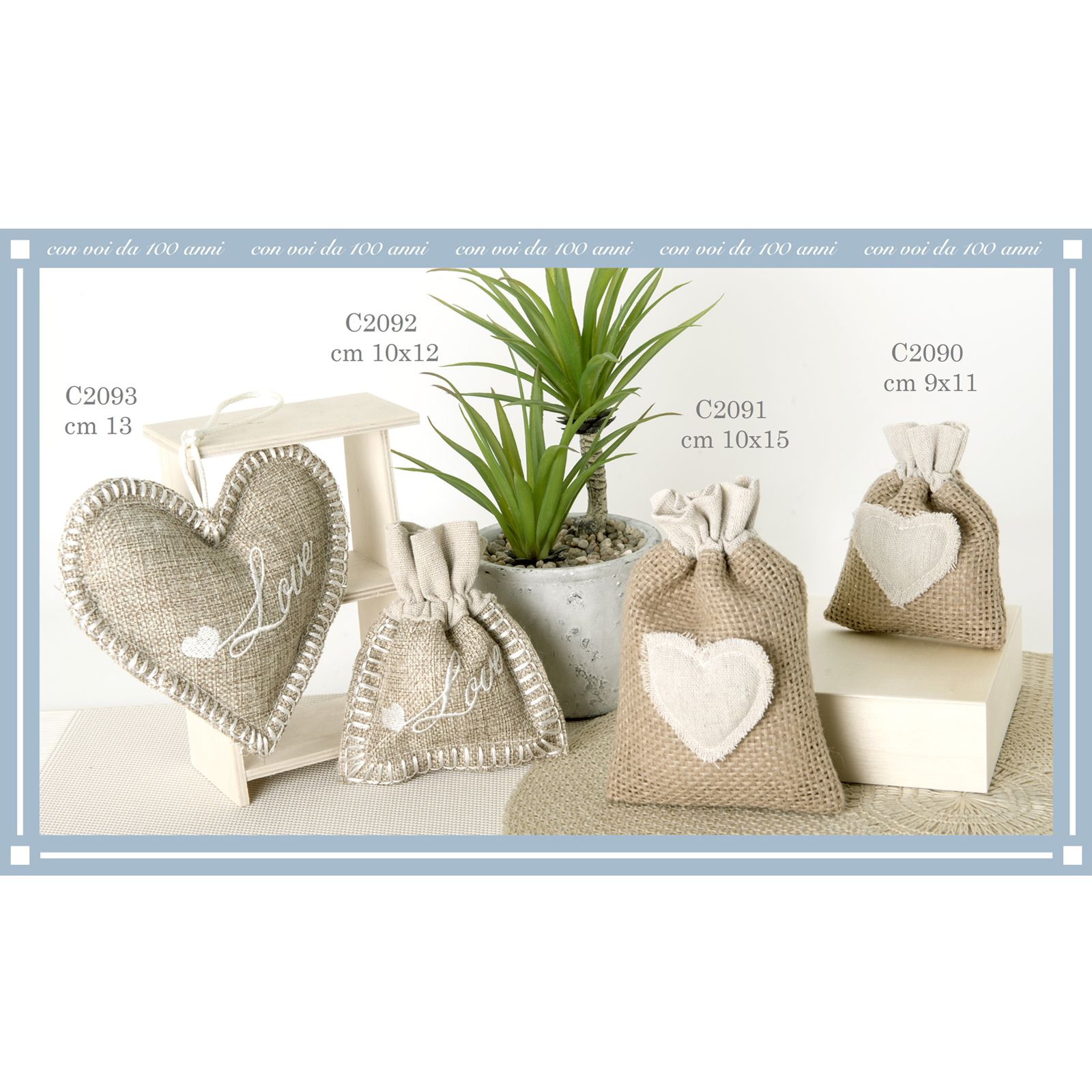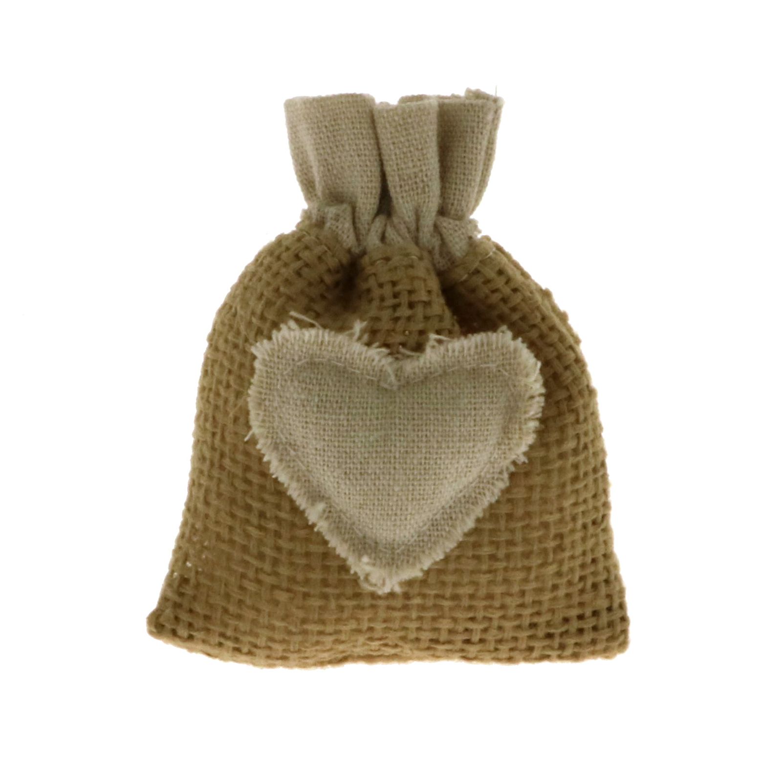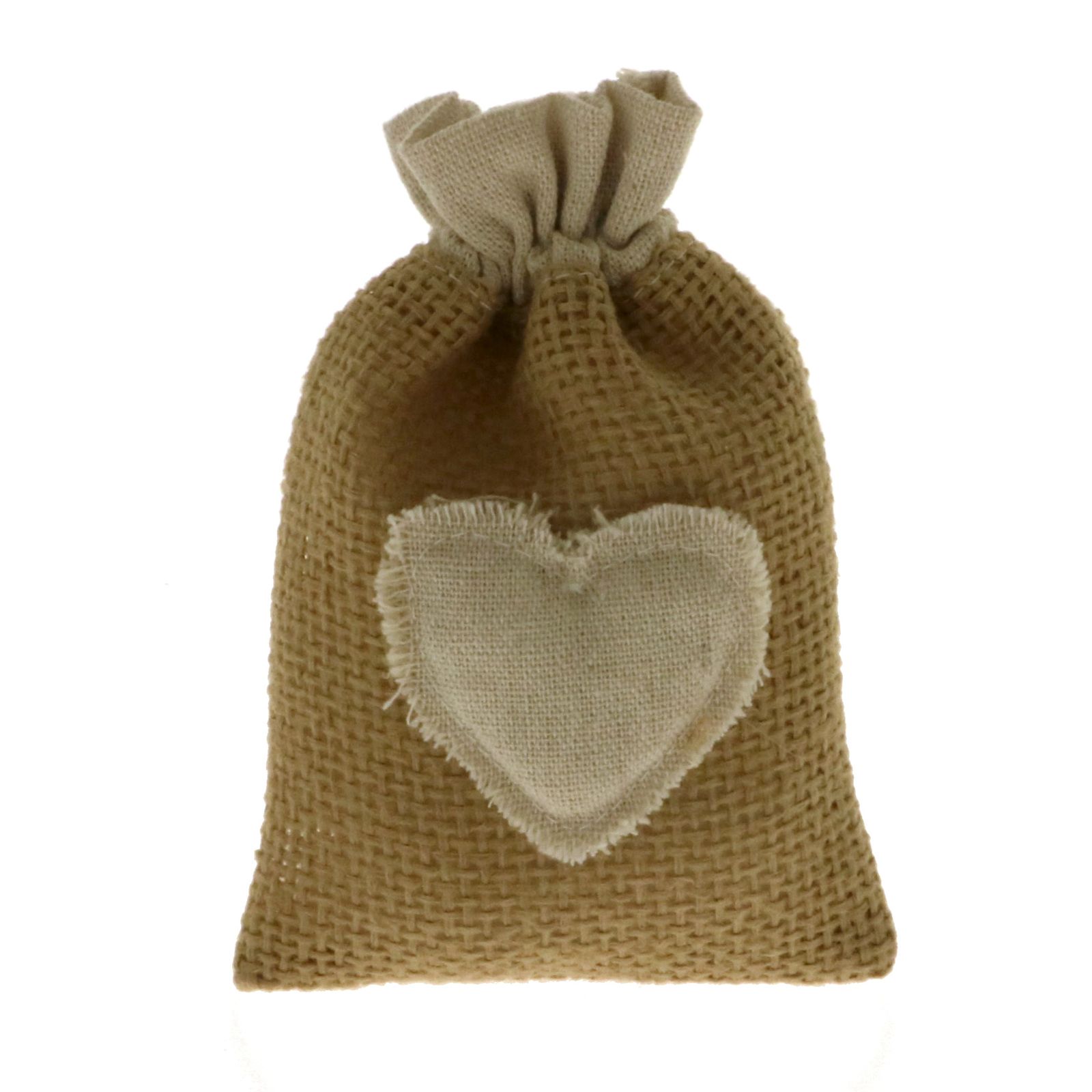 Per te i nostri bellissimi sacchetti in juta avano con cordoncini tiranti in corda e cuore bianco in tessuto centrale.