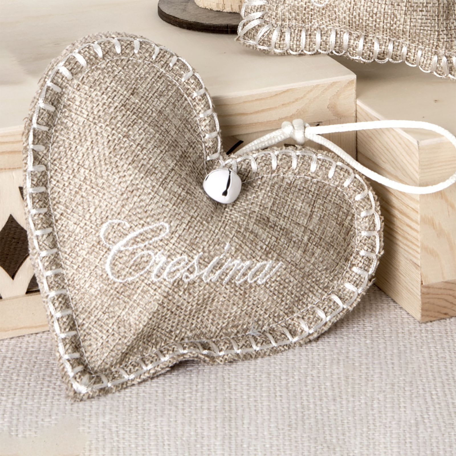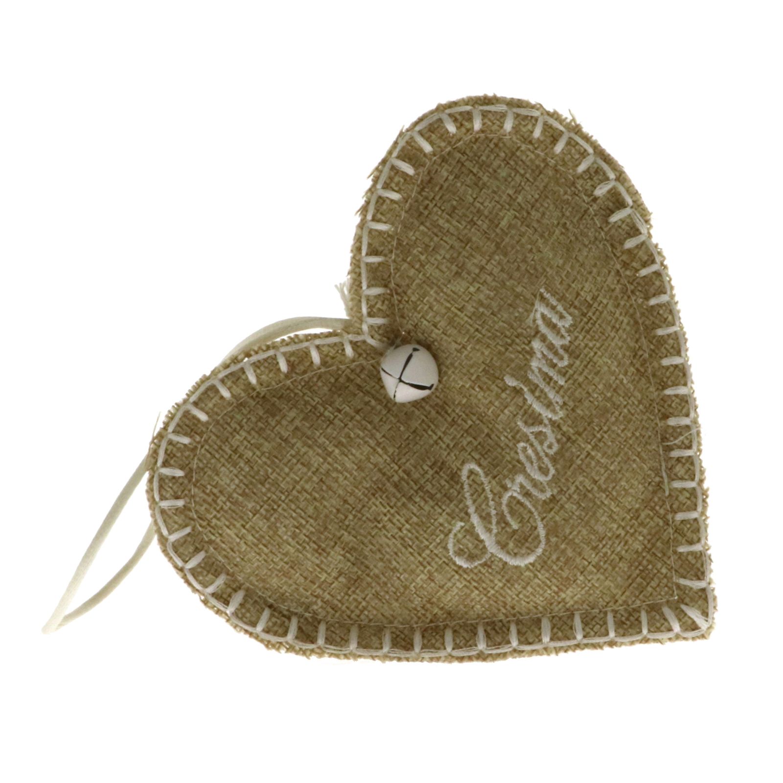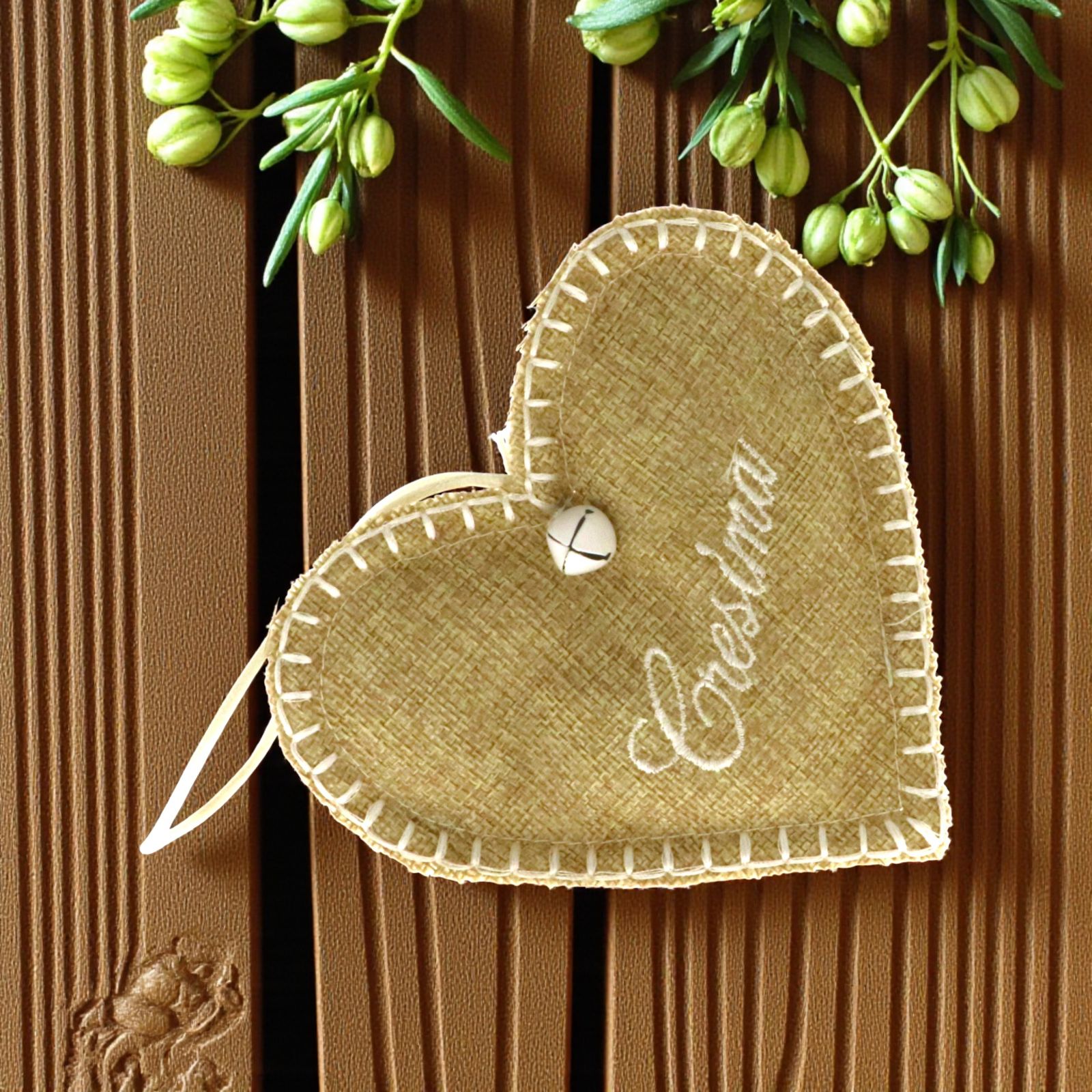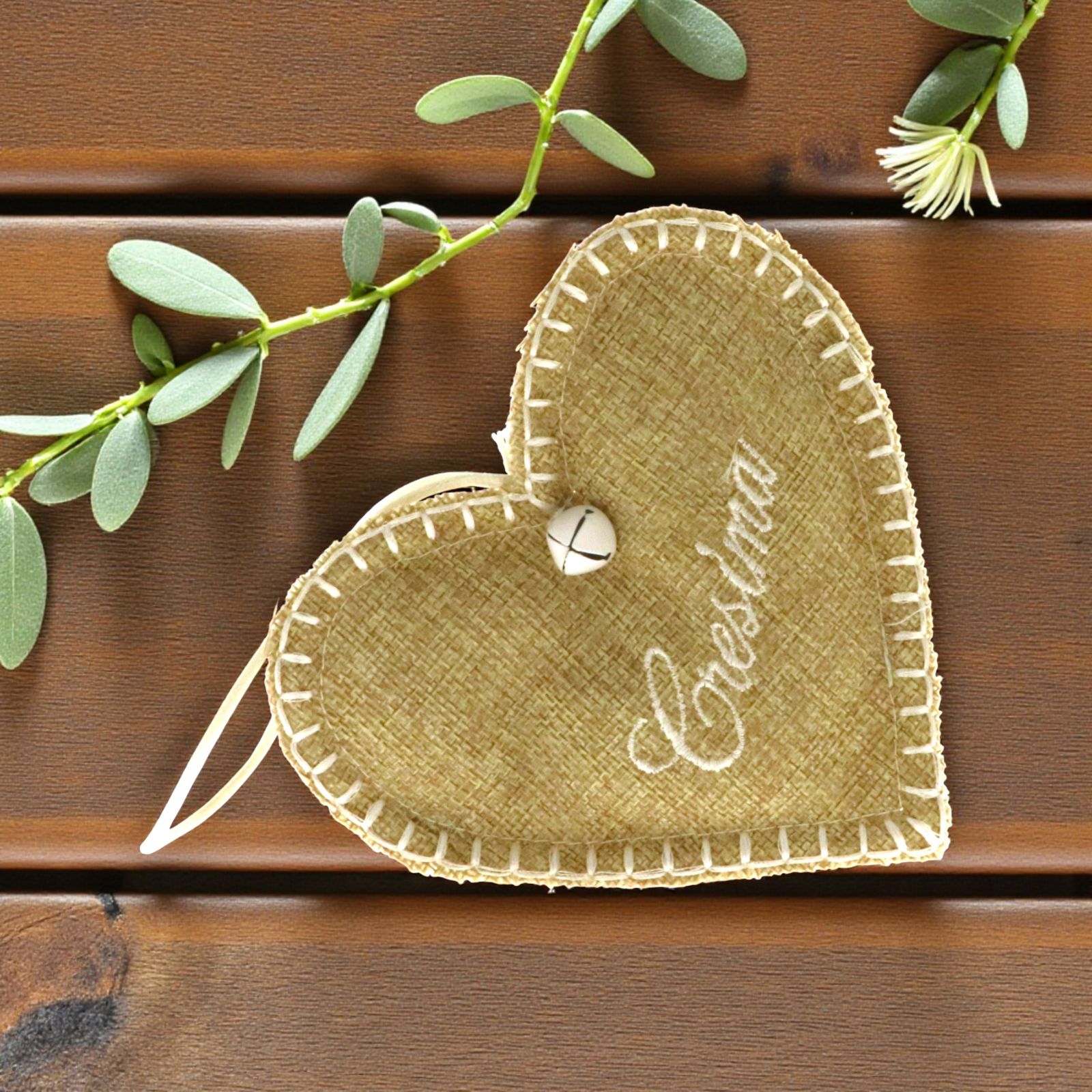 Il sacchettino è realizzato in resistente juta e ha una forma delicata a cuore. La scritta "Cresima" è finemente ricamata sulla superficie, aggiungendo un tocco di eleganza. Il portaconfetti è completo di un cordoncino per poterlo appendere e un piccolo campanellino che aggiunge un suono festoso.