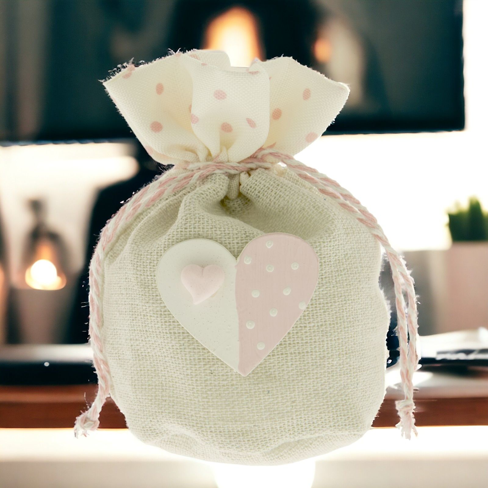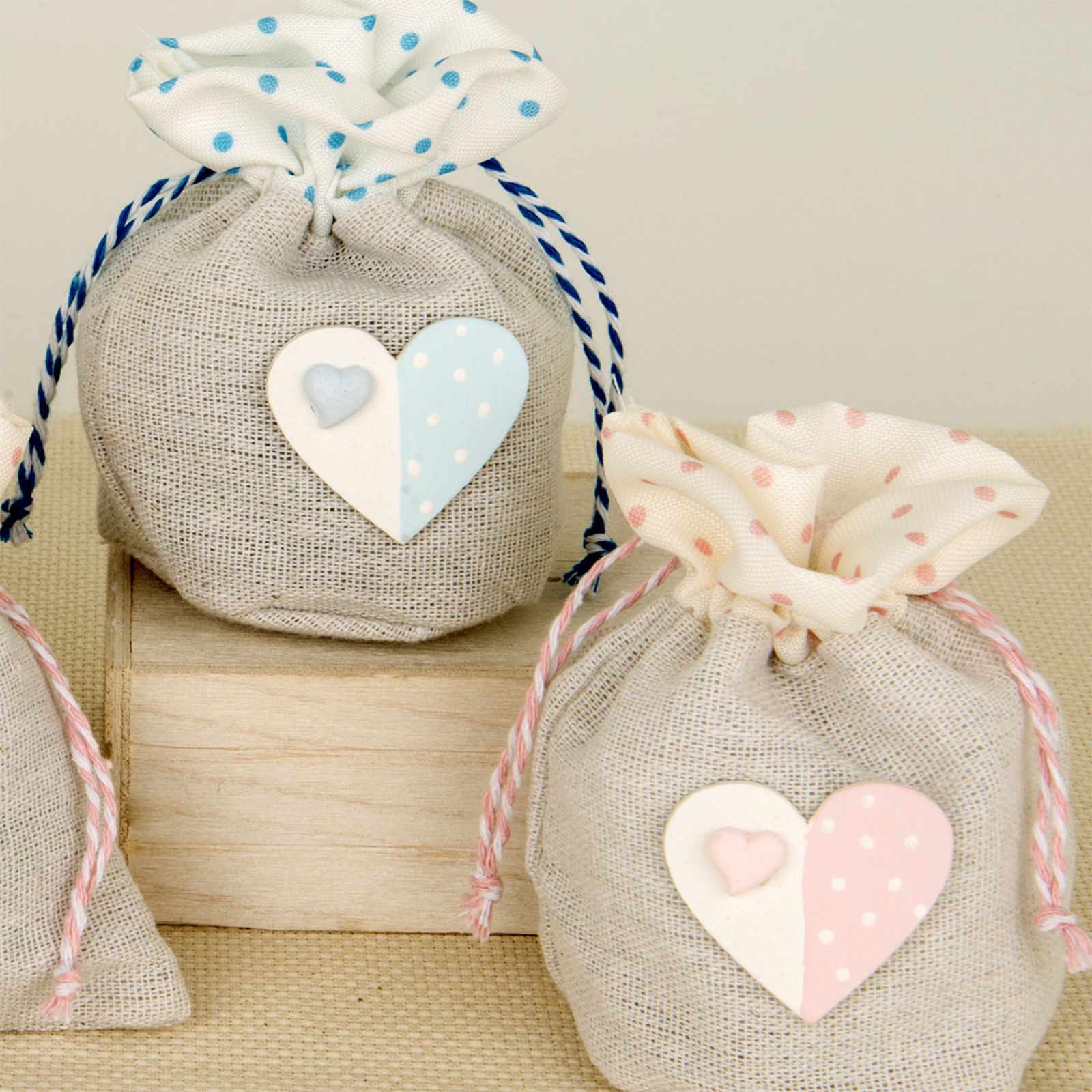 Il sacchettino portaconfetti è realizzato con cura utilizzando materiali di qualità. La sua base in resistente juta e la parte superiore in morbido cotone a pois rosa o celeste creano un contrasto affascinante e delicato. Ogni sacchettino presenta un grazioso cuoricino applicato, metà bianco e metà rosa o celeste a pois, aggiungendo un tocco di dolcezza e romanticismo. Ogni pezzo è dotato di tiranti rosa o blu che aggiungono un tocco di grazia e facilitano la chiusura del sacchettino.