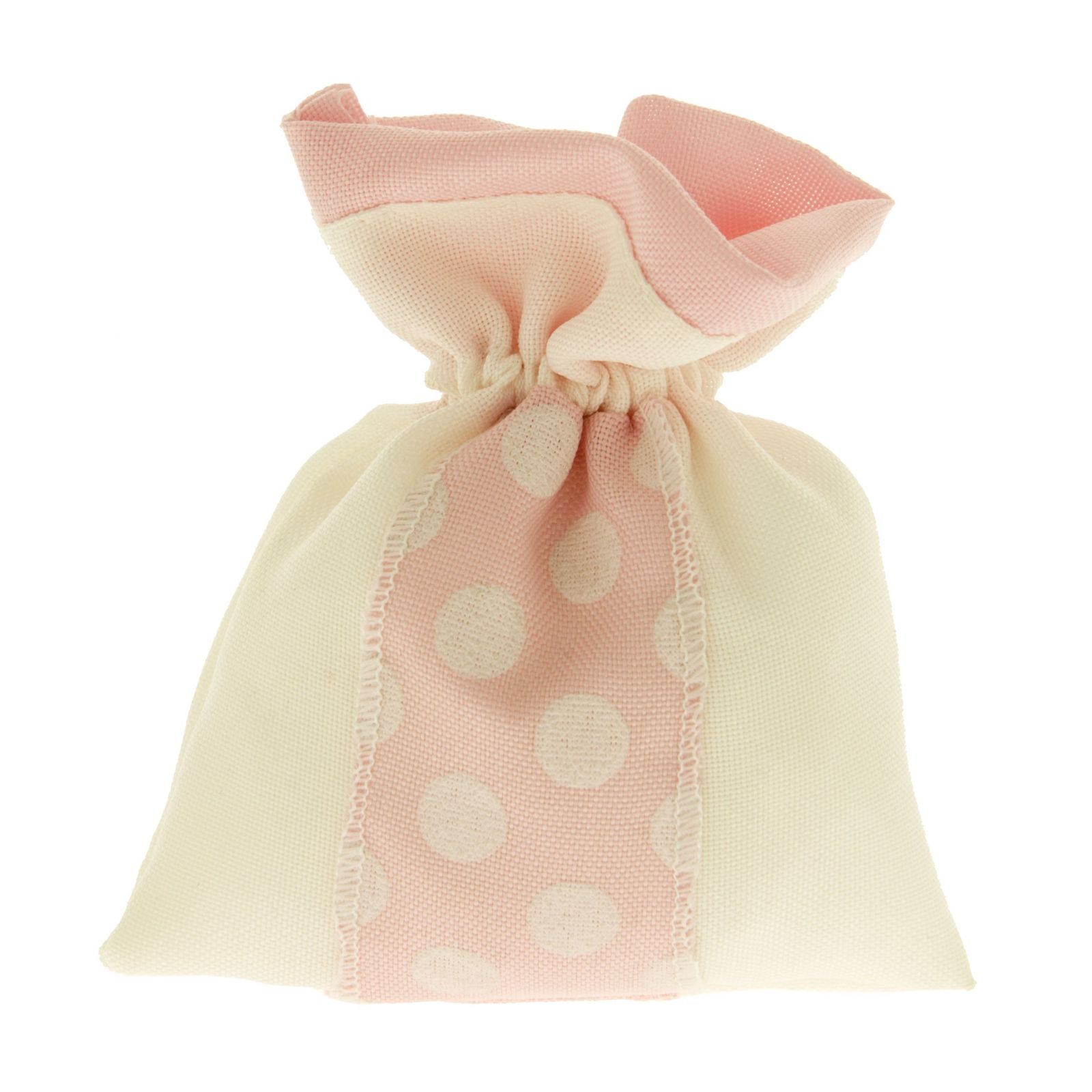 Questi sacchettini sono realizzati in morbidissimo tessuto di colore bianco e rosa con pois.