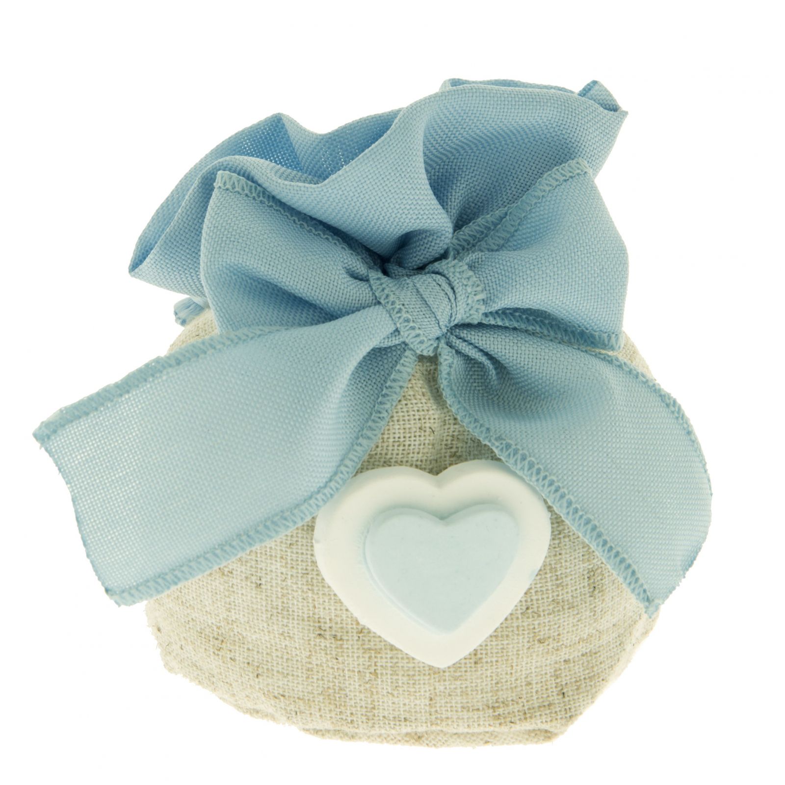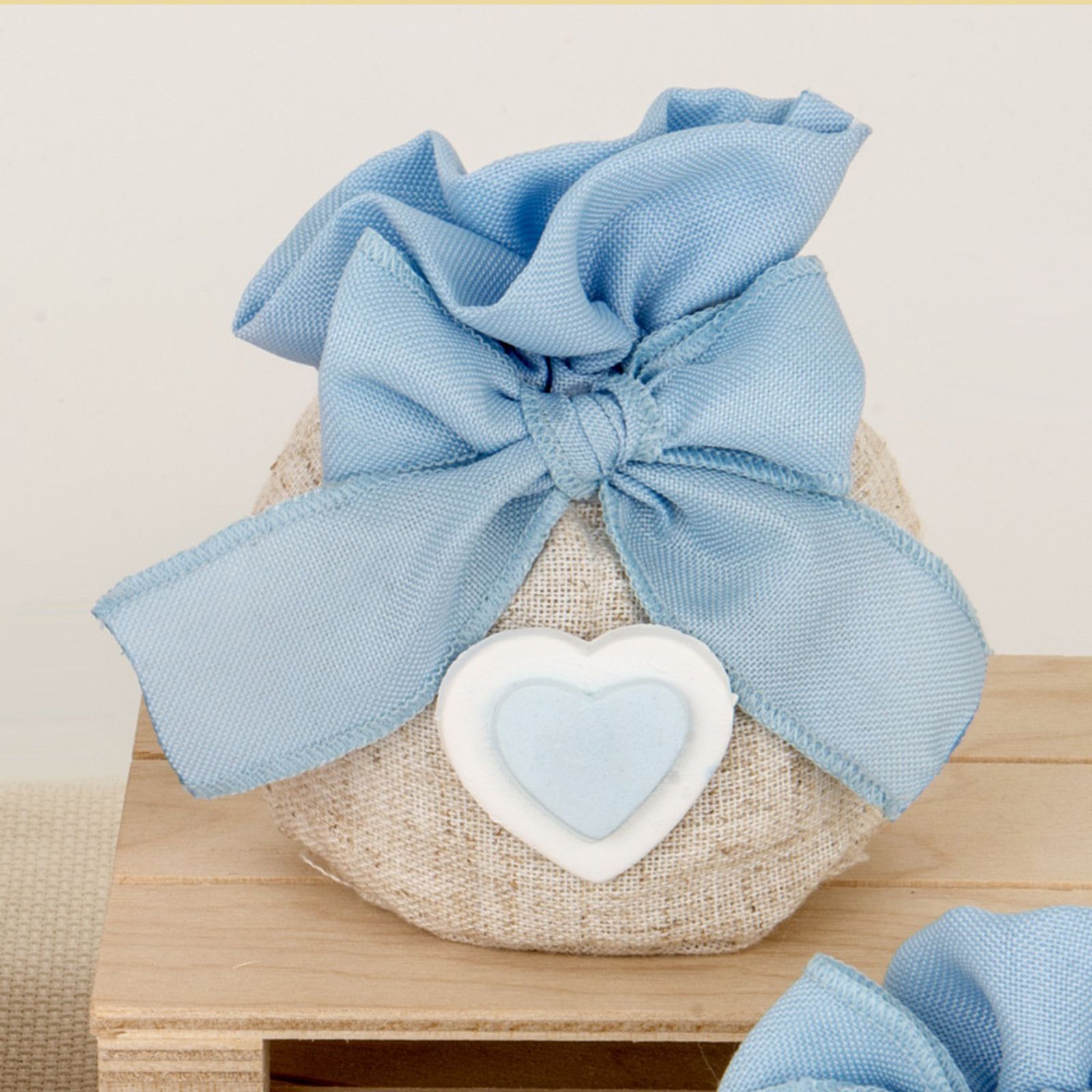 Misura 10 cm circa ed è caratterizzato da un mix di colori cielo, bianco e sacco: un perfetto connubio tra un aspetto rustico e raffinato. Economico e adatto anche come addobbo per il tuo sweet table, è pronto per essere donato ad ogni ospite alla fine della festa per portare via con sé un ricordo indimenticabile.