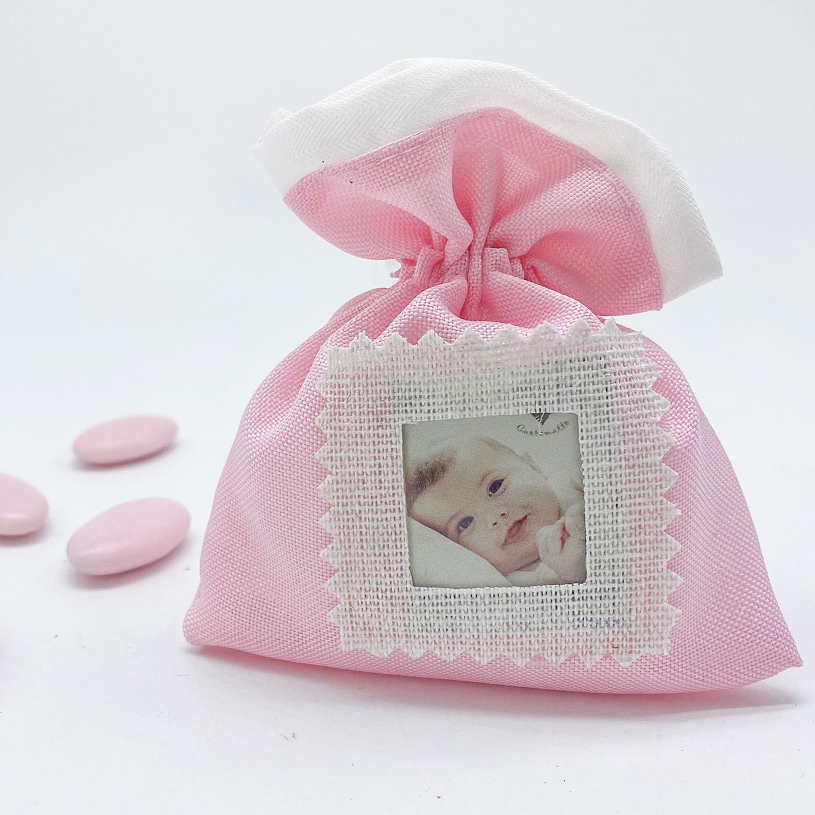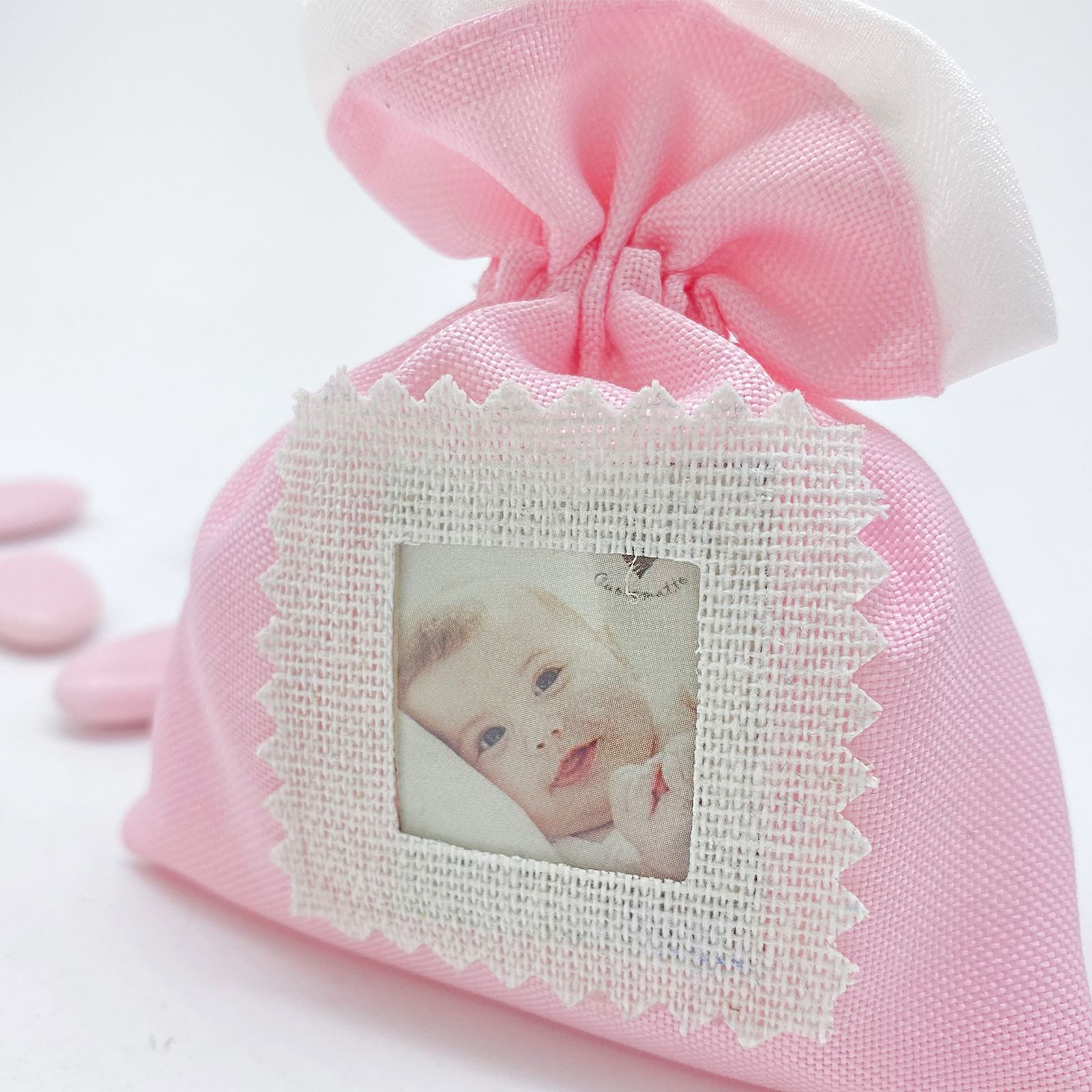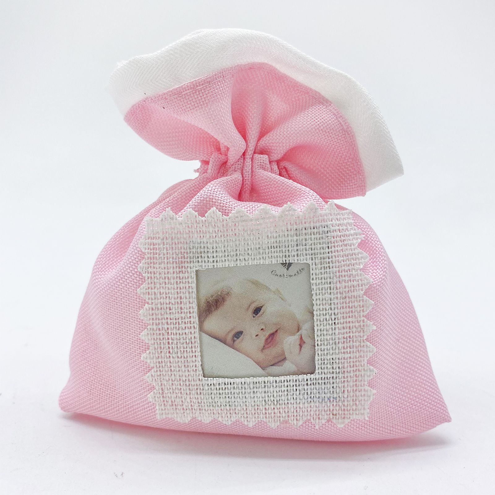 Regala ai tuoi ospiti un sorprendente e unico dono con la nostra bomboniera Sacchetto porta confetti in Tessuto Cotone grezzo colore Rosa con inserto riquadro per bigliettino con data e nome o per foto bambina. La bomboniera ha una dimensione di 10 x 12 cm circa ed è ideale per eventi come battesimi, compleanni, nascite o qualsiasi altra festa a tema.