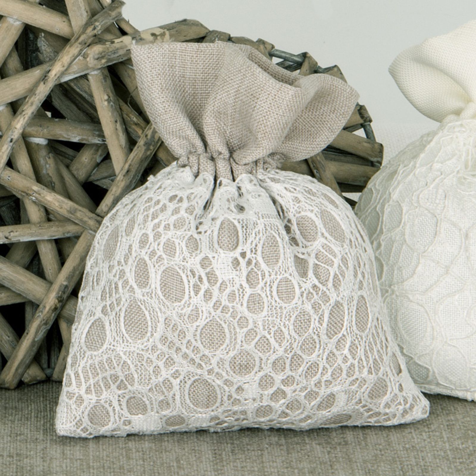 Regala un porta confetti in tessuto avorio e simil pizzo bianco con tirante per matrimoni, anniversari, comunione, cresime e altri eventi. Questo regalo di fine festa per invitati misura 10x12 cm e può essere anche utilizzato come contenitore di piccoli oggetti. Nonostante sia economico, regala ai tuoi ospiti un tocco di raffinatezza ed eleganza, perfetto come addobbo tavolo torta o come segnaposto. La bomboniera è un regalo che esprime le tue emozioni e può far sentire gli invitati speciali e importanti. Offri loro un'esperienza indimenticabile, con la tua bomboniera!