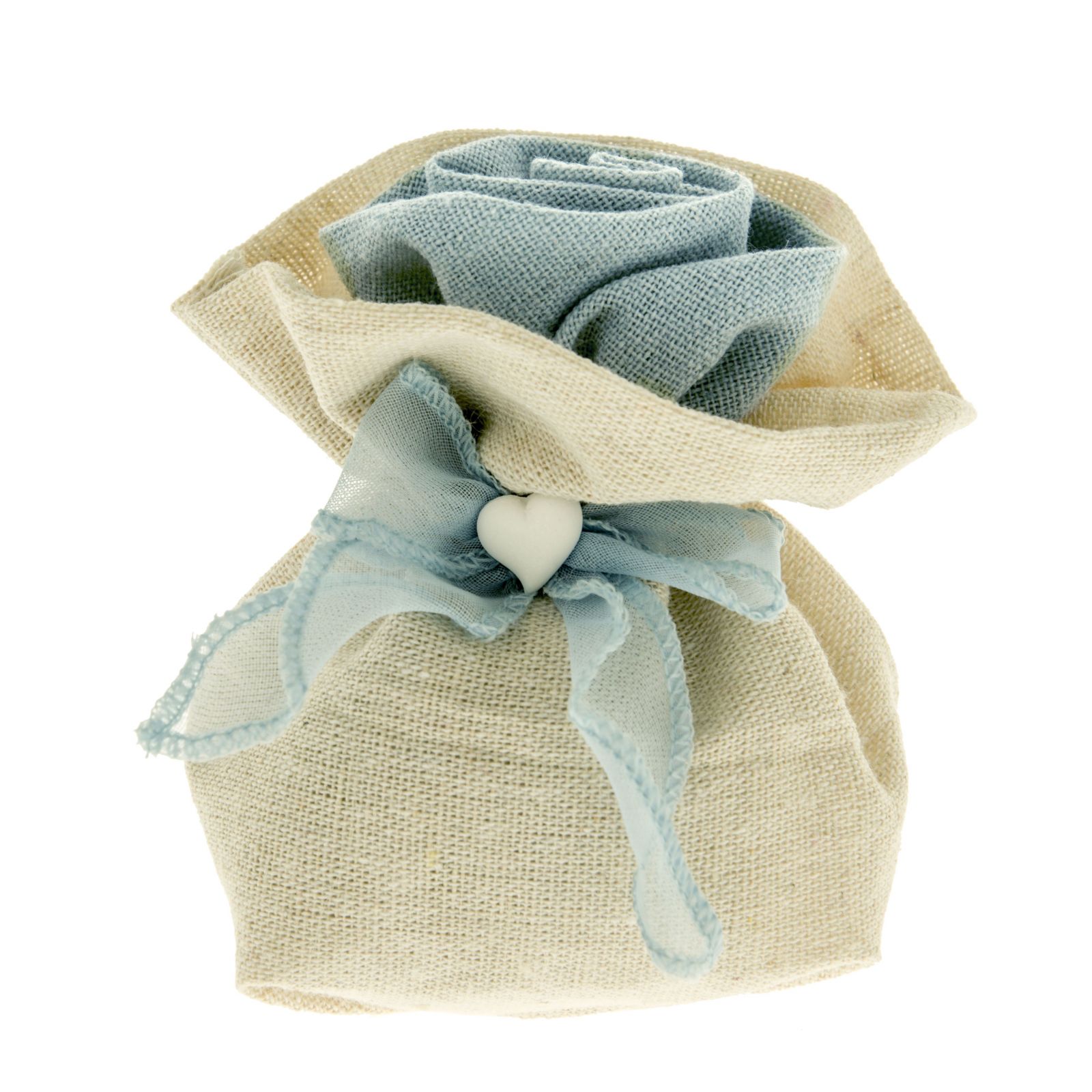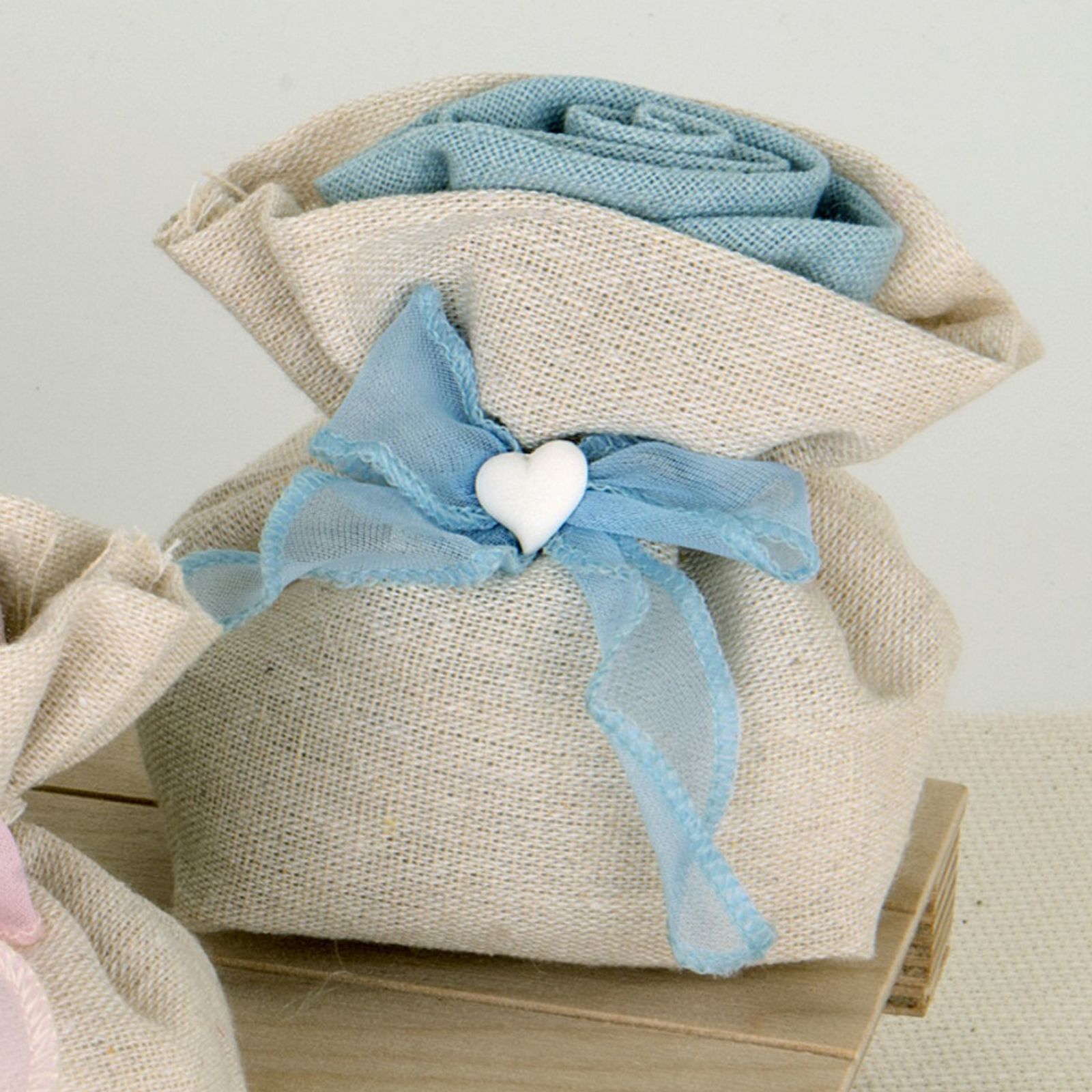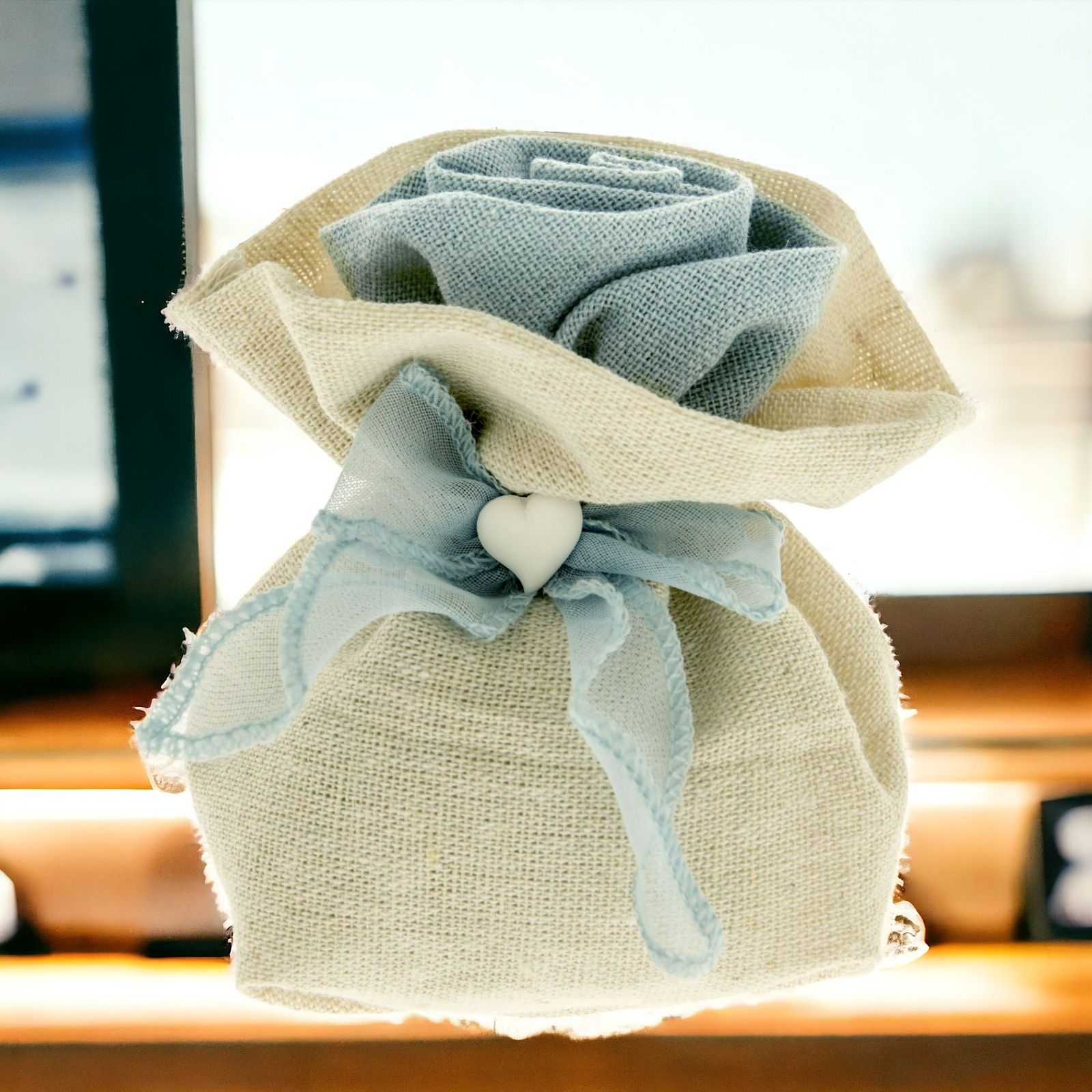 Regala un porta confetti originale ed elegante con la linea Rosita! Questo sacchetto per confetti in tessuto effetto juta avorio con fiocco azzurro e cuoricino bianco sulla parte frontale, e rosa azzurra sulla parte superiore alla chiusura, ha un aspetto raffinato e dona un tocco di stile in più al tuo evento. Trasmetterai ai tuoi ospiti un segnale di profonda cura e apprezzamento. La linea Rosita è un regalo di fine festa economico, ma di grandissimo impatto. Il sacchetto è ideale come segnaposto, per addobbare il tavolo della torta oppure per contenere piccoli oggetti che gli invitati potranno portare a casa come ricordo. Misura 11 cm circa.