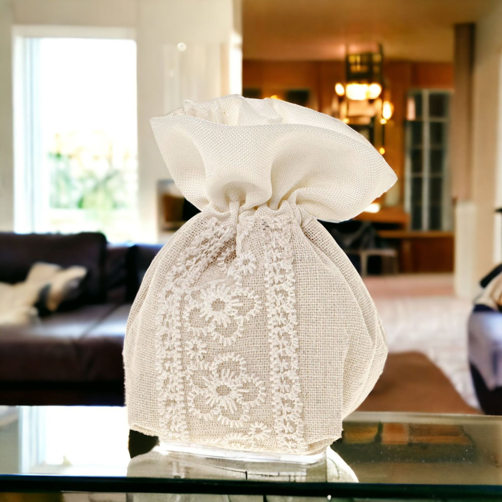 Questo sacchetto tondo portaconfetti con ricamo e merletto con fiorellini è un'ottima idea regalo per qualsiasi evento, come prima comunione, santa cresima, matrimonio, anniversario. Realizzato in juta, misura circa 10x12cm ed è beige. Una bomboniera originale e elegante per una confettata indimenticabile.