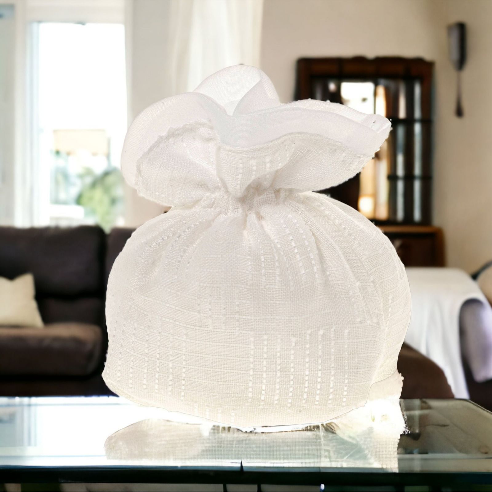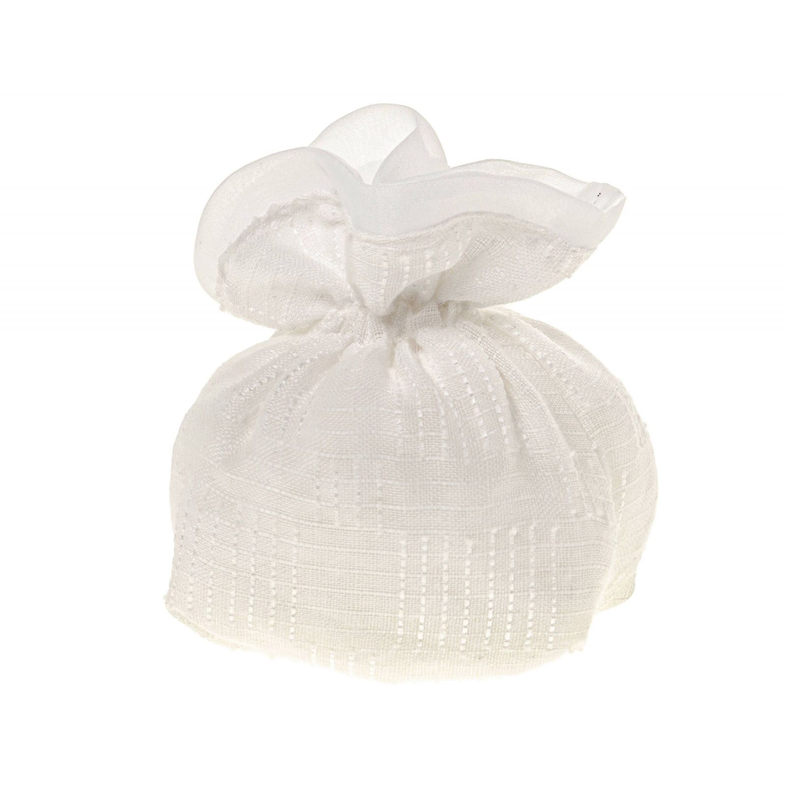 Regala un sacchetto portaconfetti con base quadrata panna e tessuto disegnato a righe per la confettata più originale e più elegante. Realizzato in cotone di dimensione cm 10 circa, è perfetto per ogni evento come prima comunione, santa cresima, matrimonio, anniversario e tanti altri.