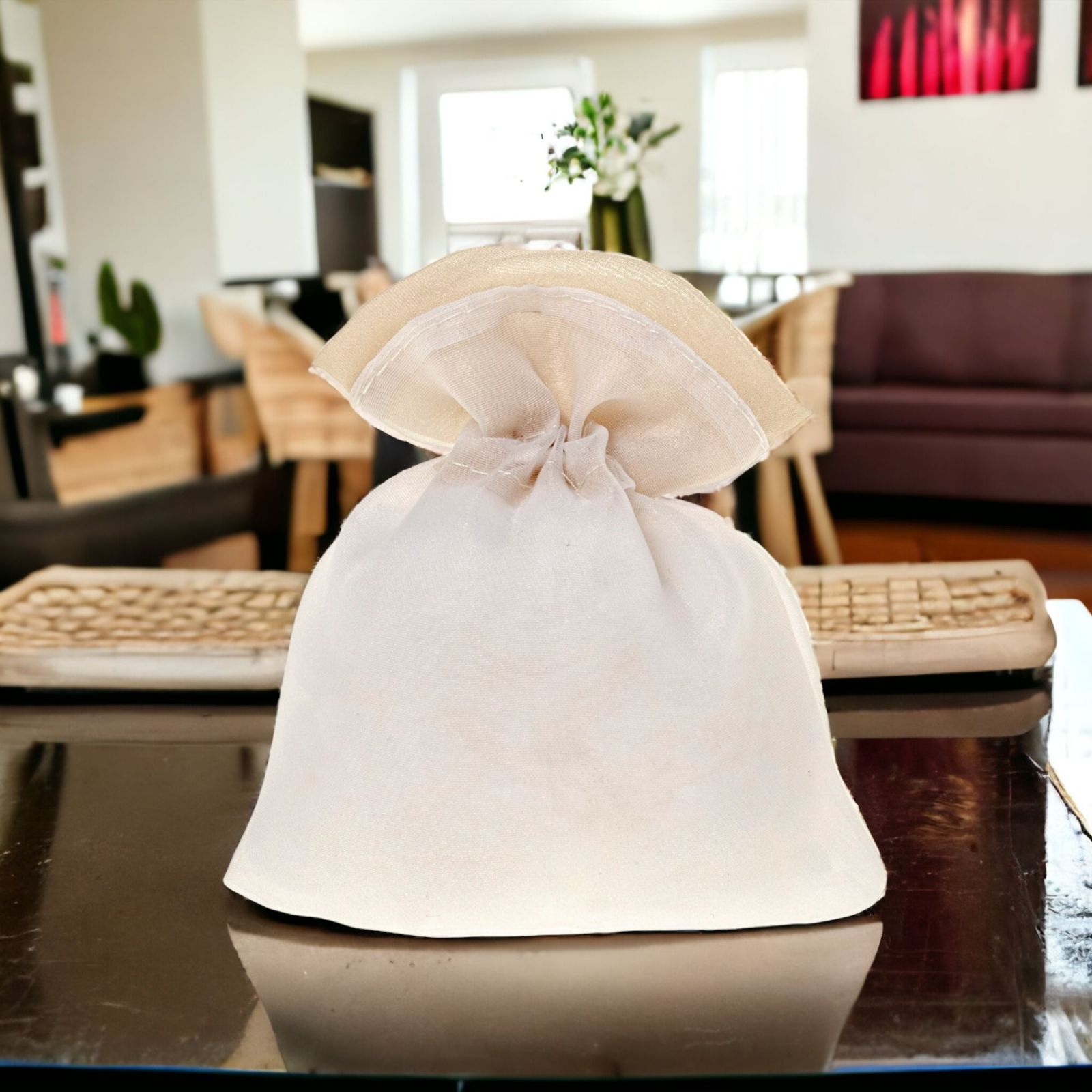 La bomboniera è un dono tradizionale per i tuoi invitati, un gesto di ringraziamento e di apprezzamento per la loro partecipazione. Per questo motivo, questo sacchetto portaconfetti bicolore bianco con parte superiore beige è la soluzione perfetta per rendere speciale il tuo evento.