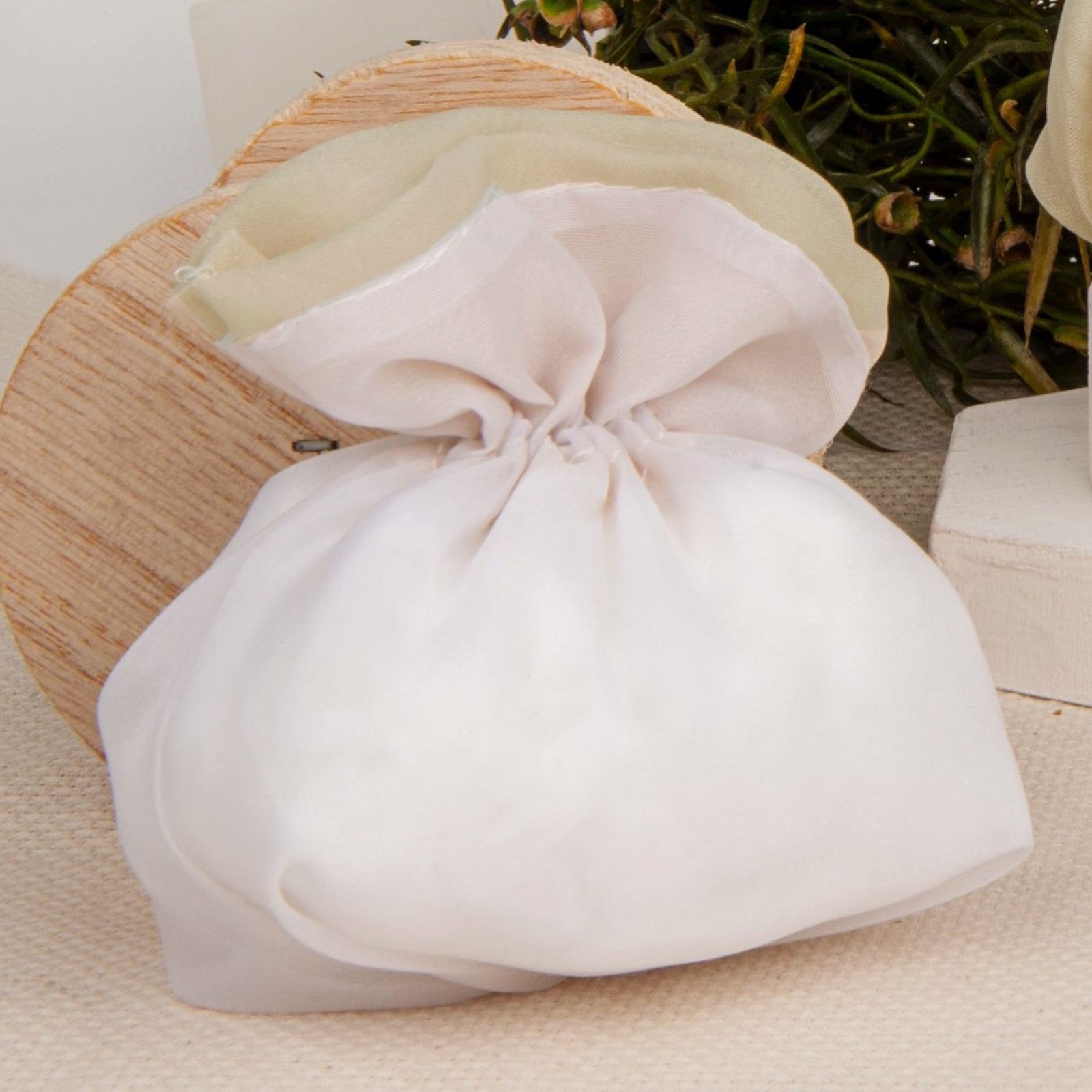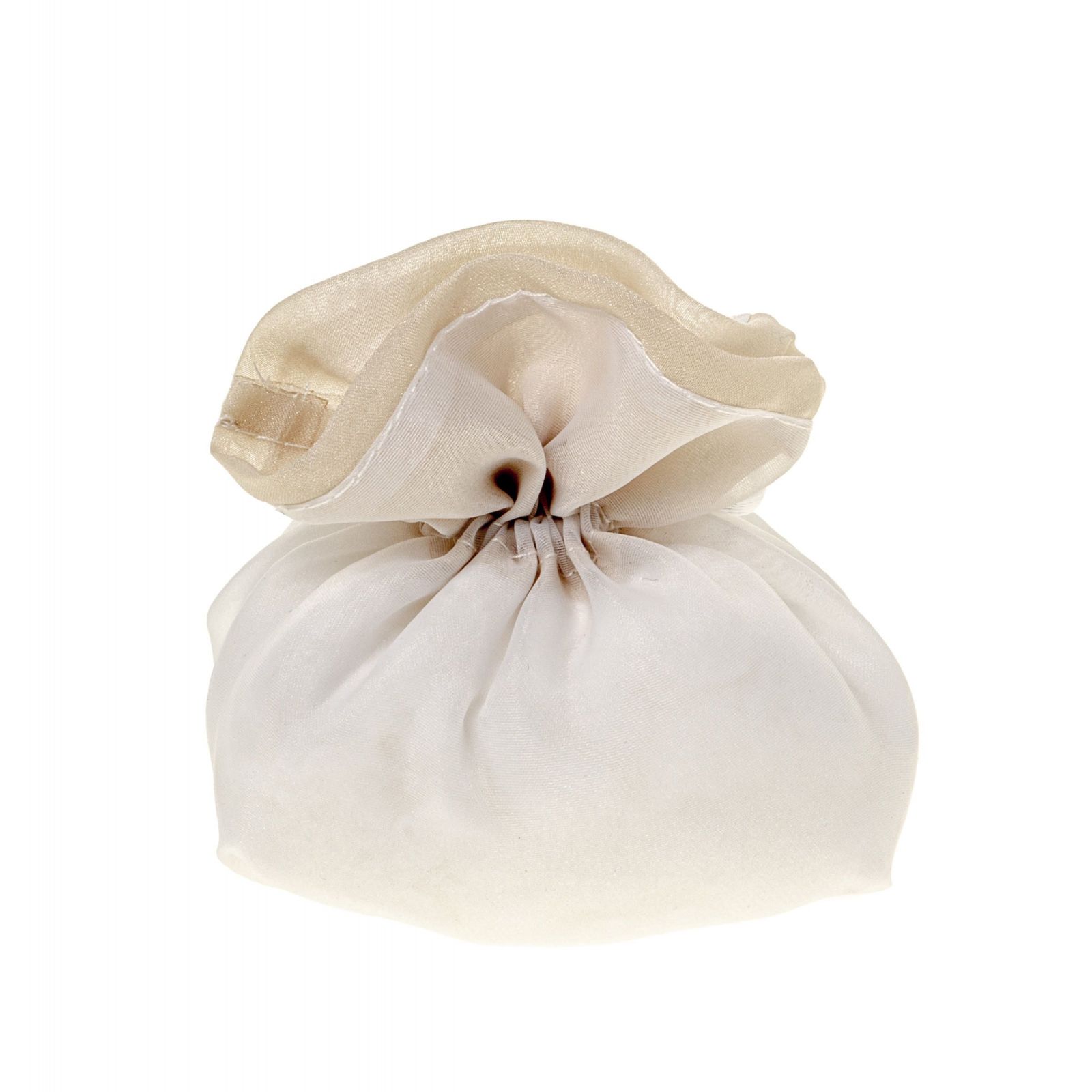 Regala un sacchetto portaconfetti tondo bicolore bianco con parte superiore beige, perfetto per chi desidera una confettata elegante.