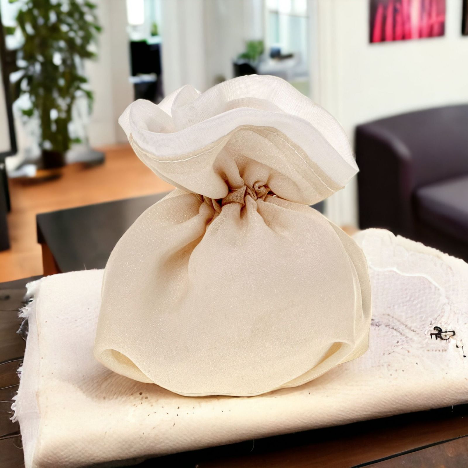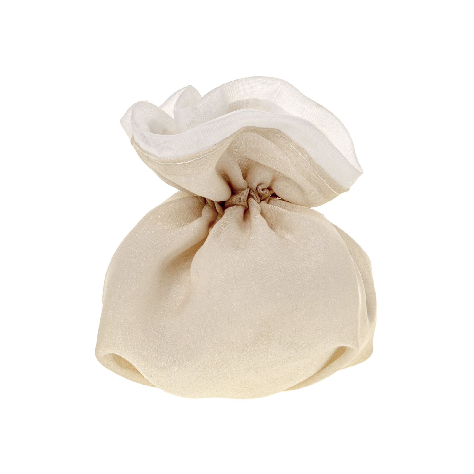 Regalare un sacchetto portaconfetti tondo bicolore è un modo unico ed originale per concludere una confettata in modo elegante. Realizzato con una parte inferiore color crema ed una parte superiore color panna, questo sacchetto portaconfetti misura circa 10x12 cm e presenta un materiale in cotone che lo rende resistente.