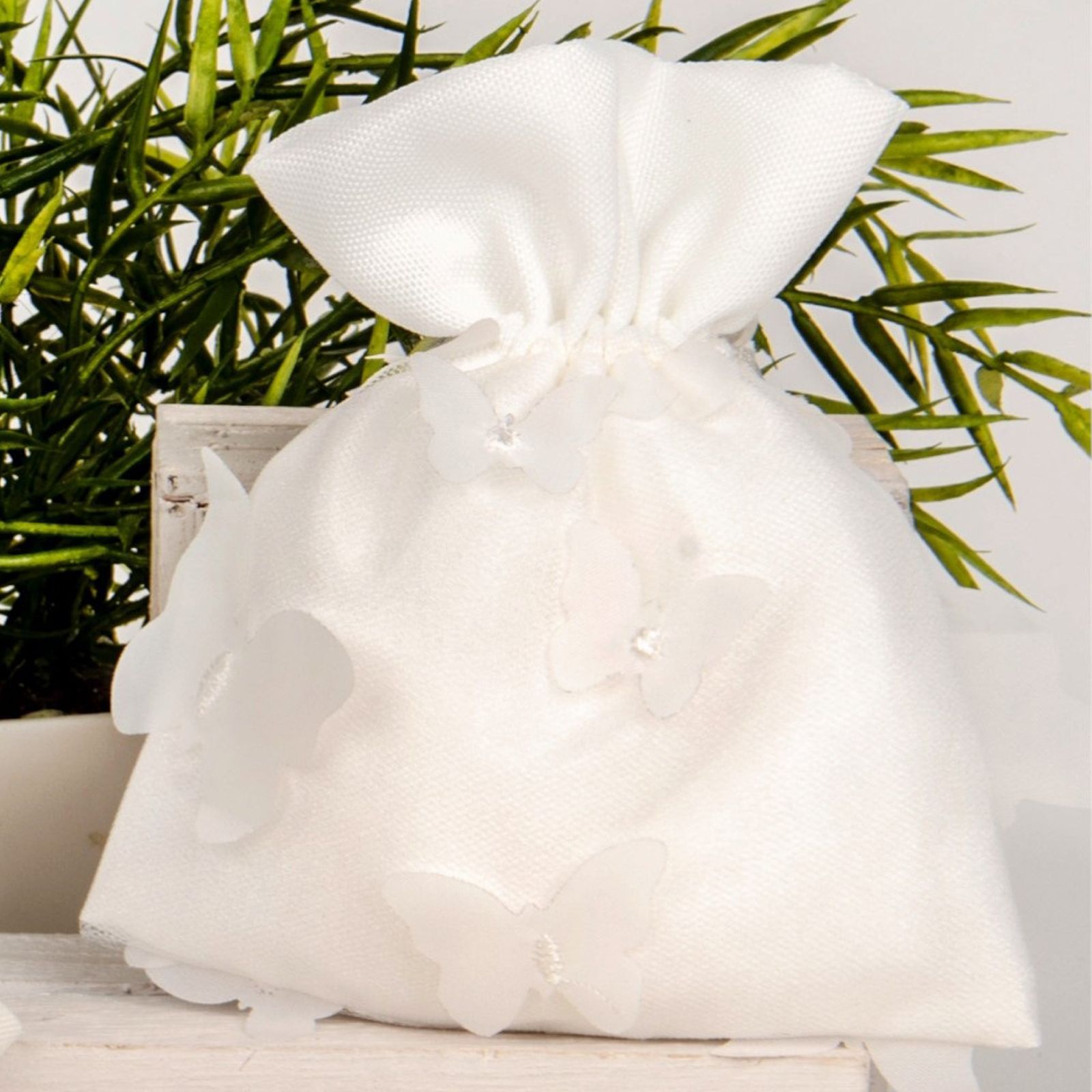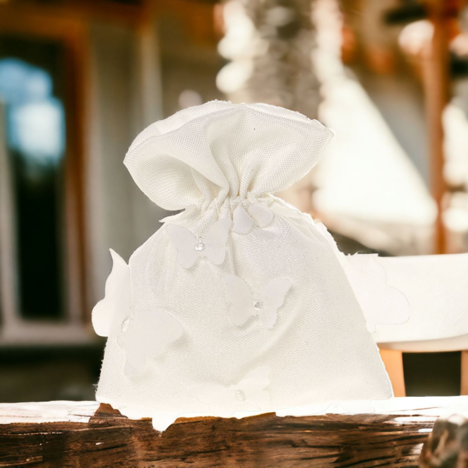 Aggiungi un tocco di grazia e raffinatezza alle tue celebrazioni con il nostro sacchetto portaconfetti in cotone bianco impreziosito da delicate applicazioni di farfalle in tessuto.
