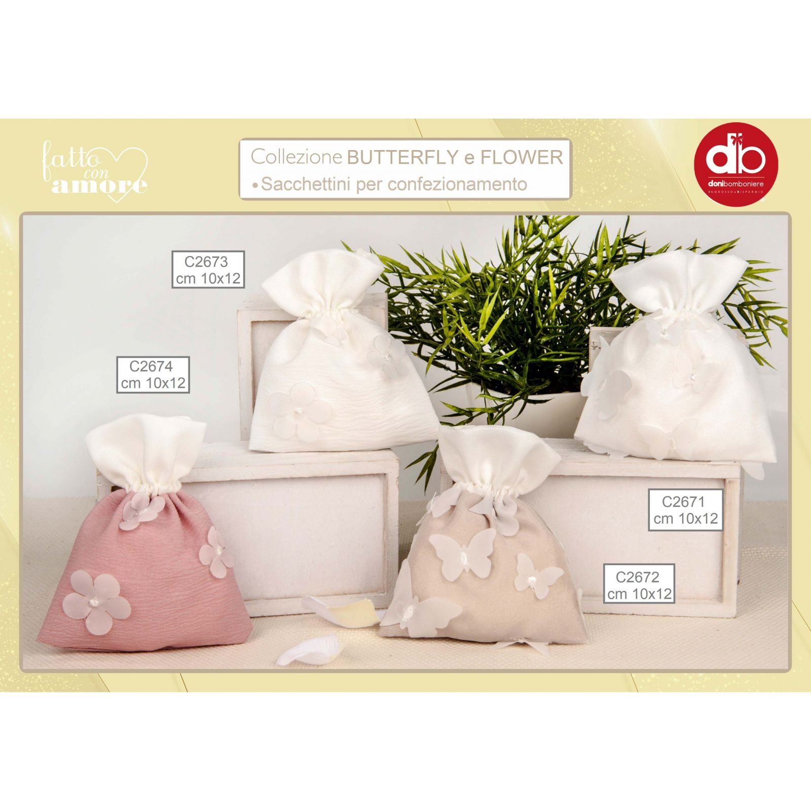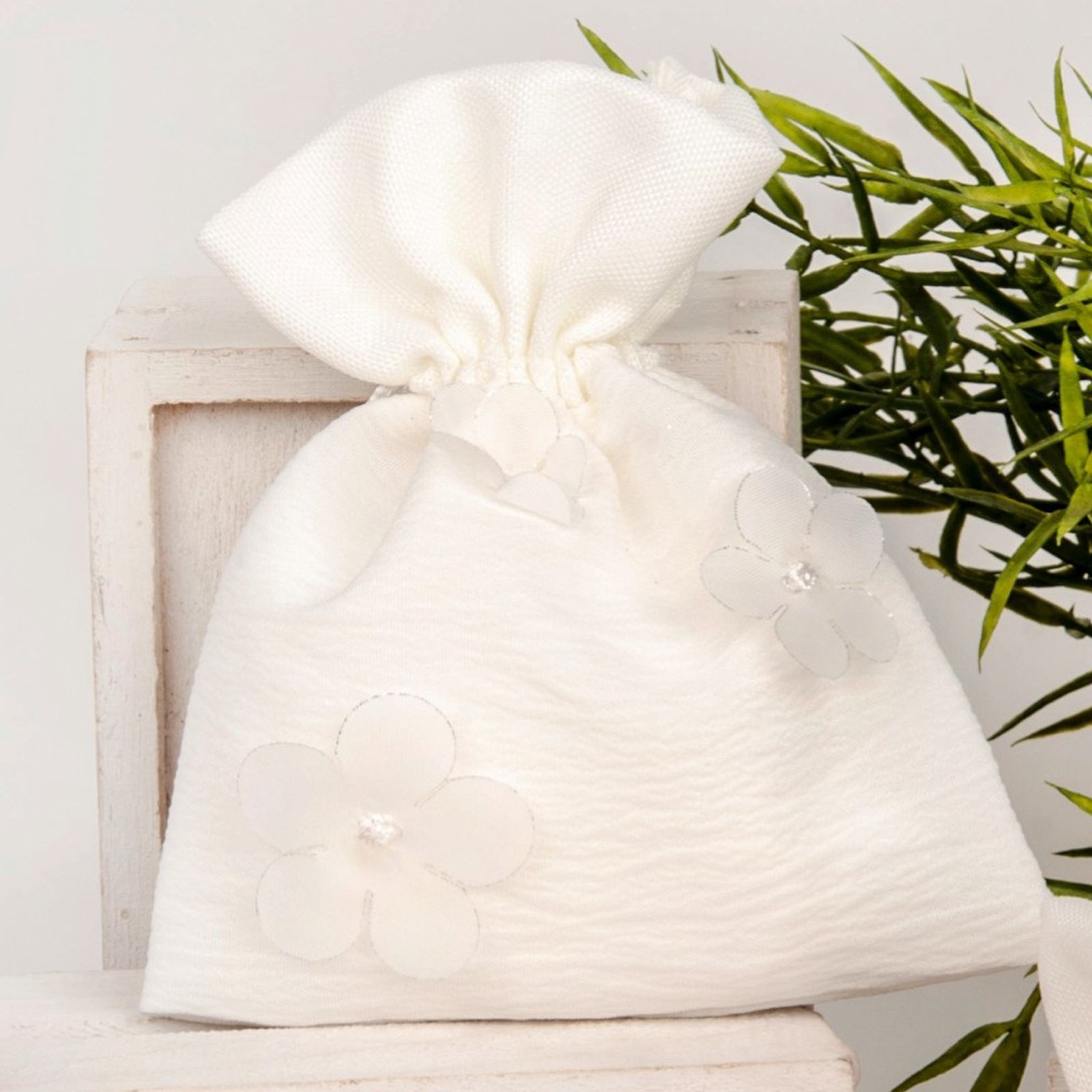Sorprendi i tuoi ospiti con un tocco di eleganza straordinaria grazie al nostro Sacchetto Portaconfetti Bianco, splendidamente ornato con fiorellini in tessuto.