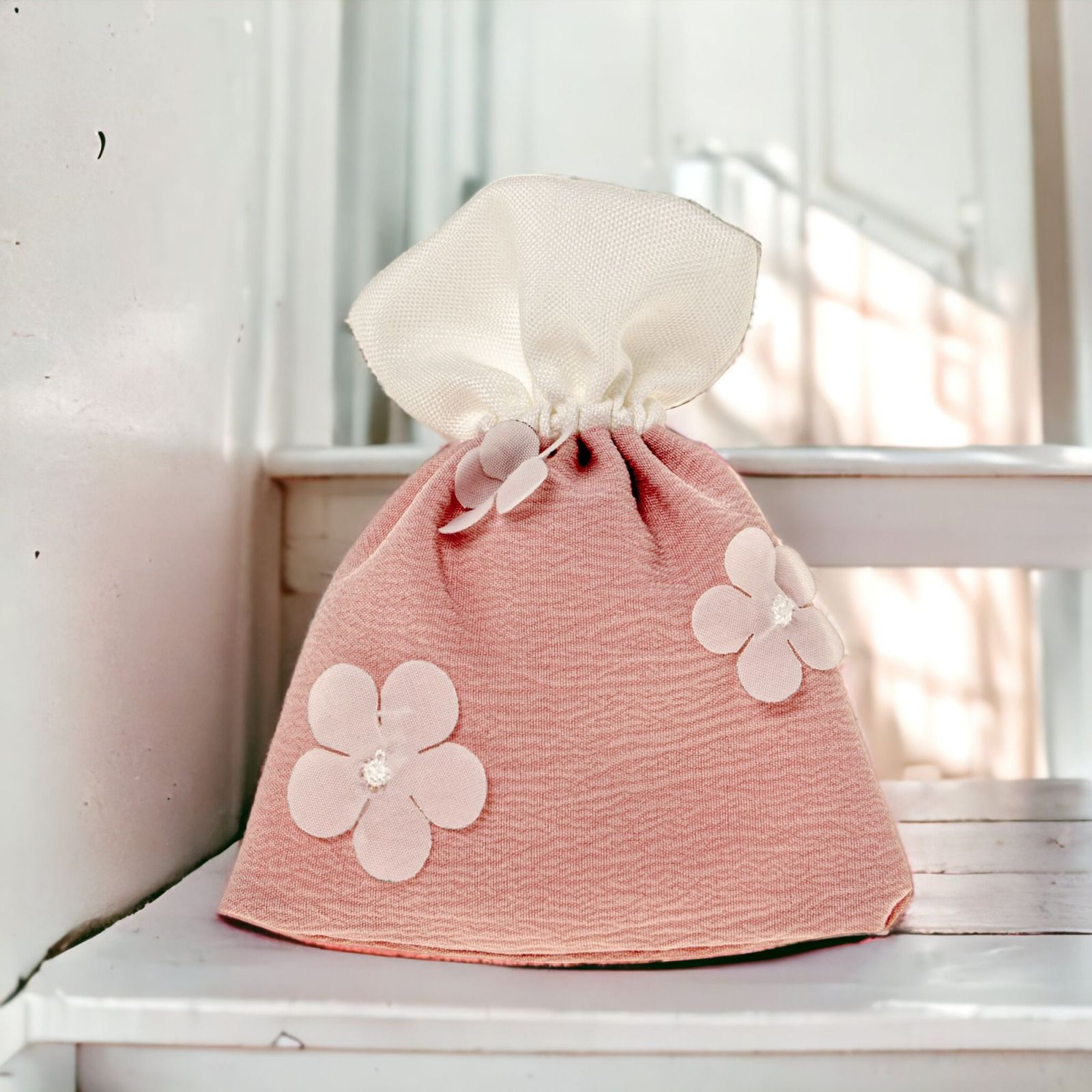 Scegli il sacchetto portaconfetti rosa con applicazioni di fiorellini in tessuto bianco per ricordare un giorno speciale con un dono speciale. E' adatto a qualsiasi occasione e renderà la tua confettata ancora più elegante e sorprendente.