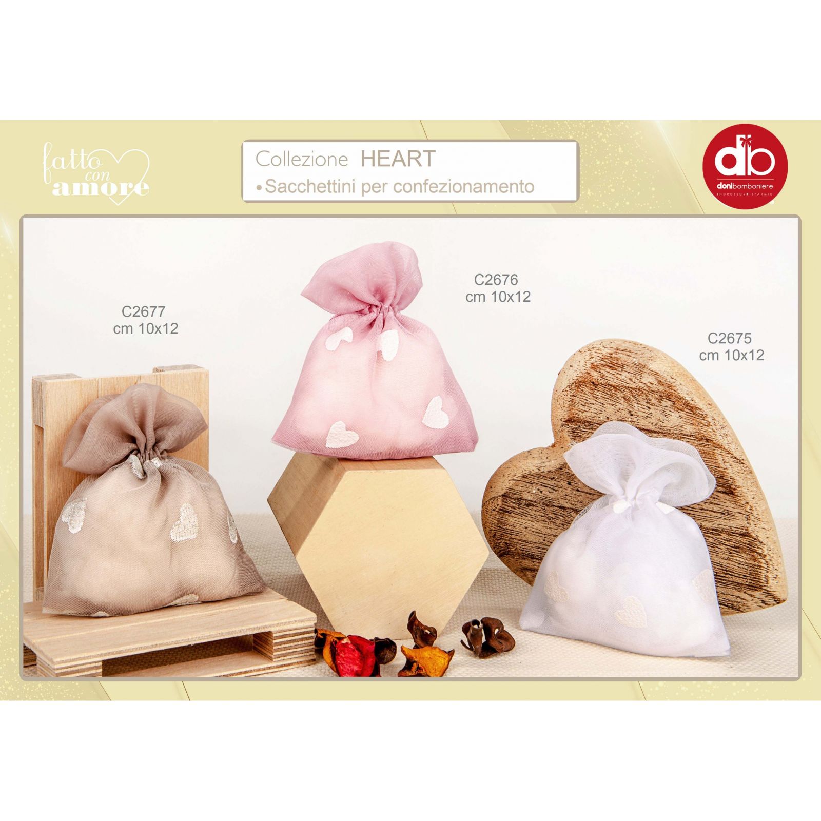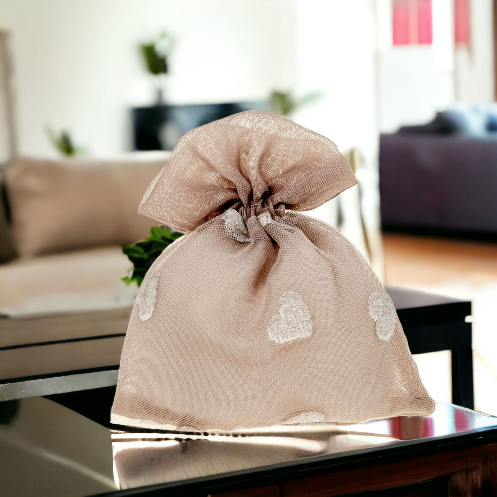 Questo delizioso sacchetto portaconfetti è realizzato in organza di alta qualità, nella combinazione di colori beige e bianco. I cuoricini bianchi decorano delicatamente il sacchetto, aggiungendo un tocco romantico ed elegante.