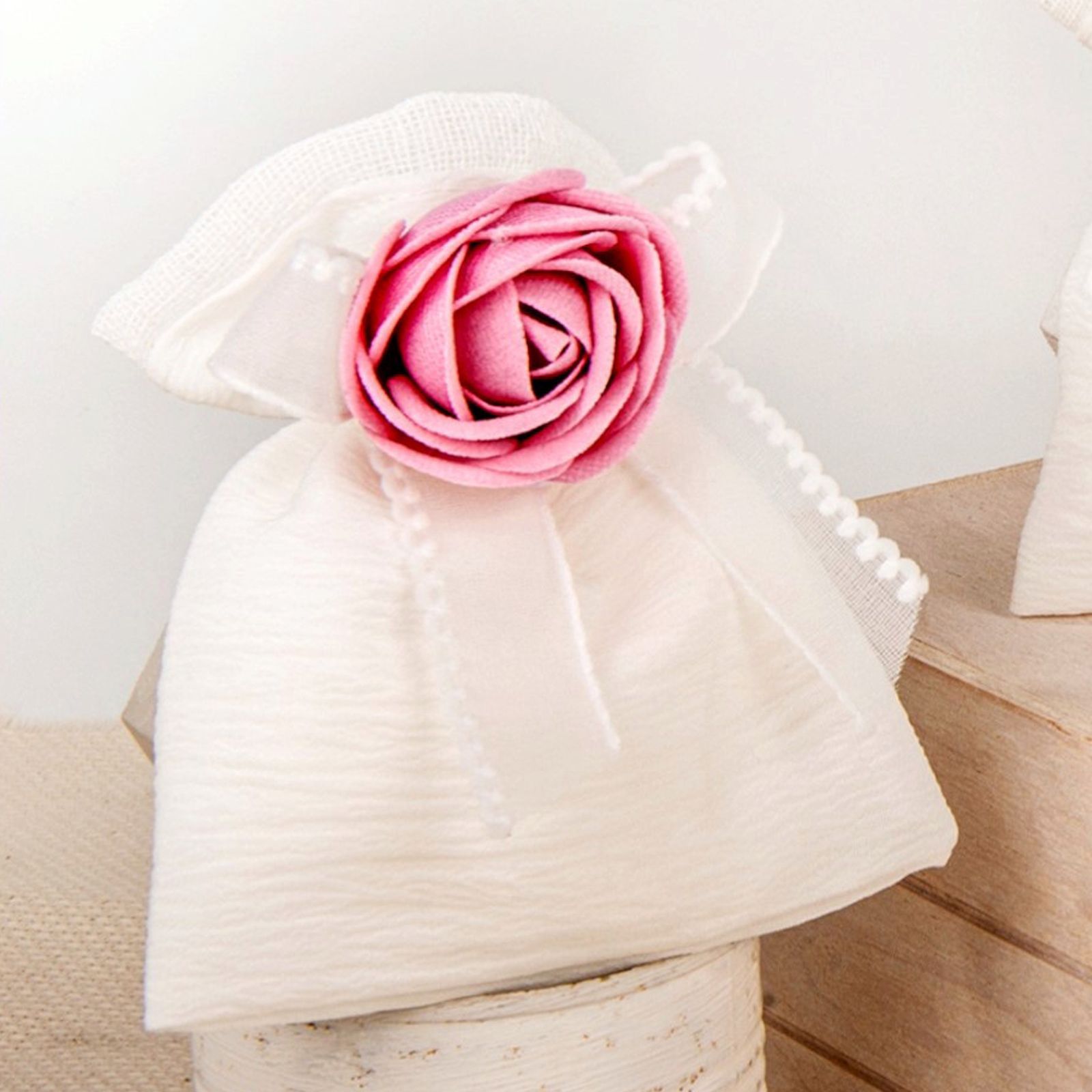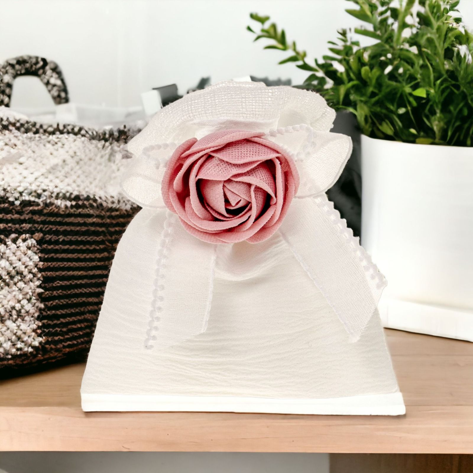 Aggiungi un tocco di grazia e raffinatezza alle tue celebrazioni speciali con il nostro Sacchetto Portaconfetti in Organza Panna. Questo esclusivo sacchetto, realizzato con organza di alta qualità, è adornato con un delicato bocciolo rosa e un grazioso fiocco, creando un'atmosfera di eleganza e romanticismo