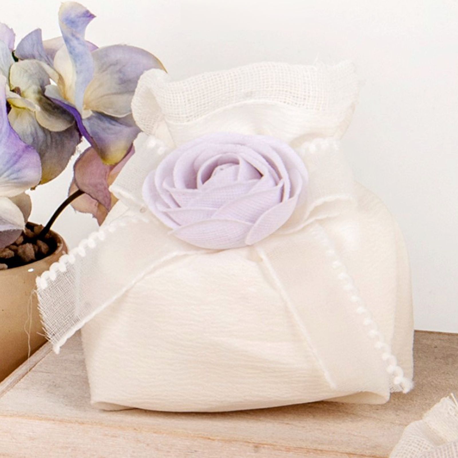 Regala un sacchetto tondo portaconfetti in organza panna con delicata rosa bianca per una confettata elegante. Questa bomboniera è originale e perfetta come dono di benvenuto a tutti gli ospiti in occasione di un matrimonio, santa cresima, prima comunione o anniversario. La bomboniera è realizzata in organza di misura cm 10 circa e colore panna e bianco.
