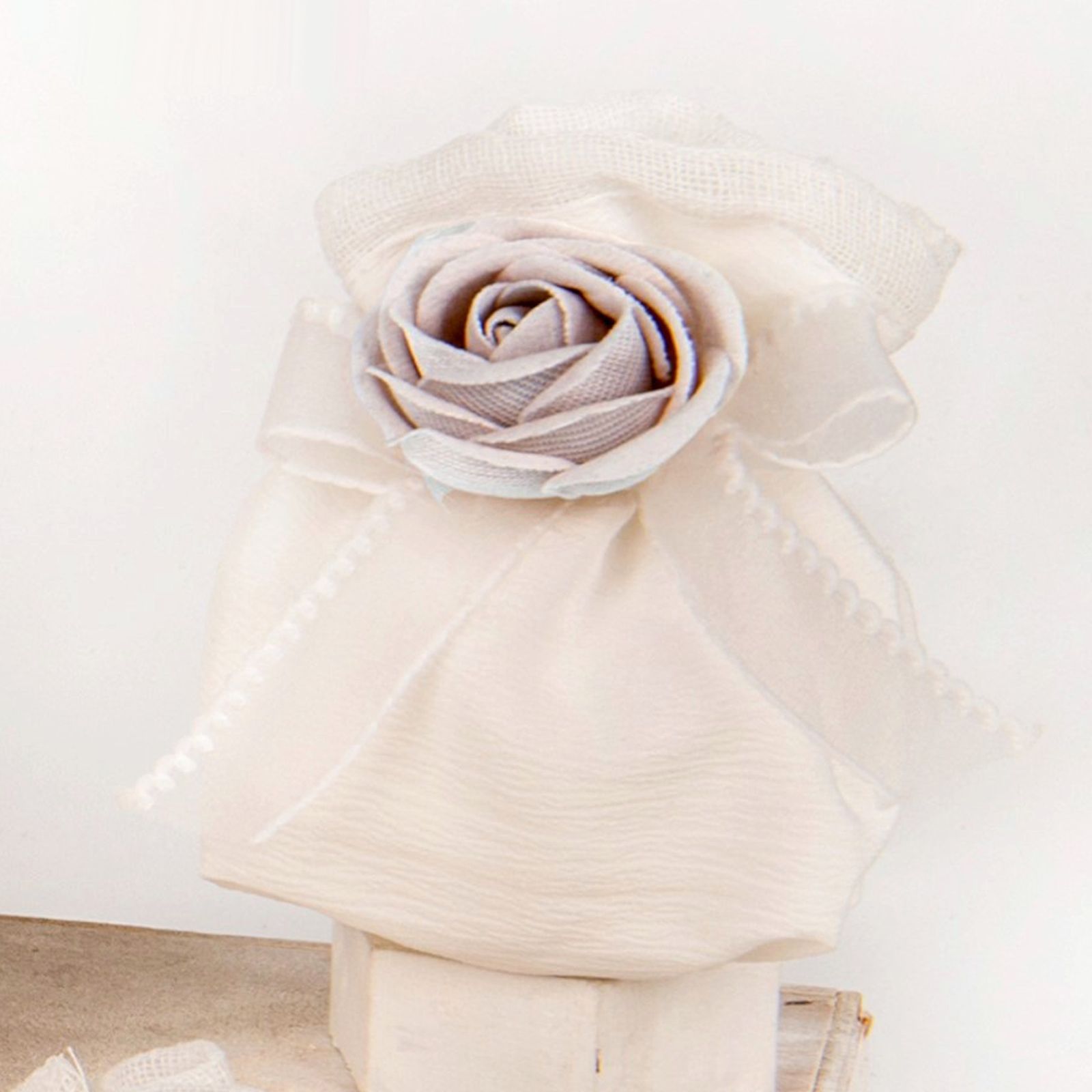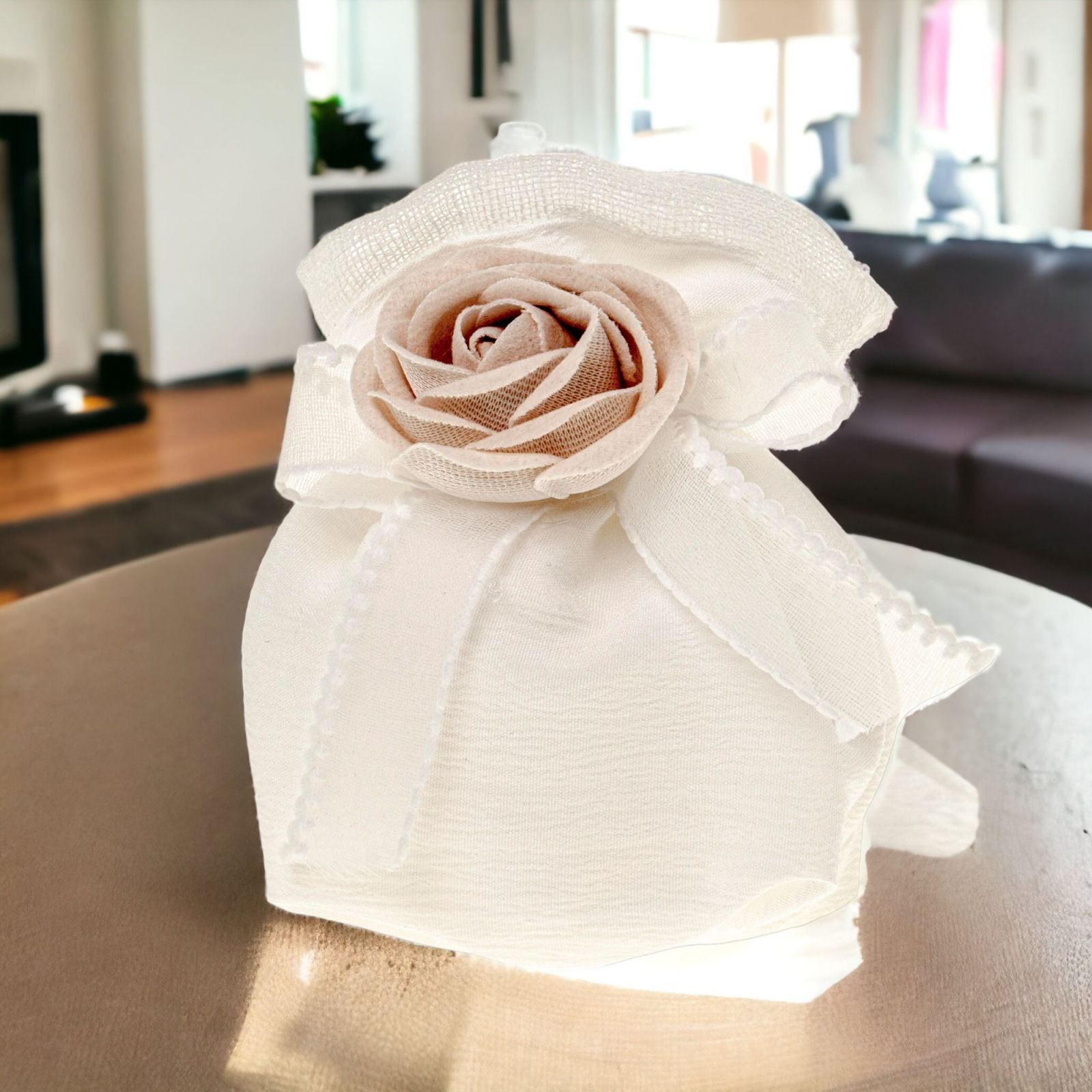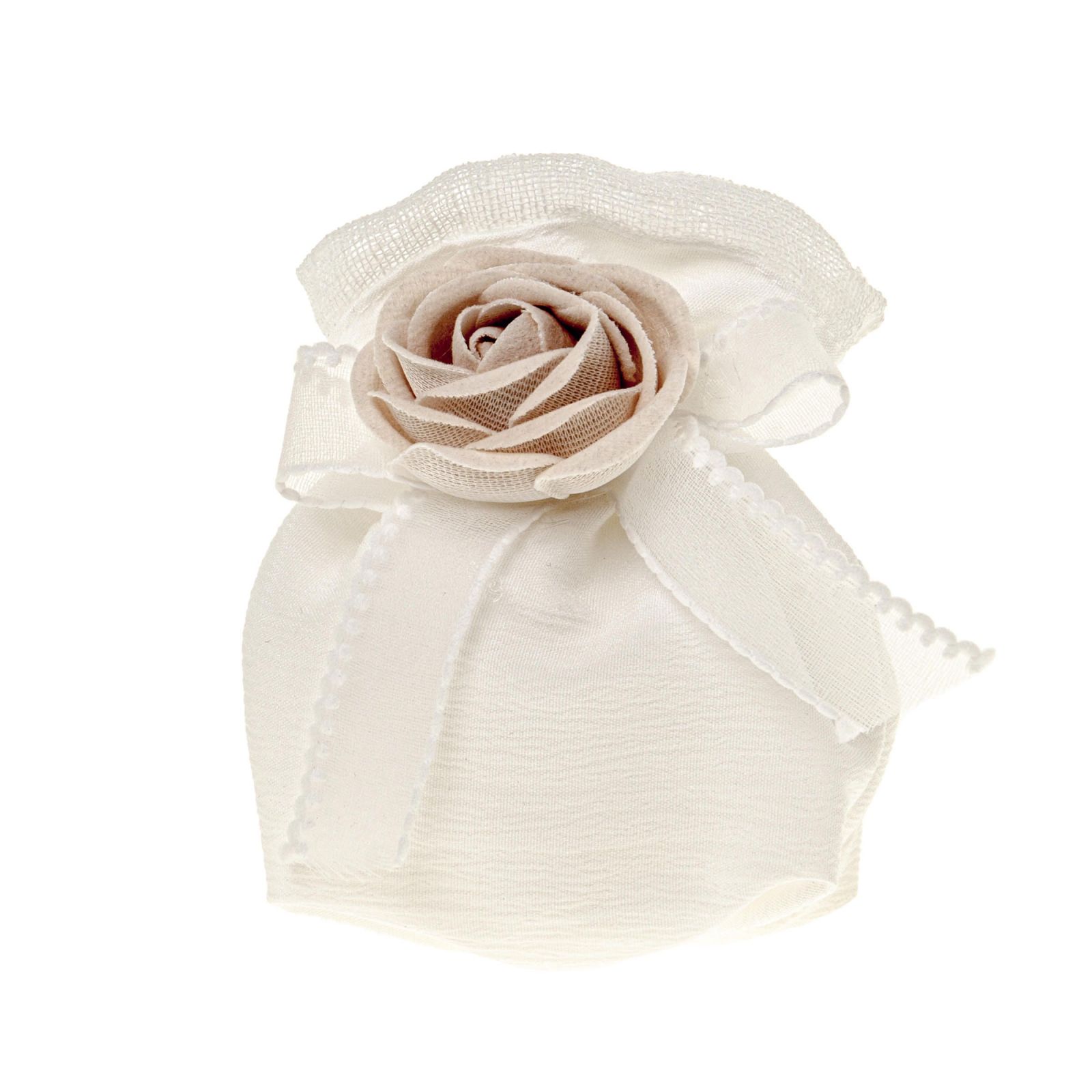 Offriamo questo sacchetto tondo portaconfetti in organza panna con rosa beige, perfetto per una confettata di stile classico ed elegante. Un portaconfetti di dimensioni di circa 10 cm, realizzato nella tonalità panna e beige, ideale per ogni tipo di evento, dalla prima comunione alla santa cresima, dal matrimonio all'anniversario.