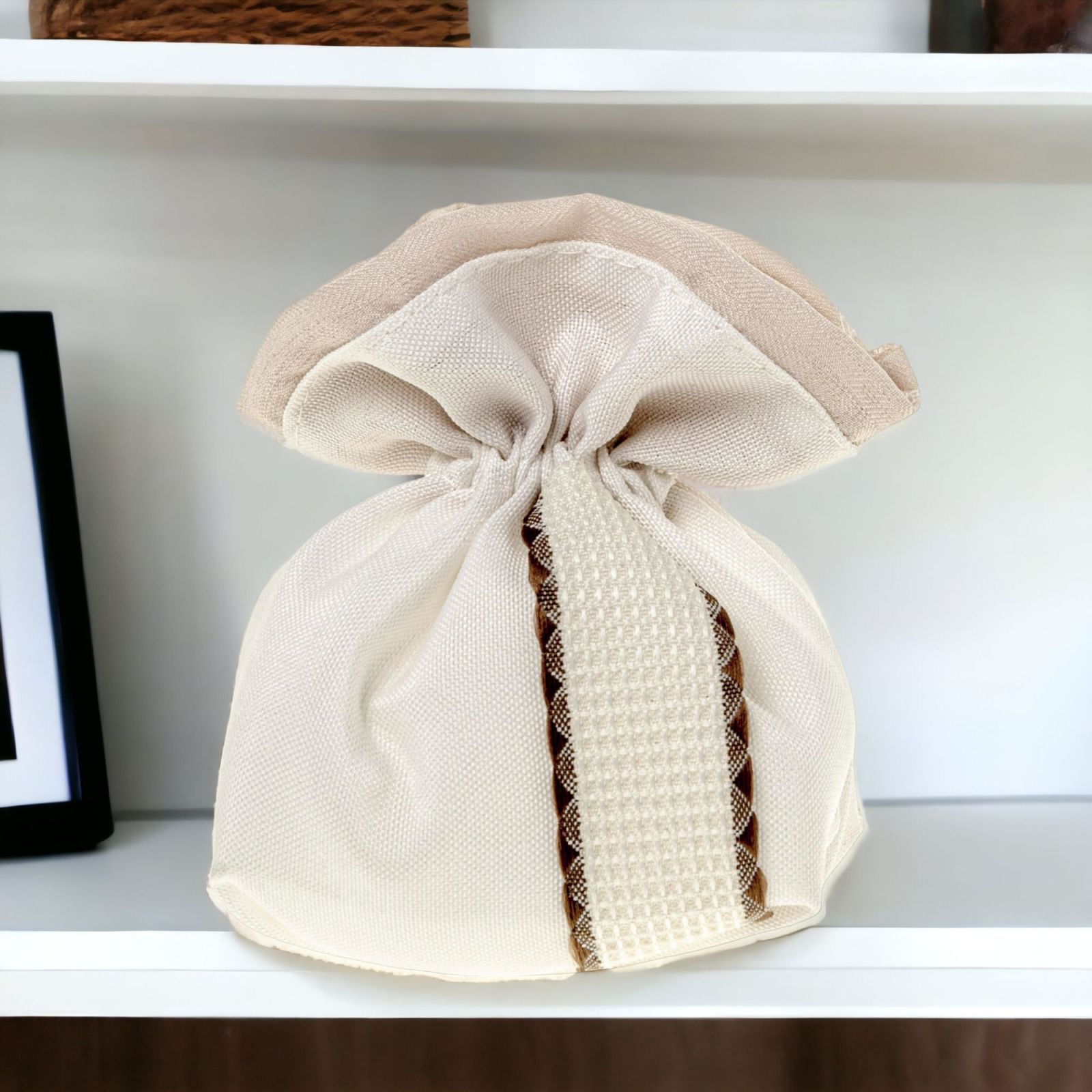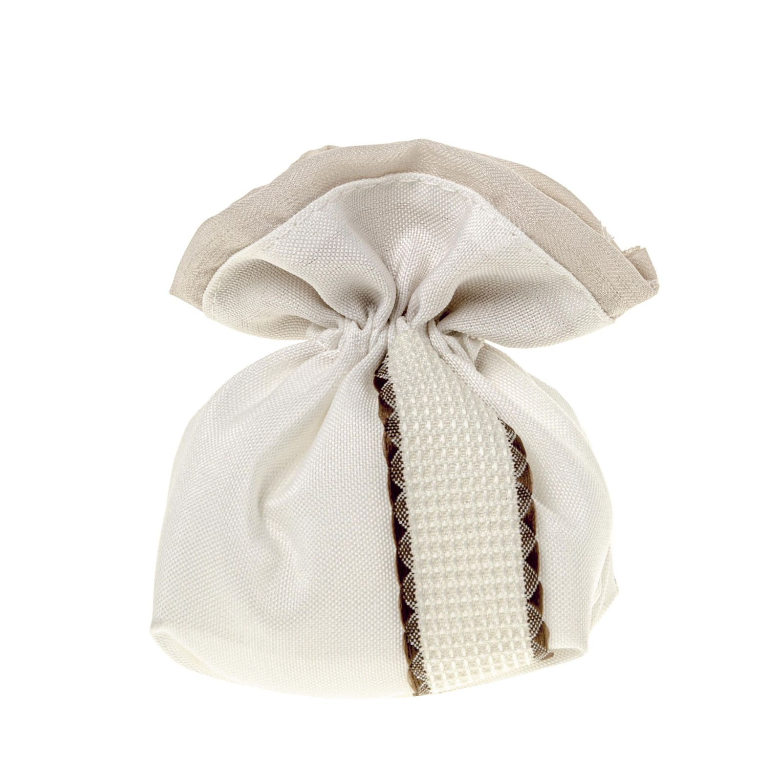 Rendi la confettata degli invitati ancora più speciale con il sacchetto panna a base quadrata con nastro decorativo centrale con bordi marrone. Realizzato in cotone resistente, questo sacchetto originale misura circa 10x12 cm ed è l’ideale per contenere i confetti di qualsiasi evento, come ad esempio la Prima Comunione, la Santa Cresima, il Matrimonio o l'Anniversario. La sua tonalità bianca lo rende adatto a qualsiasi occasione, mentre il suo design elegante lo rende un portaconfetti ideale per rendere unica la confettata dei tuoi invitati.