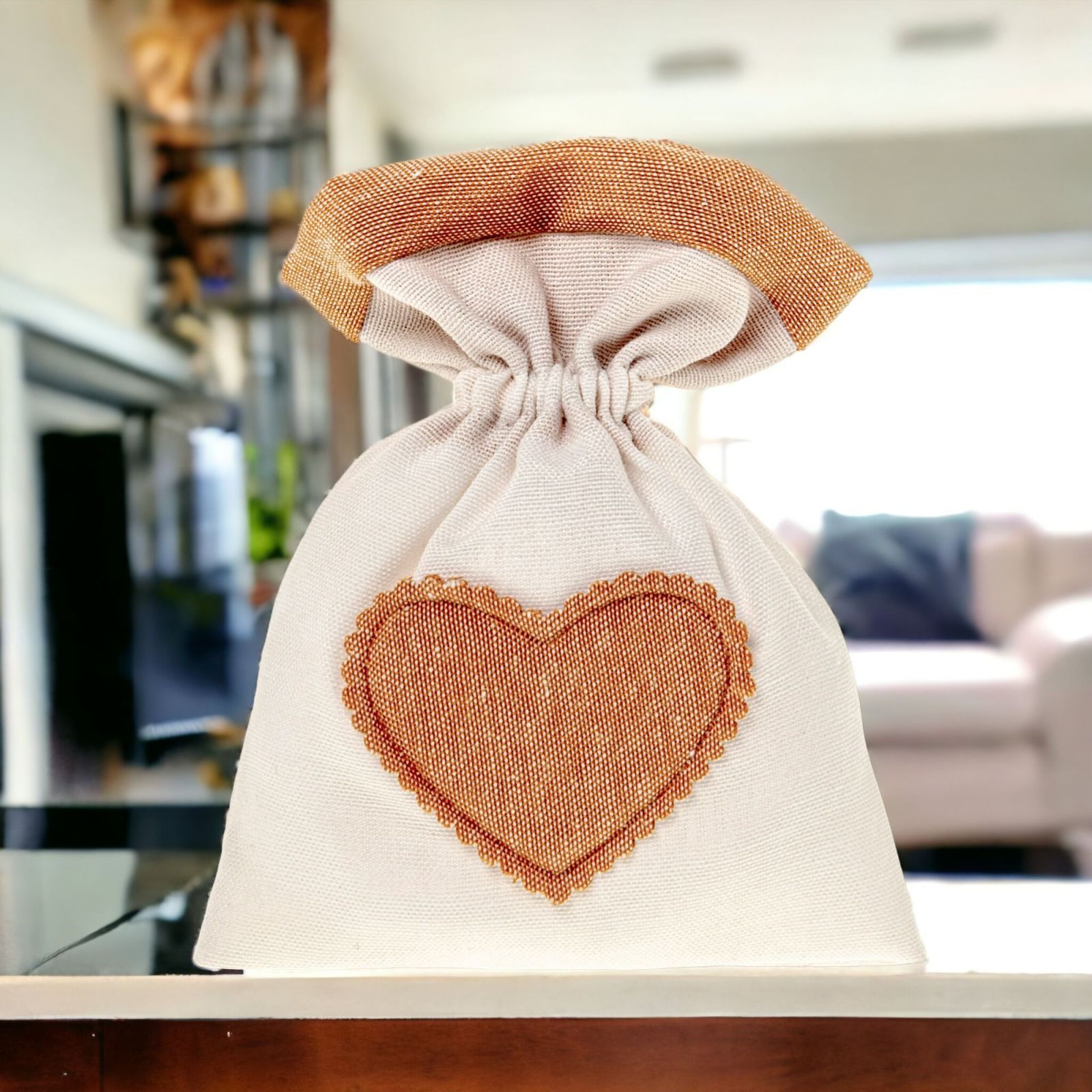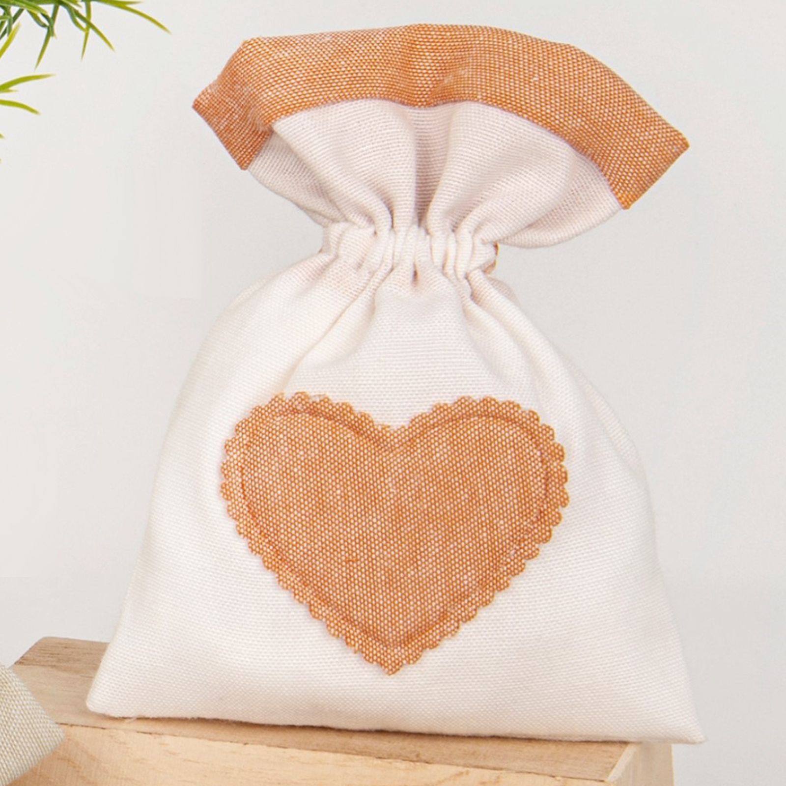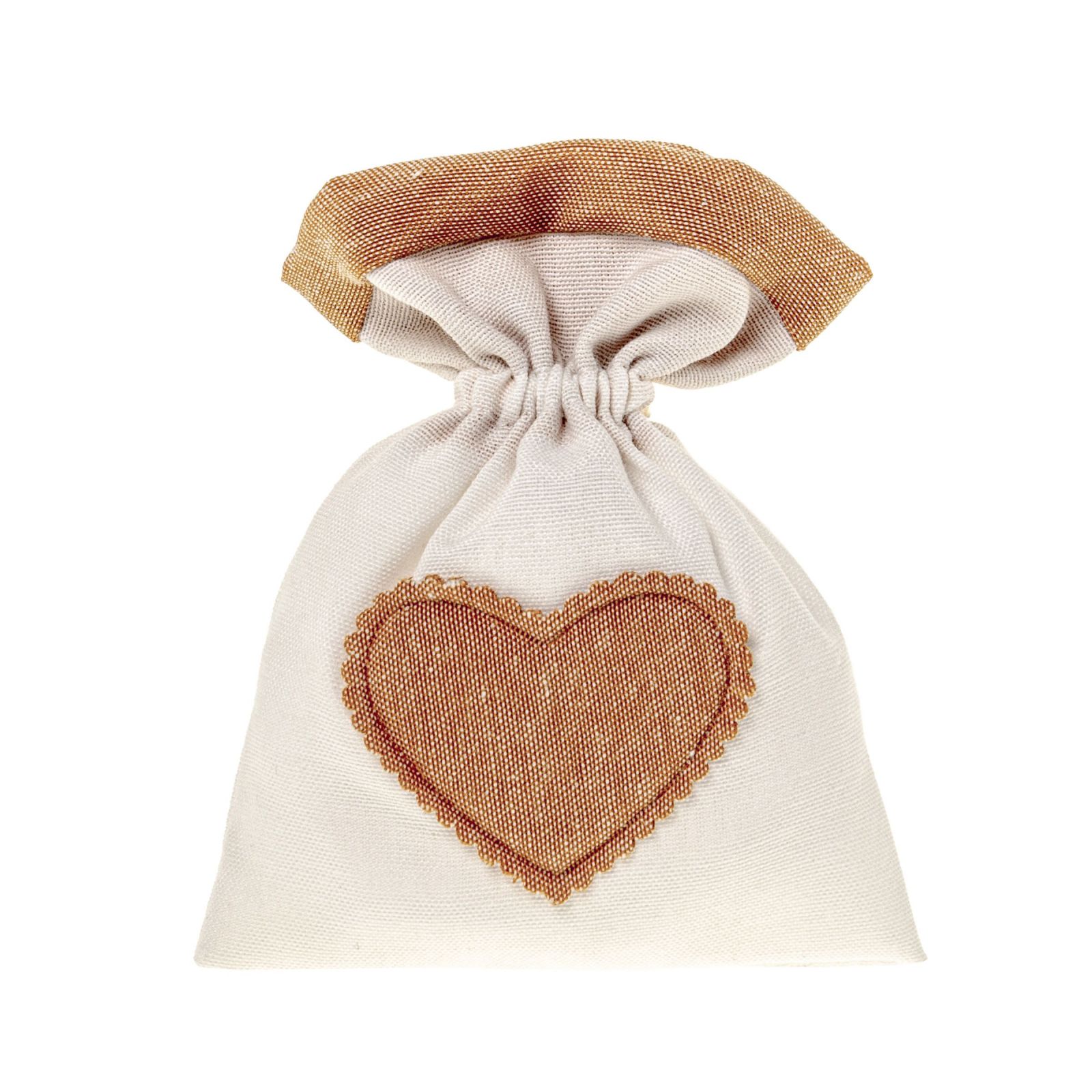 Celebra ogni momento speciale con il nostro Sacchetto Porta Confetti bicolore panna con una deliziosa parte superiore e cuoricino centrale arancio di dimensione 10x13 circa con comodi tiranti.
