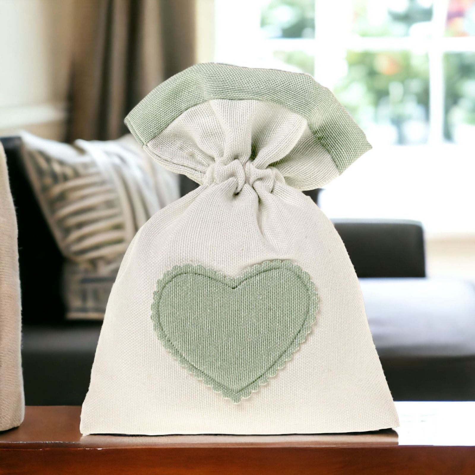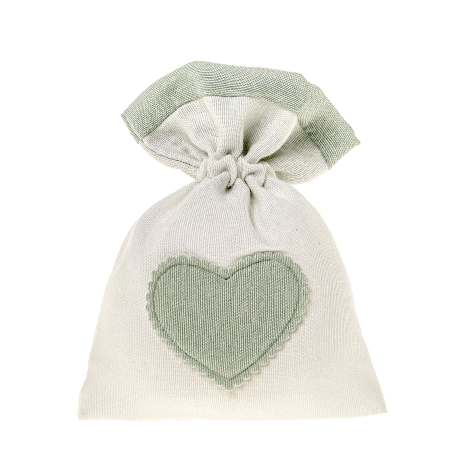 Il nostro Sacchetto Porta Confetti bicolore panna, con una parte superiore decorata da un cuoricino centrale verdino, è l'accessorio perfetto per festeggiare la tua prima comunione, santa cresima, promessa di matrimonio, nozze, anniversario. Le sue dimensioni sono 10x13 circa ed è completato da comodi tiranti.